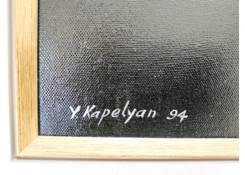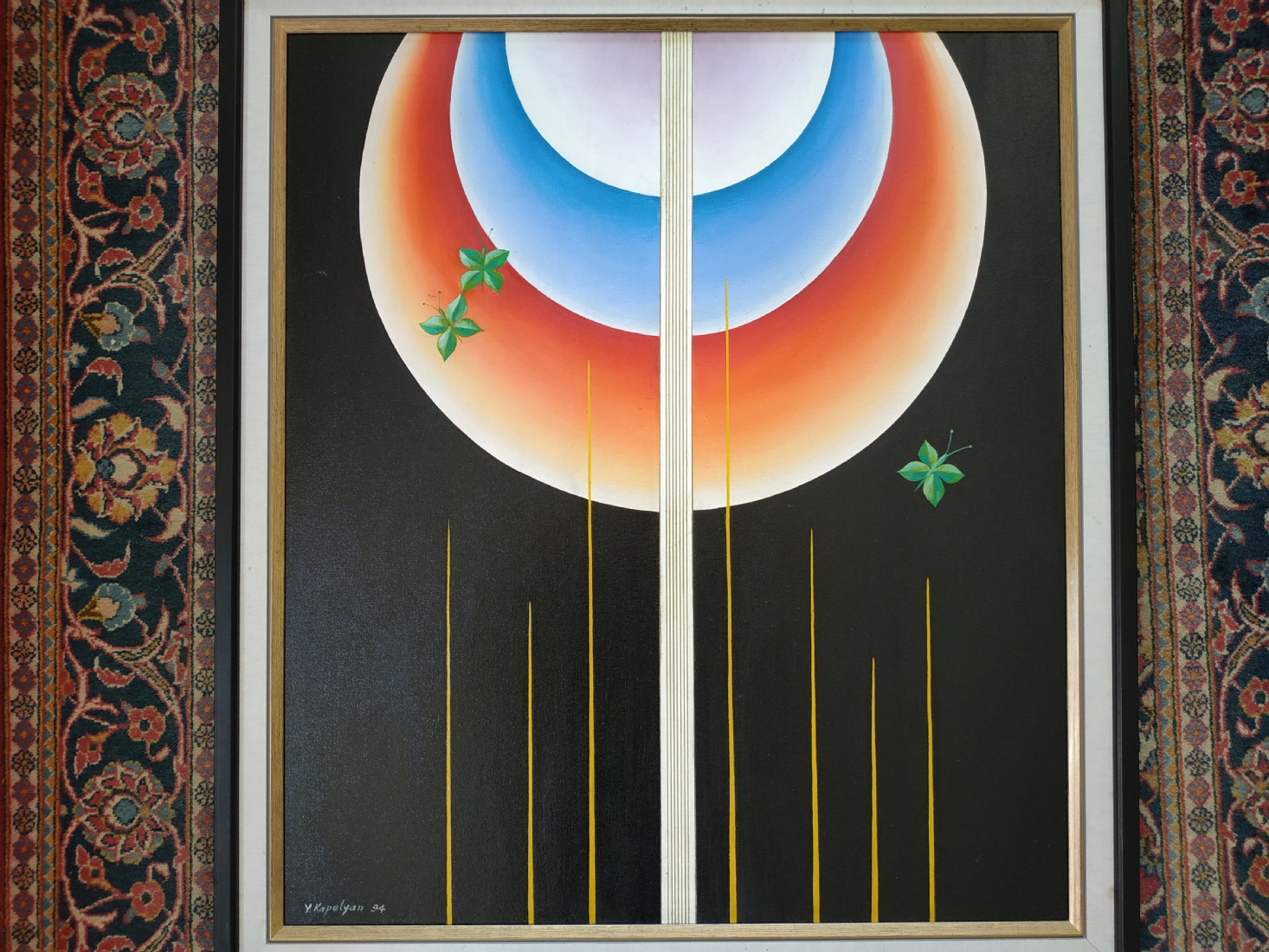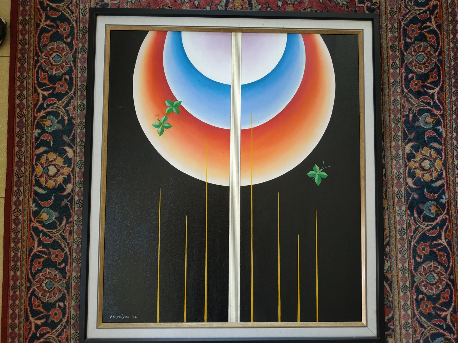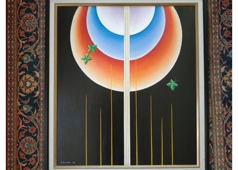 יוסף קפליאן (J. Kapelyan) - 'פרפרים צמחיים תחת זריחה פנטסטית', שמן על בד, חתום ומתוארך 1994, מידות: 80X70 ס"מ.