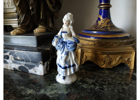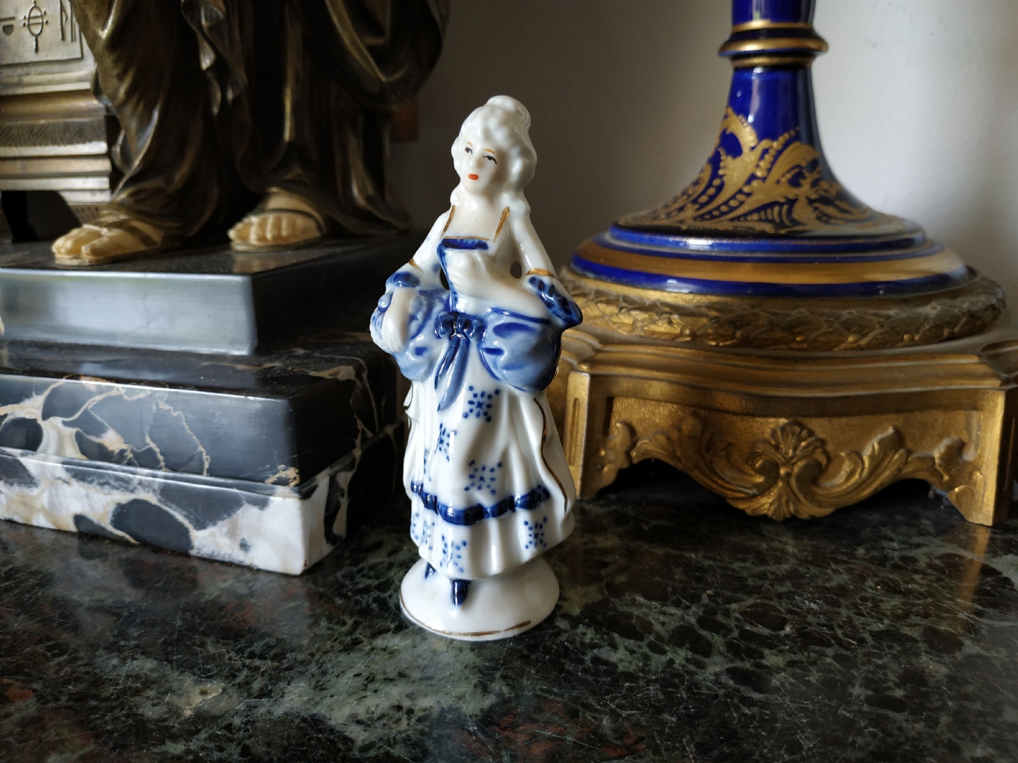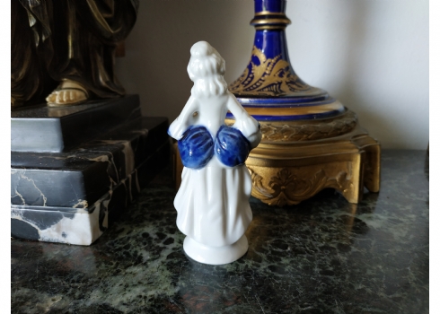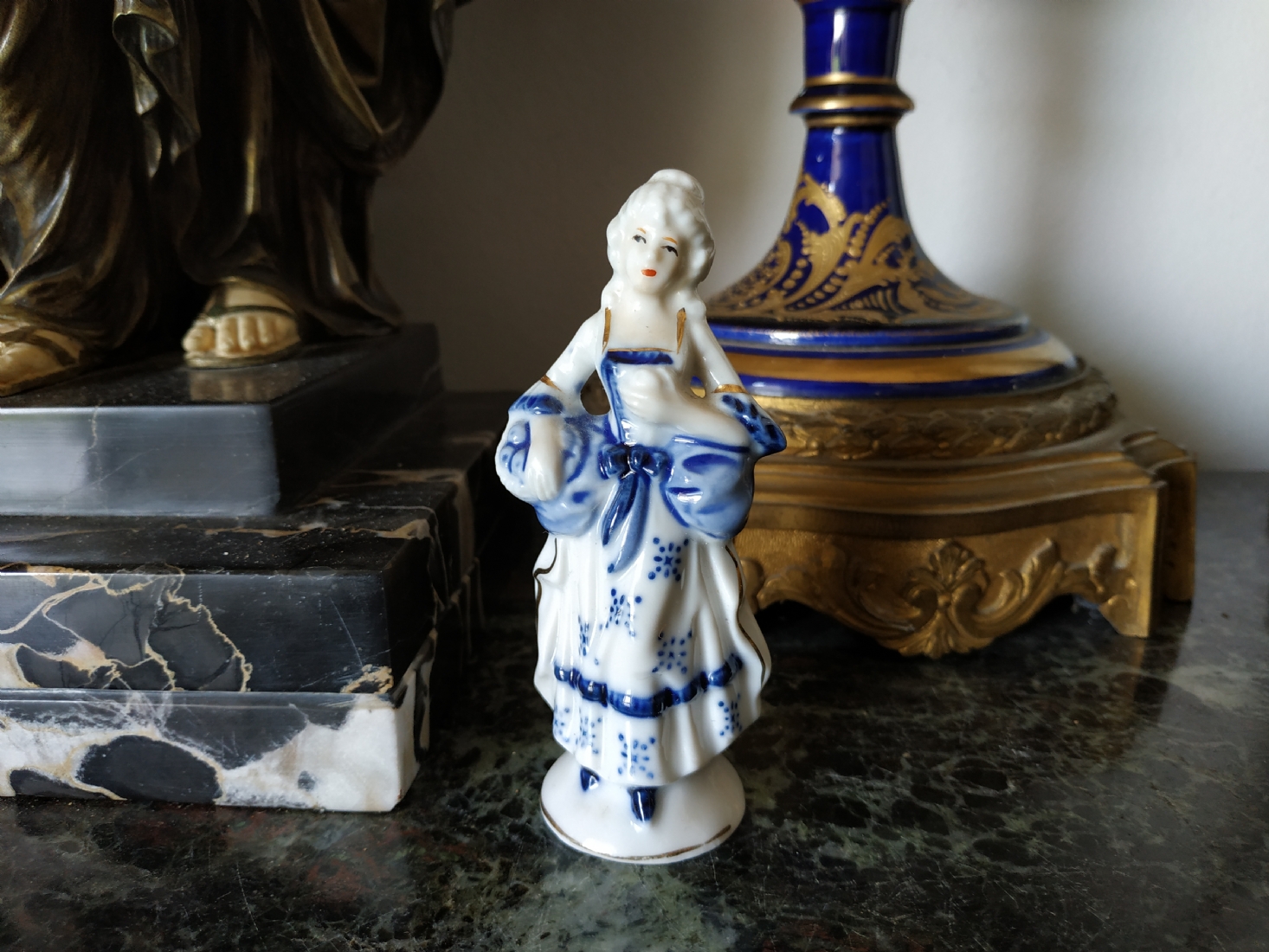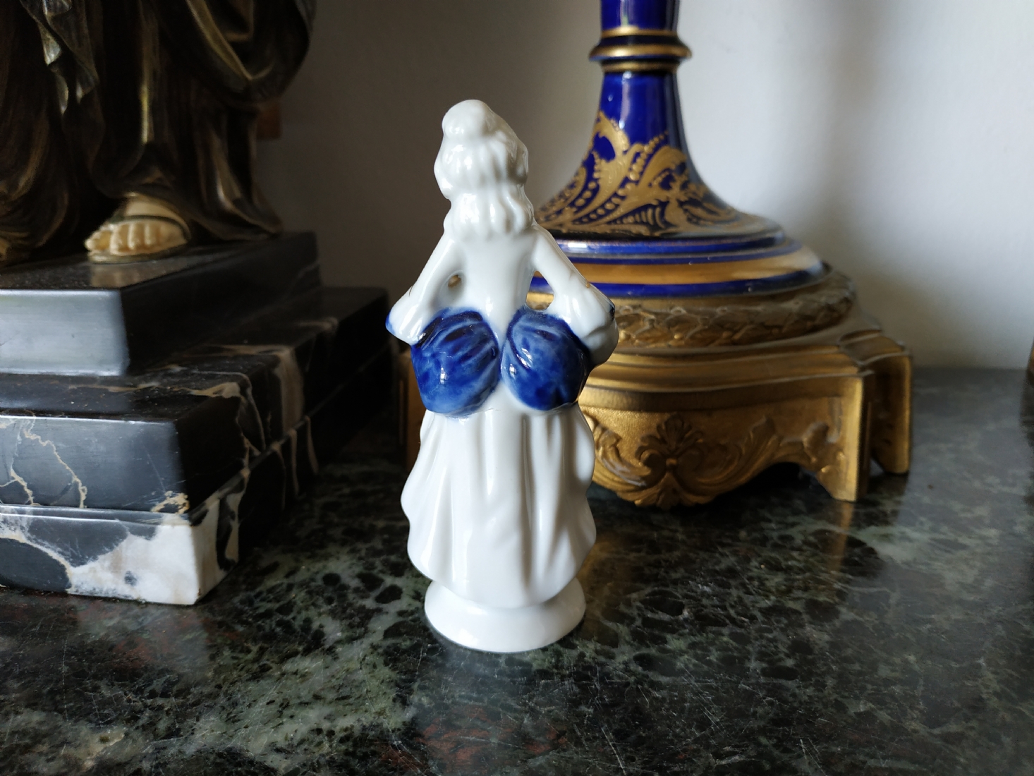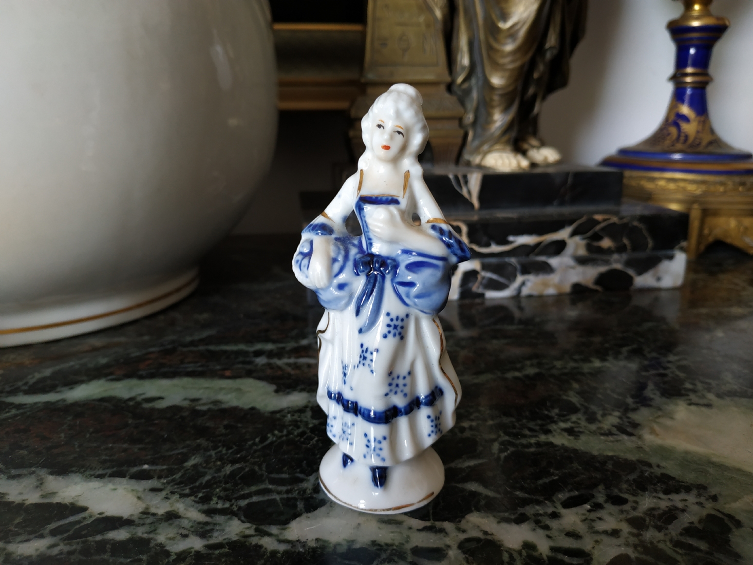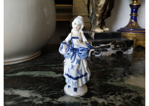 פסלון פורצלן מניאטורי בדמות אצילה מעוטר בצביעת יד בכחול קובלט, לא חתום, גובה: 10 ס"מ.