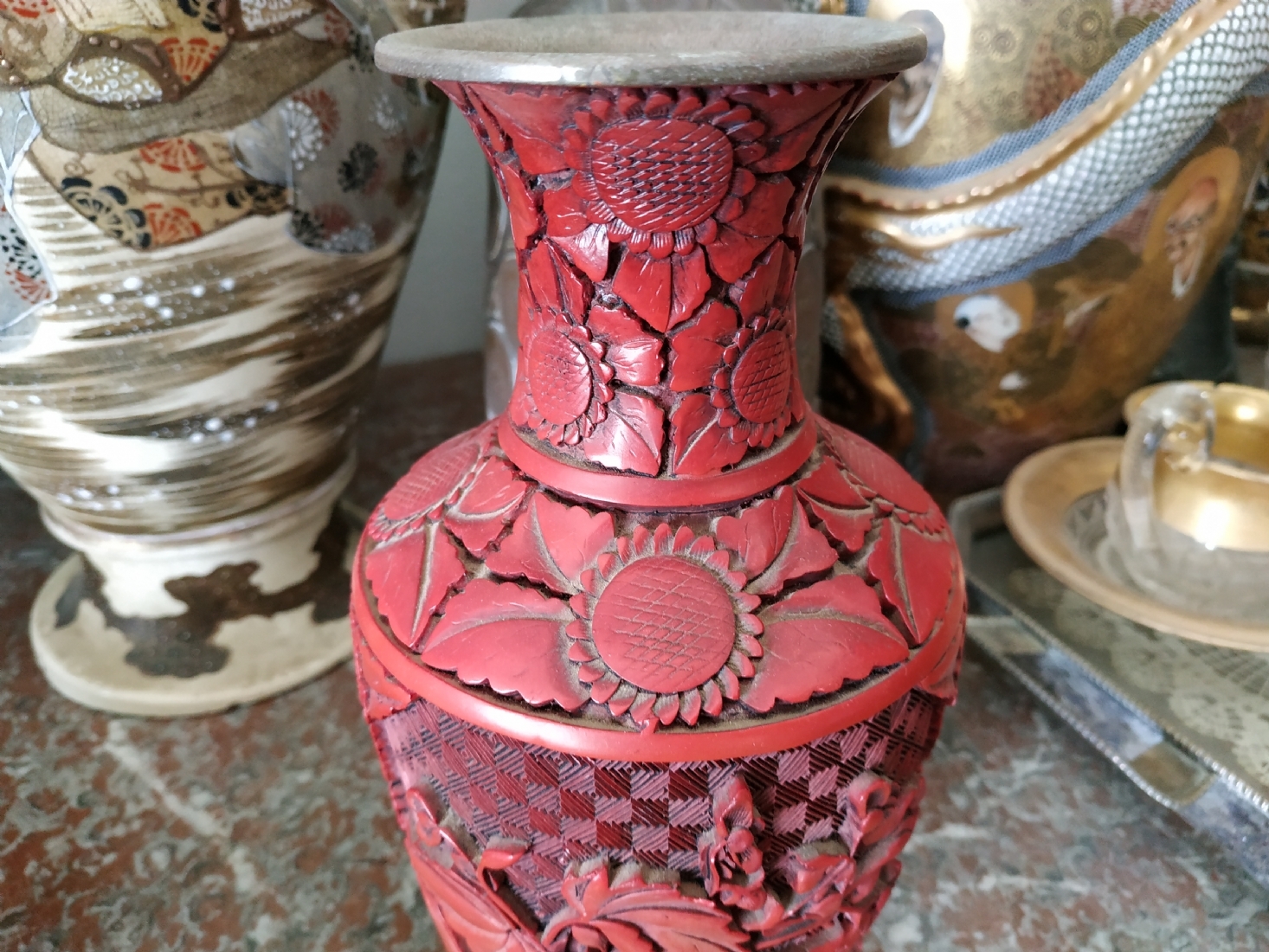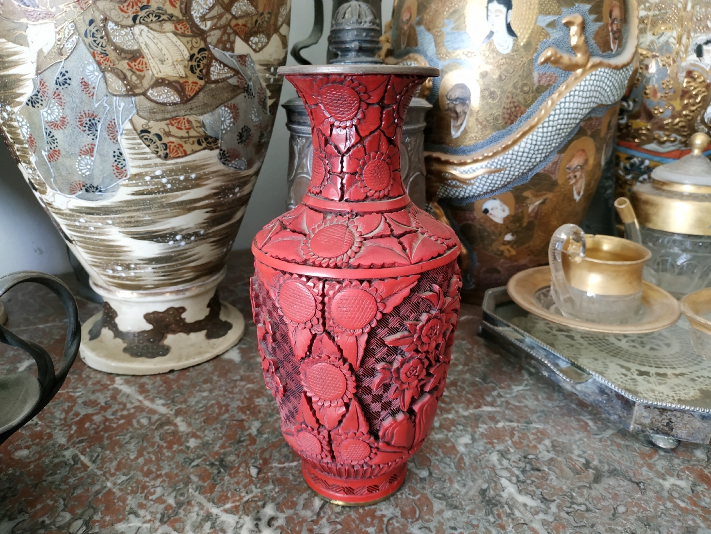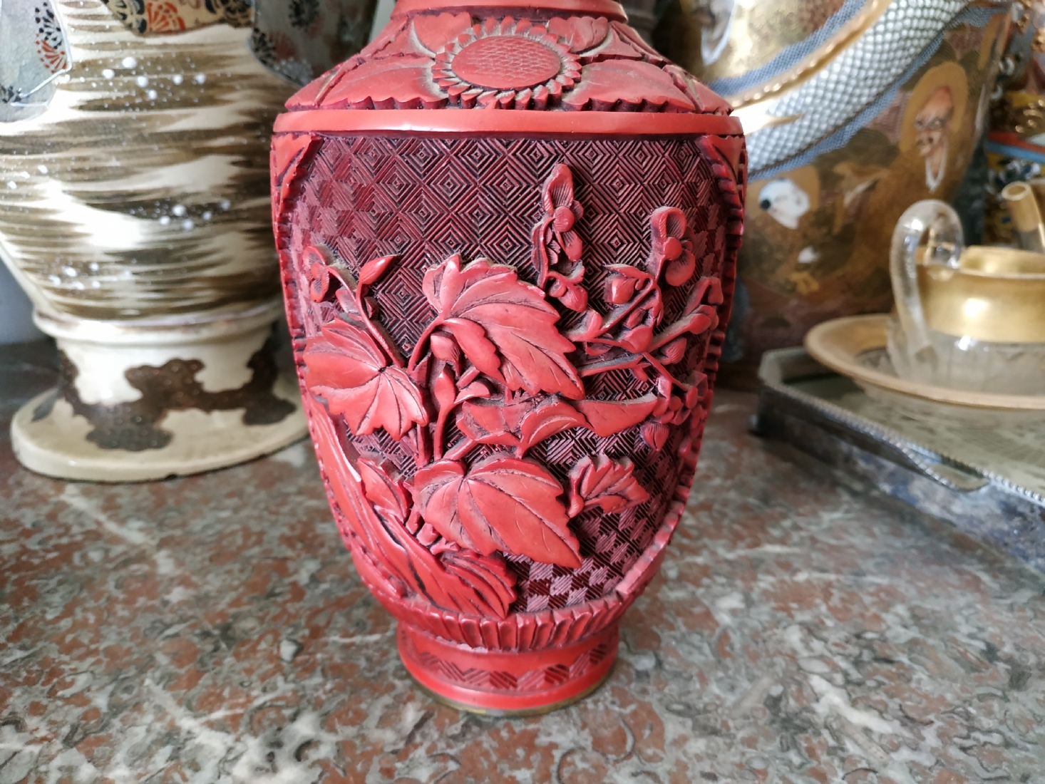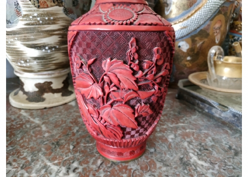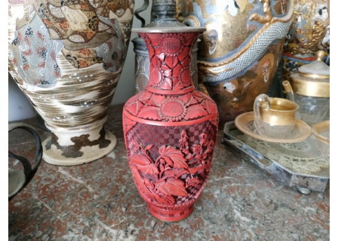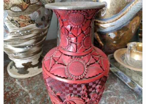 אגרטל לכה סיני ישן, עשוי פליז, מעוטר לכה אדומה מסוג 'Red Cinnabar', גובה: 23.5 ס"מ.