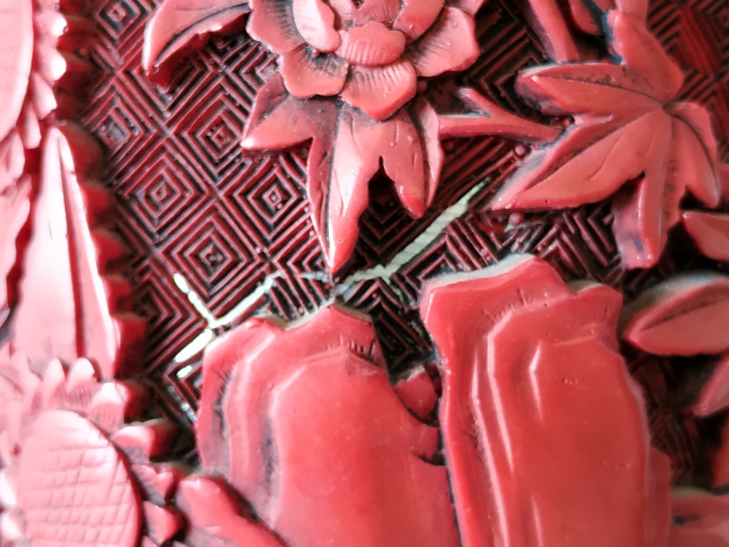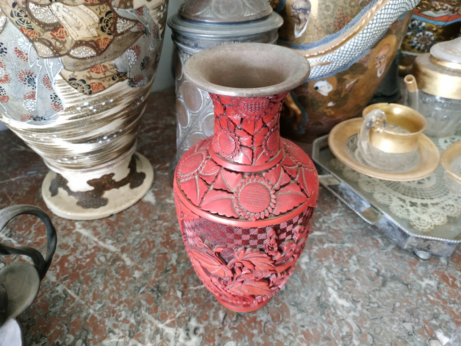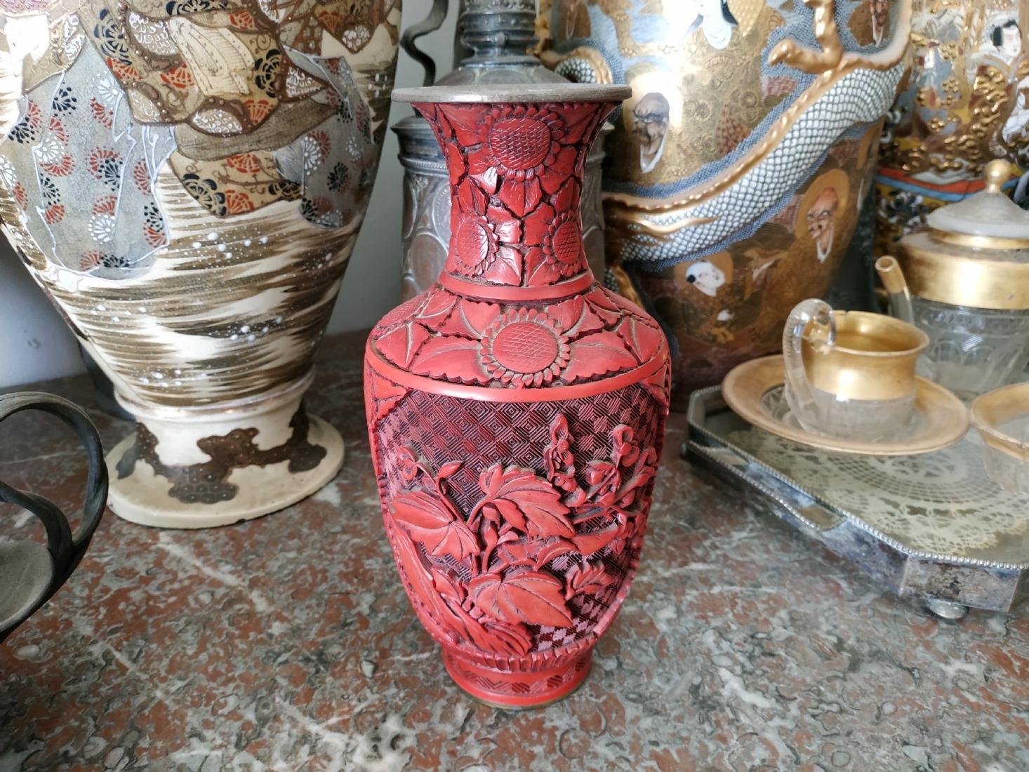 אגרטל לכה סיני ישן, עשוי פליז, מעוטר לכה אדומה מסוג 'Red Cinnabar', גובה: 23.5 ס"מ.