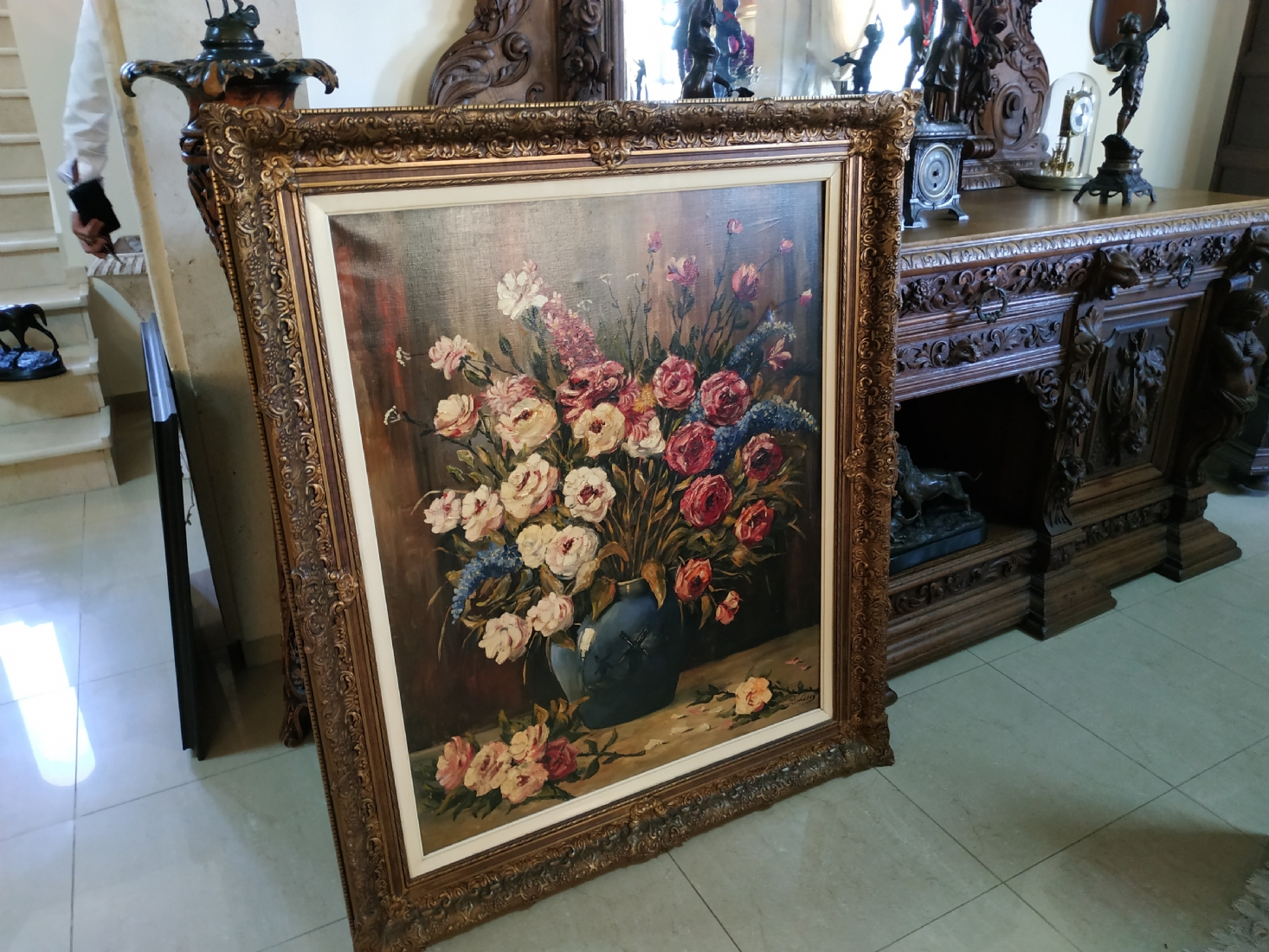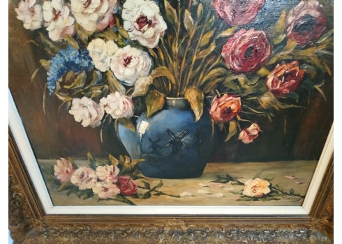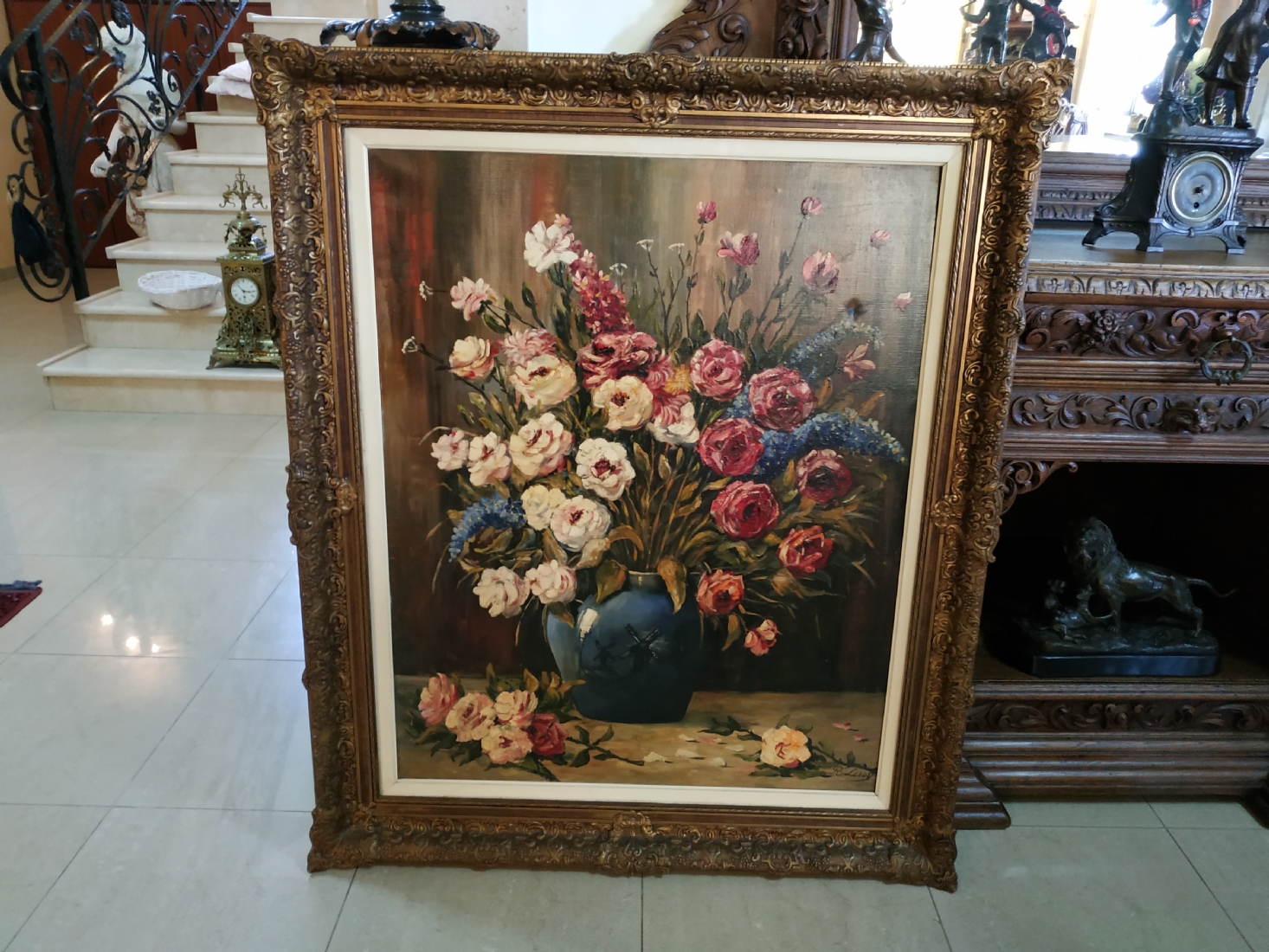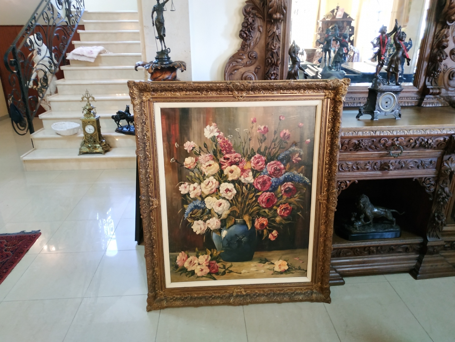 'פרחים בכד כחול', ציור ישן וגדול, שמן על בד, חתום, מידות: 100X80 ס"מ. (הפריט הושאר בבית בדלית אל כרמל, הזוכה בו מתחייב לפנותו מהבית תוך שבוע מיום המכירה הפומבית בתיאום עם בעל הבית).