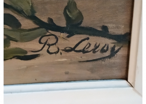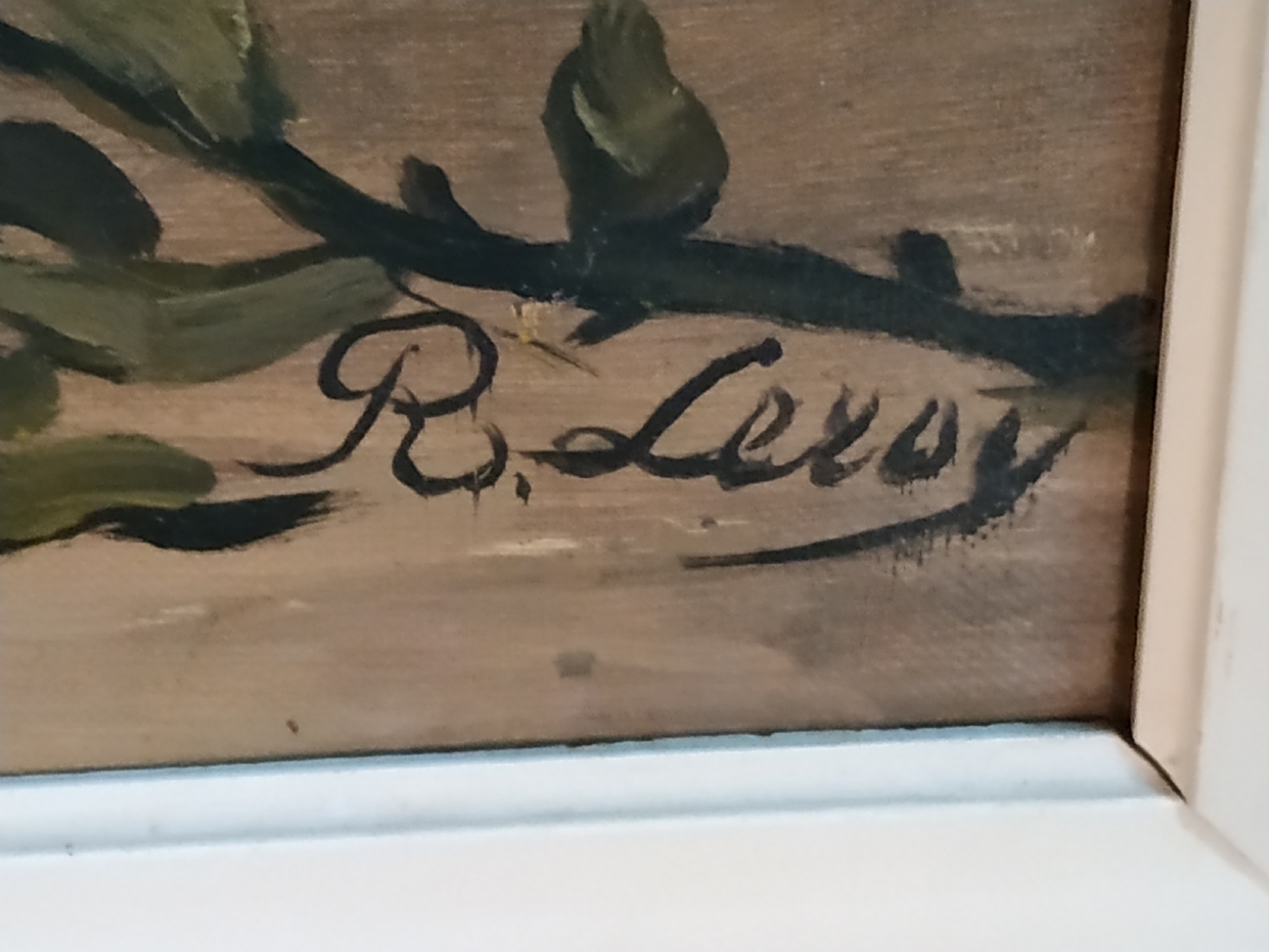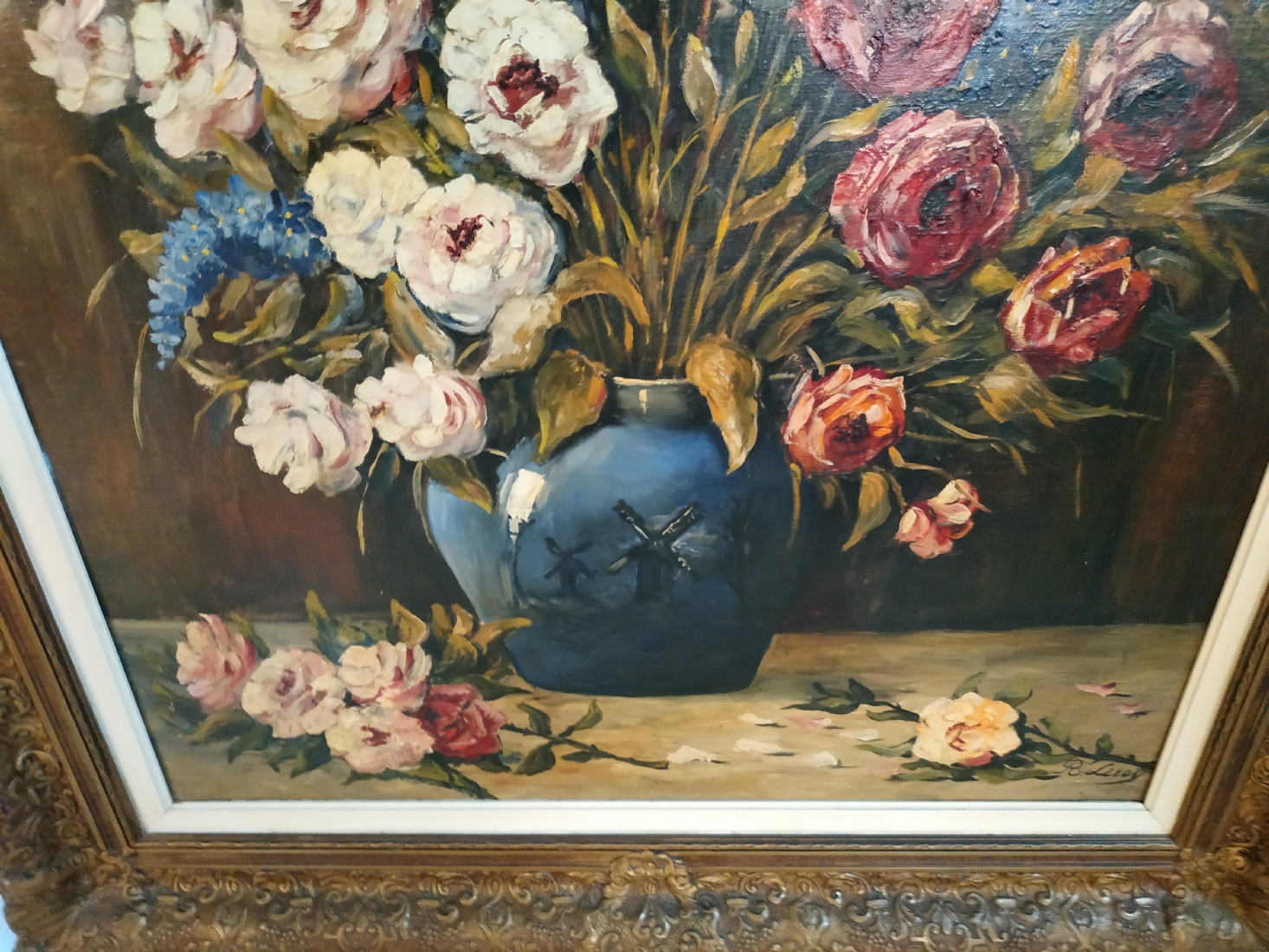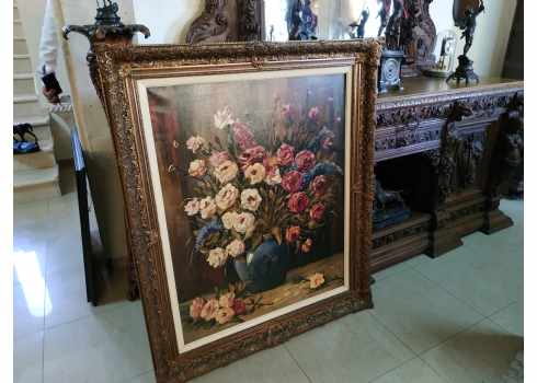 'פרחים בכד כחול', ציור ישן וגדול, שמן על בד, חתום, מידות: 100X80 ס"מ. (הפריט הושאר בבית בדלית אל כרמל, הזוכה בו מתחייב לפנותו מהבית תוך שבוע מיום המכירה הפומבית בתיאום עם בעל הבית).