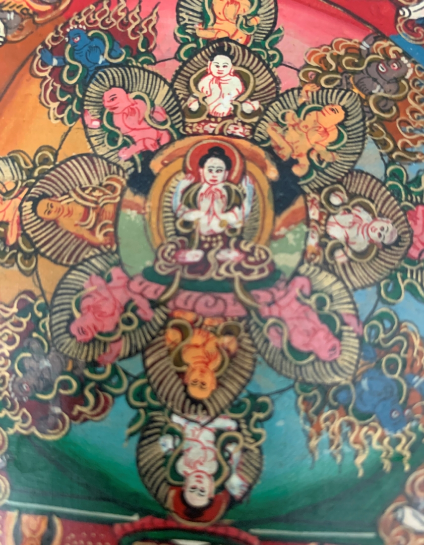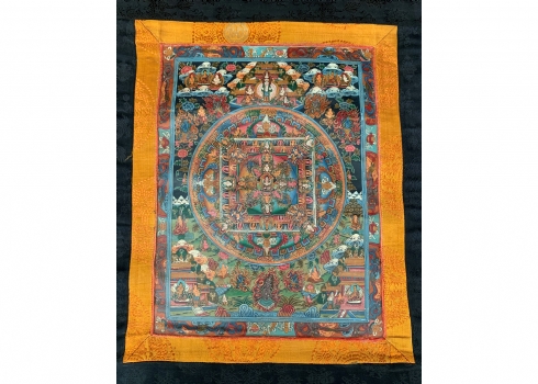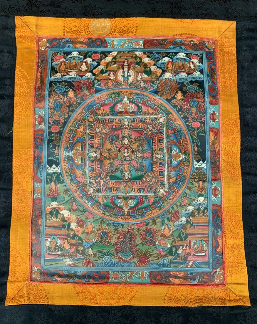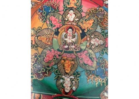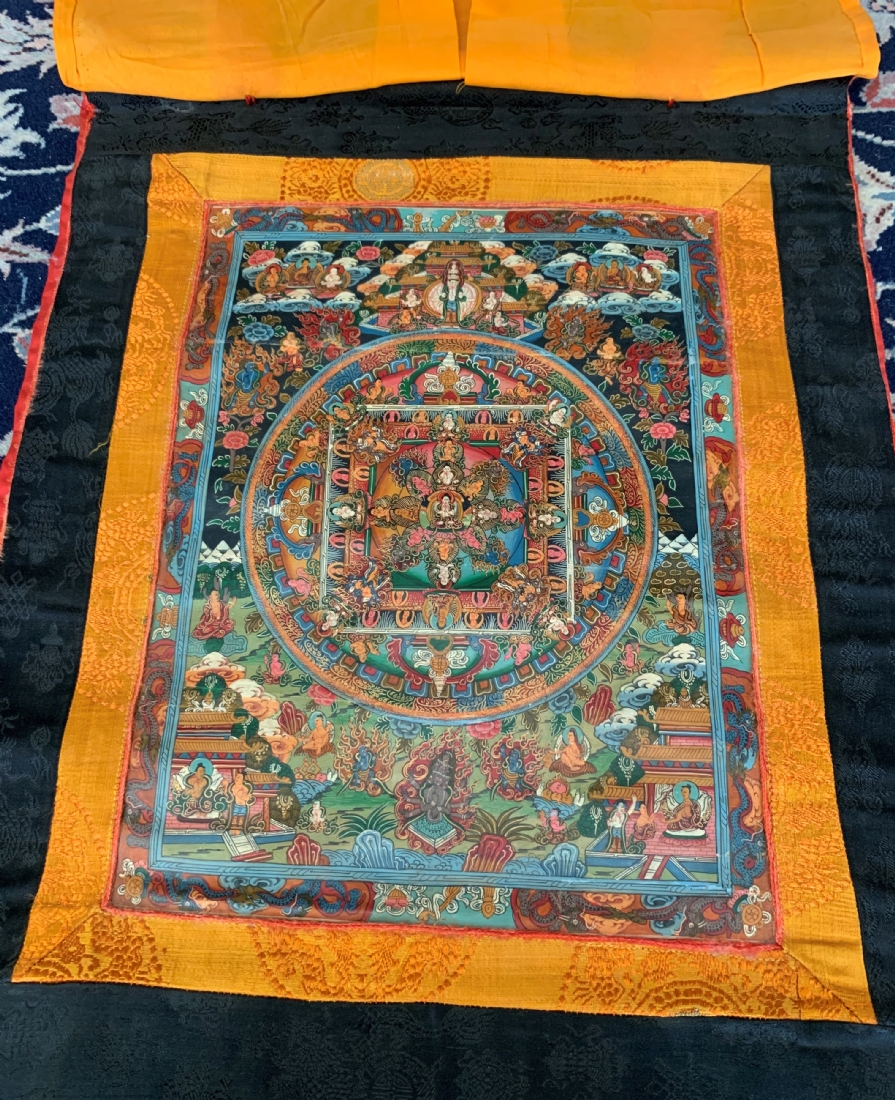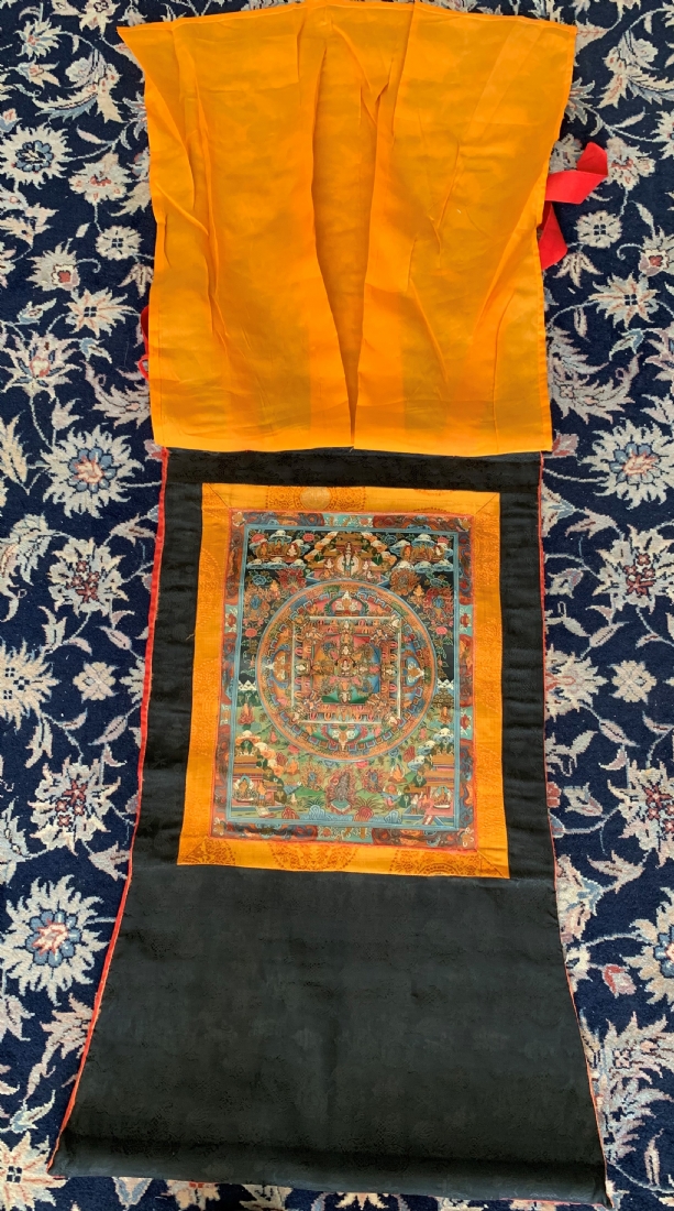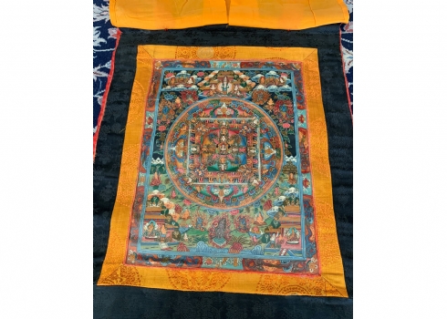 טנקה (Thangka) מצוירת ביד, לתליה על קיר, מוצמדת לבד, מידות: 72X51 ס"מ.