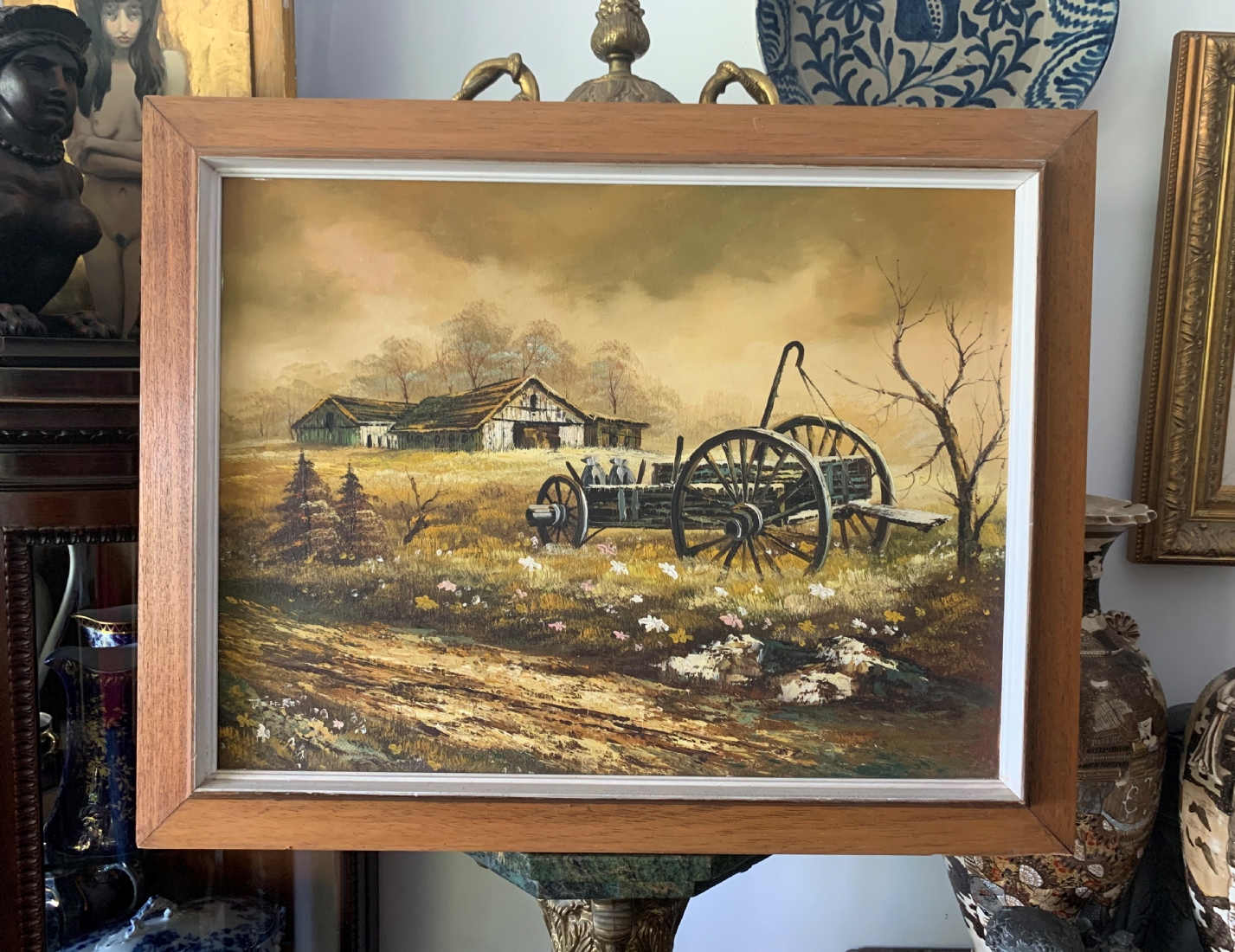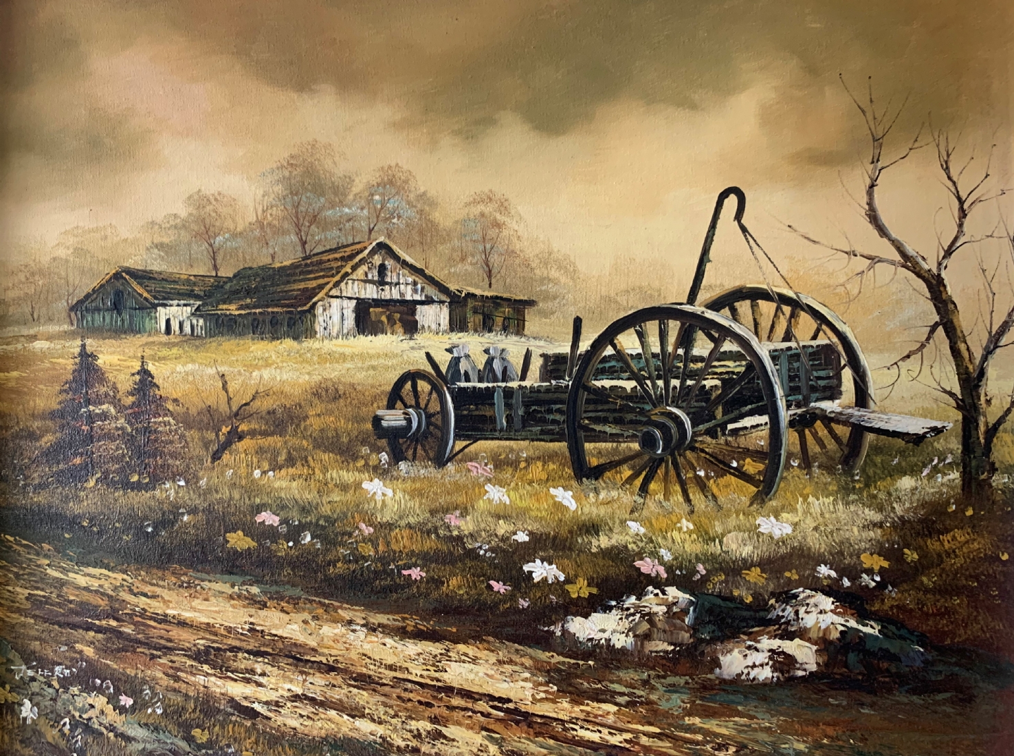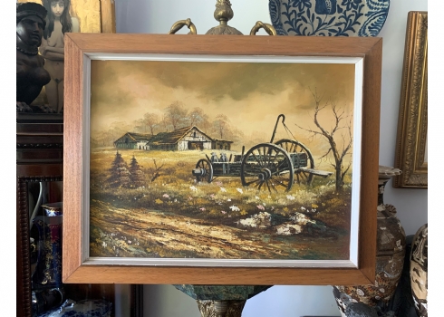 'הכרכרה בחווה אל האלמנה ססיל גומז' - ציור גדול וישן, שמן על בד מוצמד ללוח, לא חתום, מידות: 45X60 ס"מ.