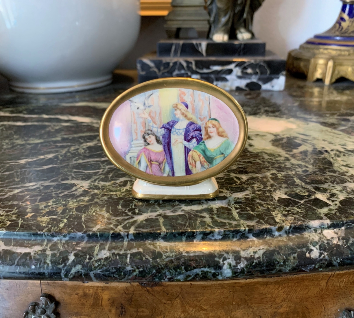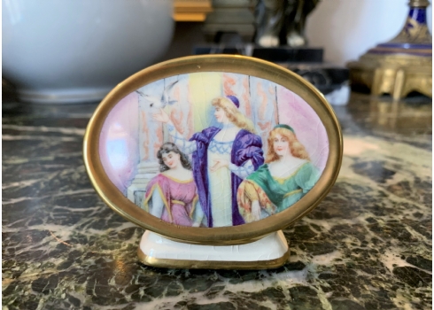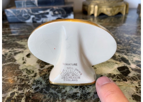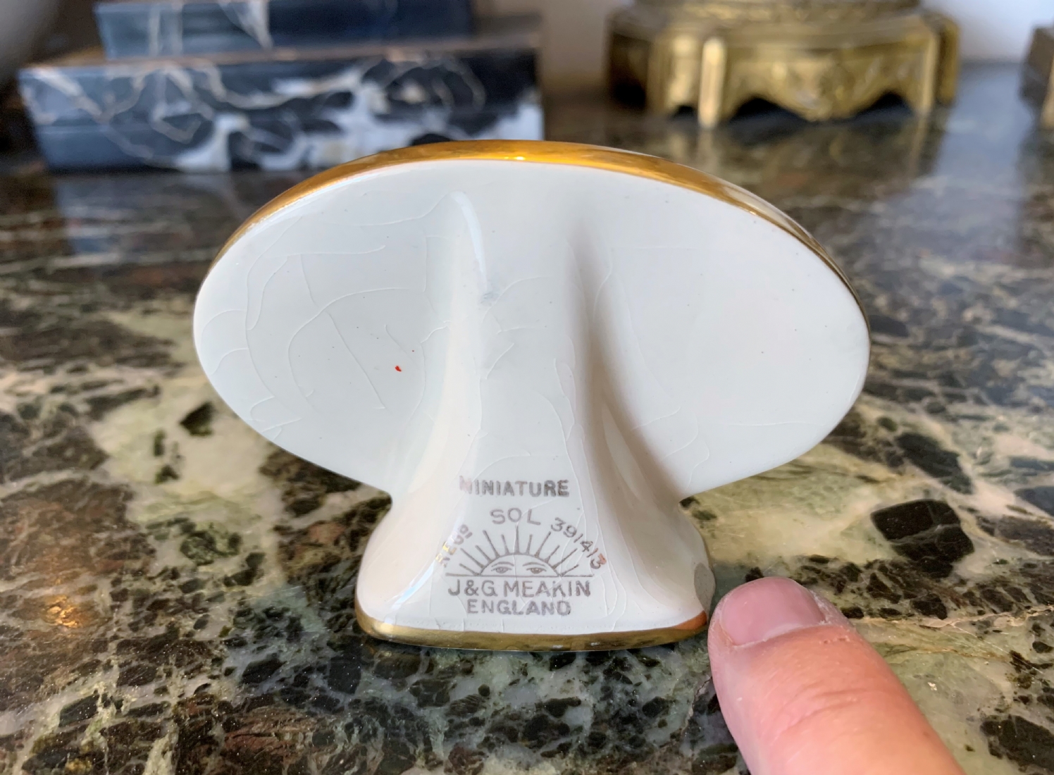 לאספני מניאטורות - קישוט פורצלן מניאטורי אנגלי, מעוטר וחתום, (פגם לפינה האחורית של הבסיס - מצולם), גובה: 6.5 ס"מ, אורך החזית: 8.5 ס"מ.