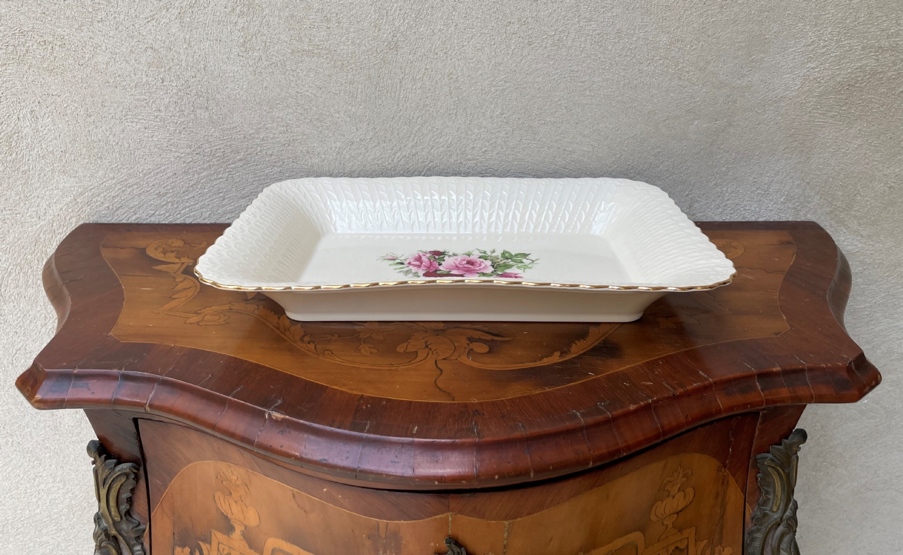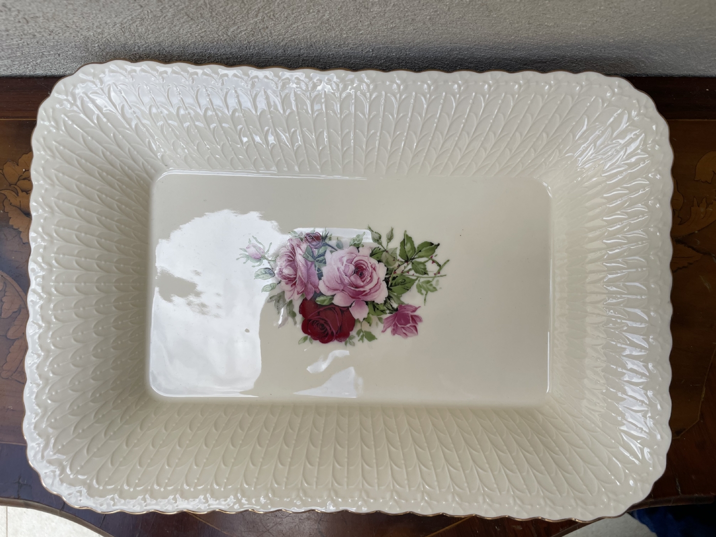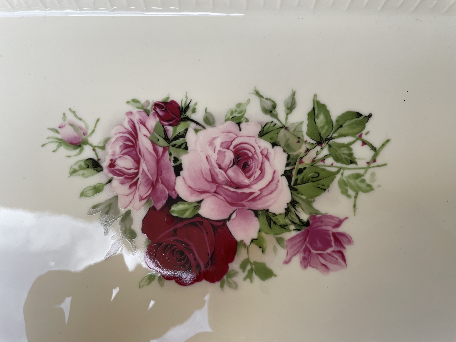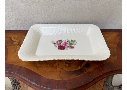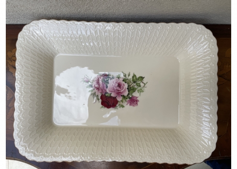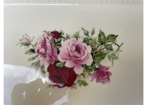 מגש חרסינה מלבני להגשה וכיבוד מעוטר בהדפס של שושנים פורחות וחתום, מידות: 25X36 ס"מ.