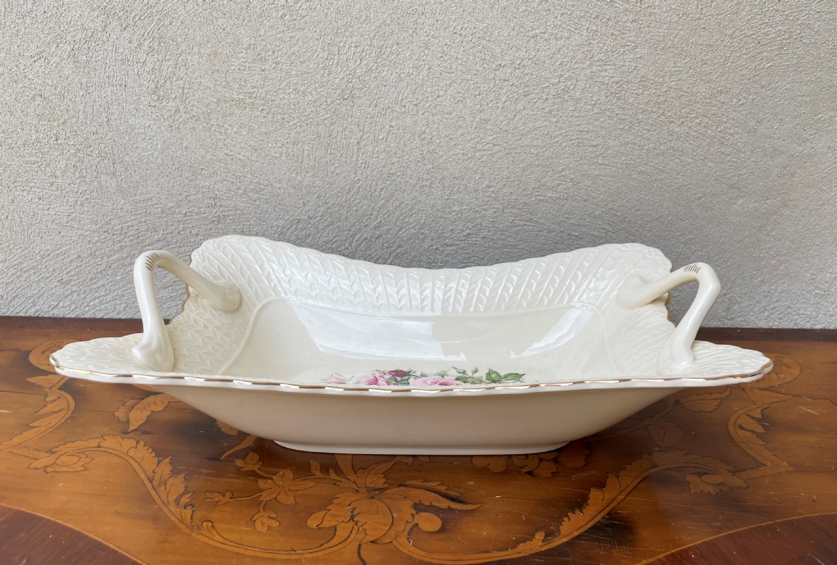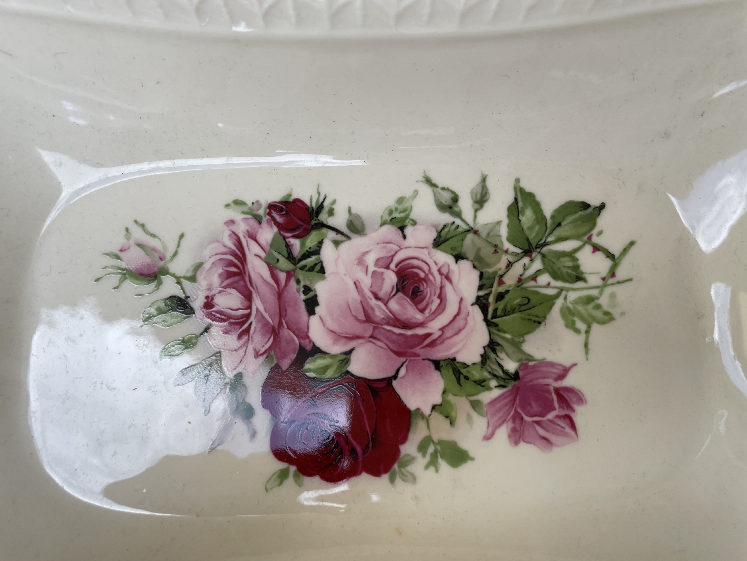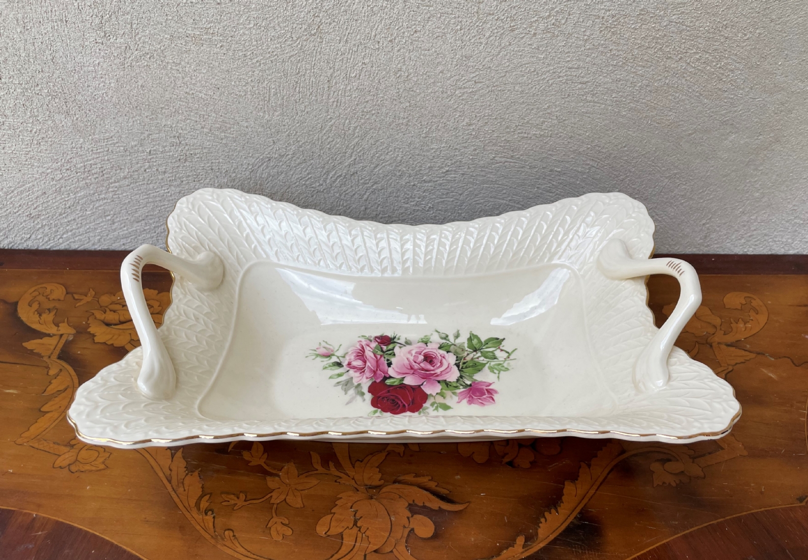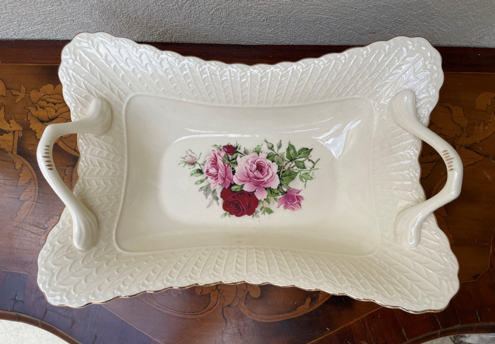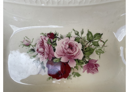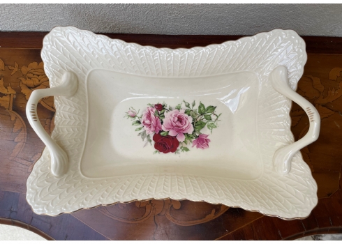 קערת חרסינה מלבנית להגשה וכיבוד מעוטרת בהדפס של שושנים פורחות וחתומה, זוג ידיות