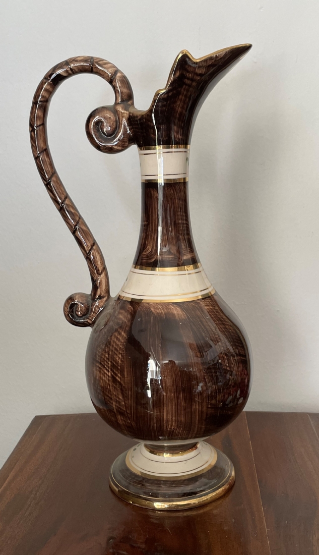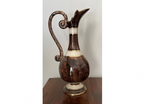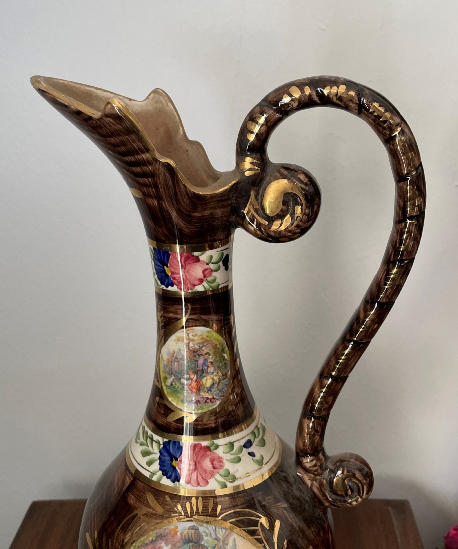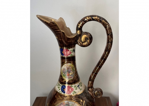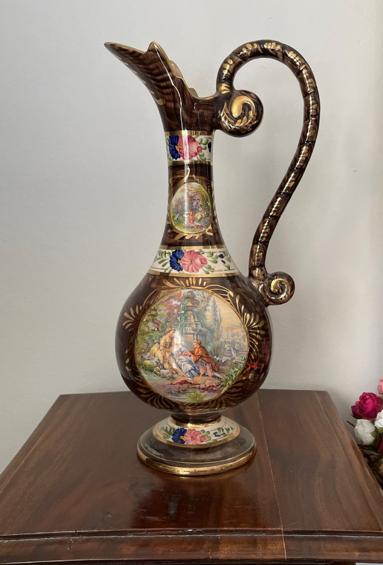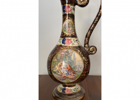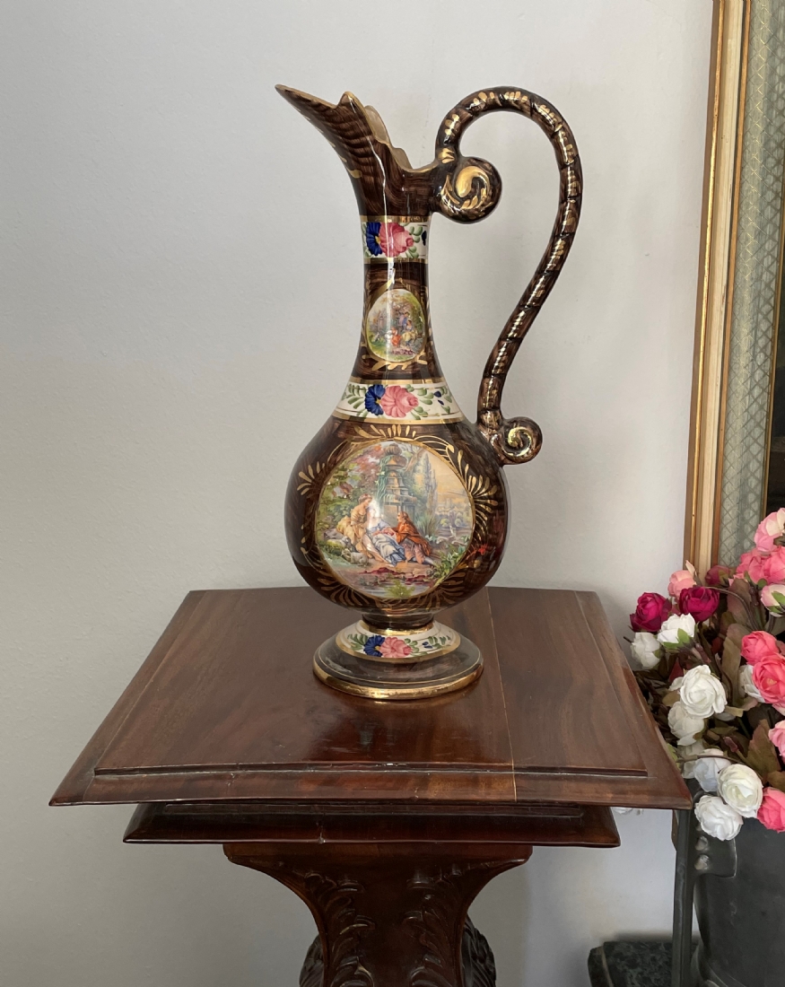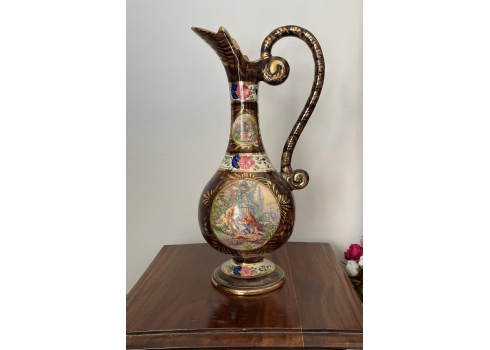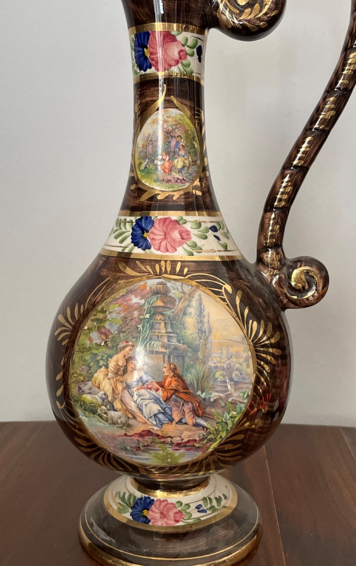 קנקן בלגי ישן עשוי חרס ומעוטר בהדפס בדמות אצילים בסצנת חיזור גאלנטית, חתום, גובה: 37 ס"מ.