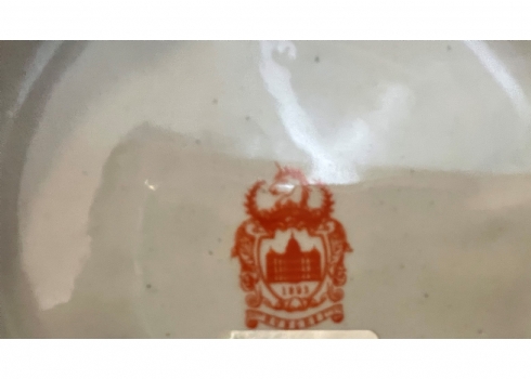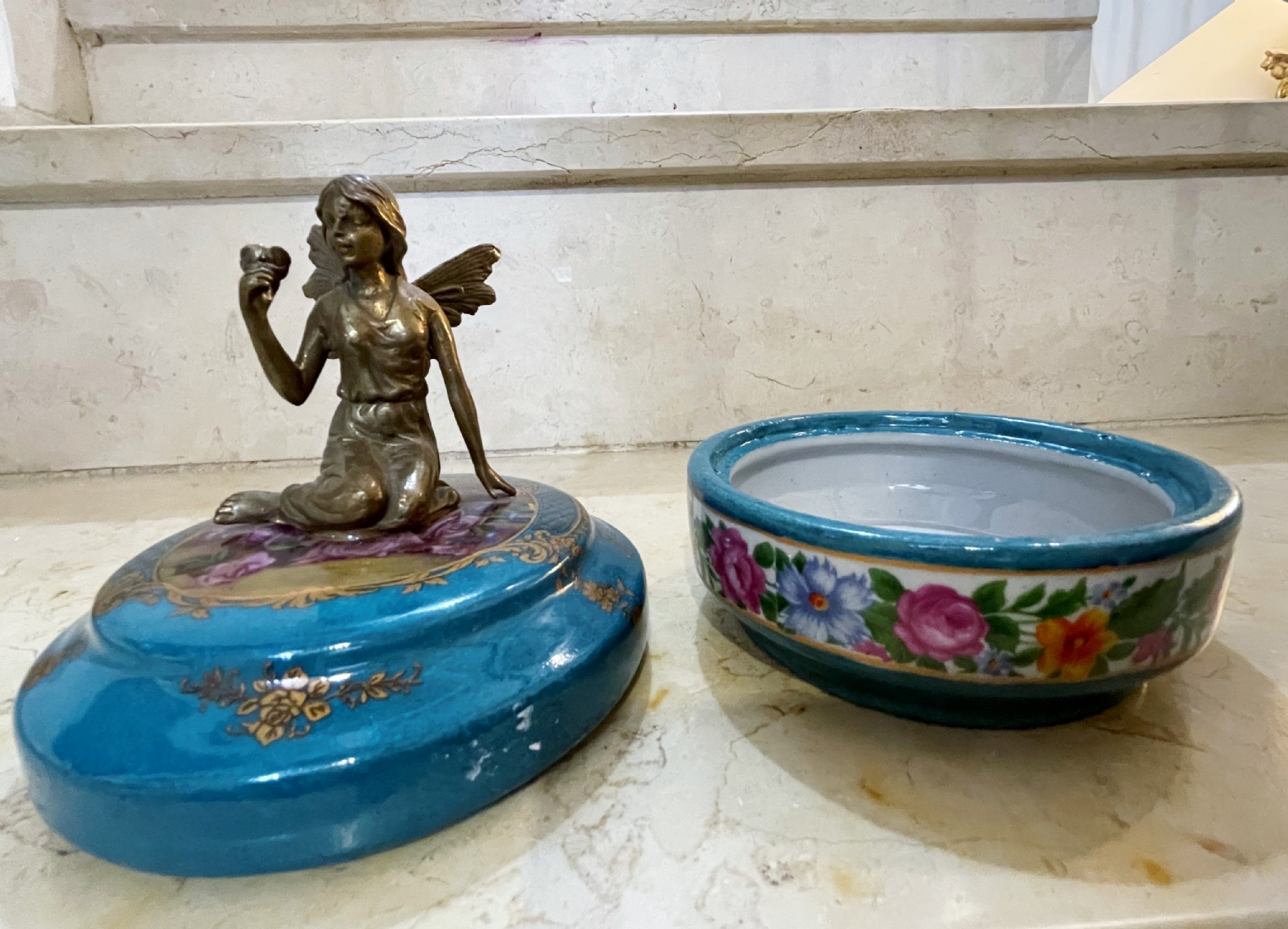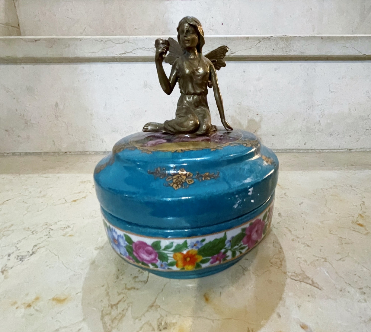 קופסא עגולה ומכסה תואם עשויים חרס ומתכת מפוסלת בדמות פיה צעירה, מעוטרת בהדפס של שושנים פורחות ובזהב על רקע בגוון טורקיז, חתום, גובה כולל: 16 ס"מ, קוטר: 12 ס"מ.