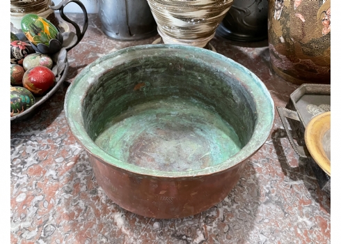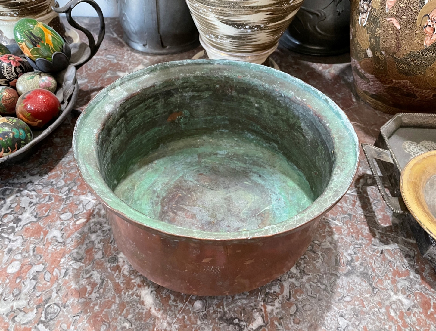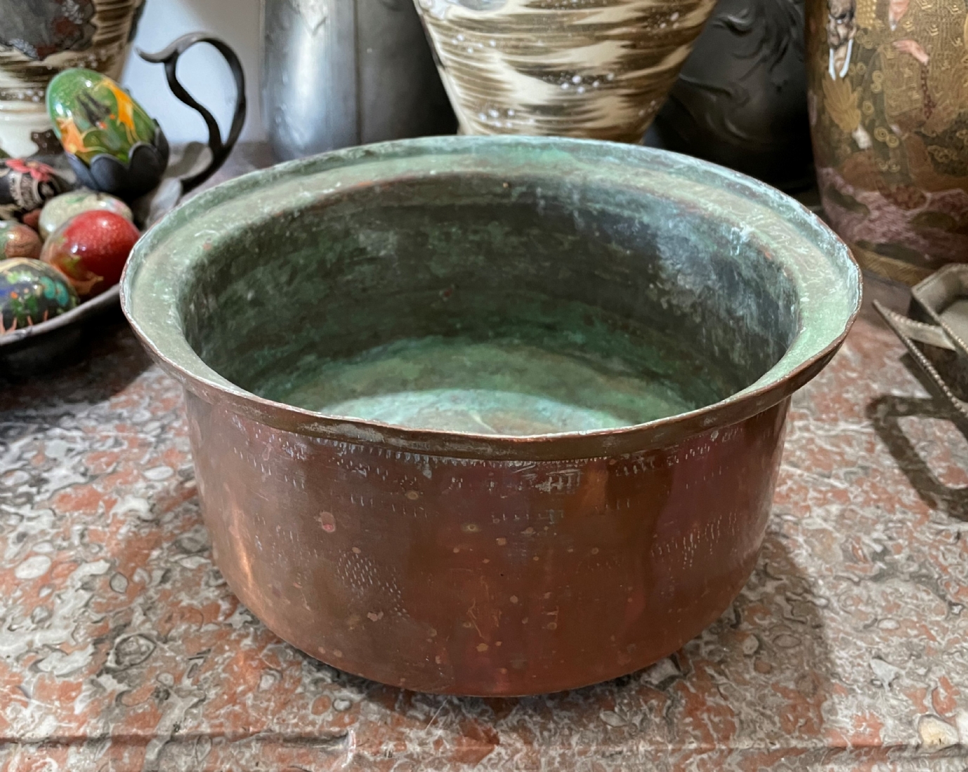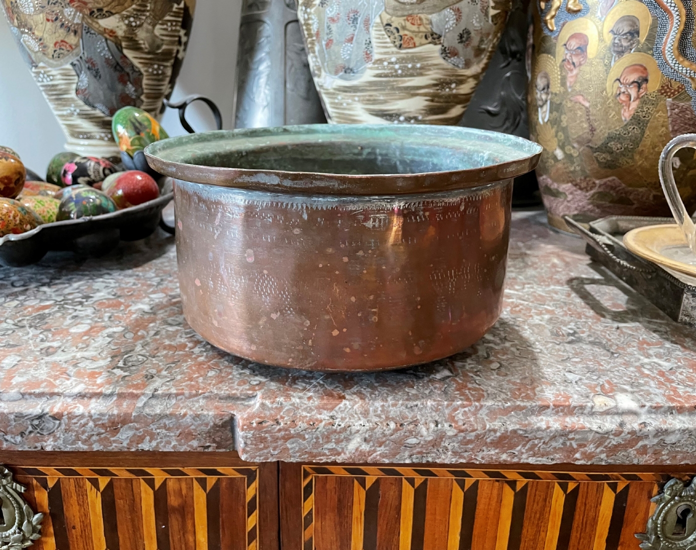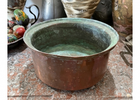 לאספני אומנות אסלמית, סיר אסלמי קטן מהמאה ה19 עשוי נחושת (שאריות ציפוי בדיל) גובה: 10 ס"מ, קוטר: 22.5 ס"מ.
