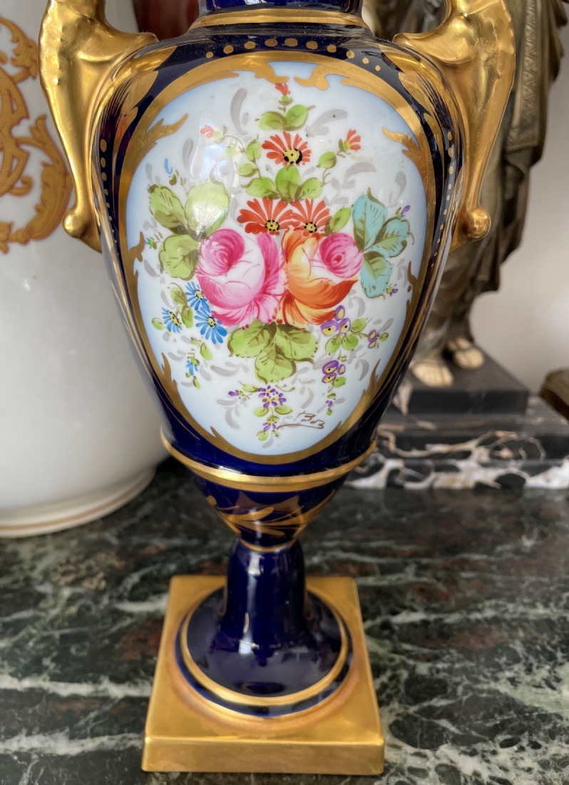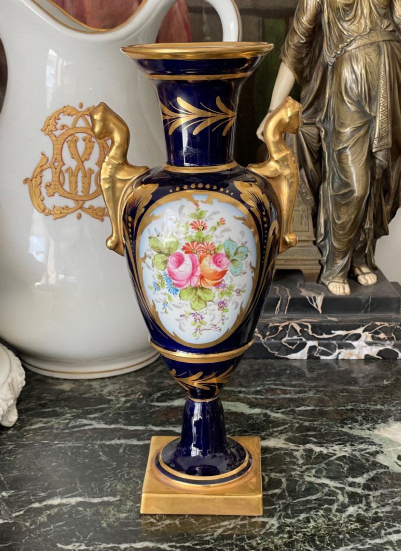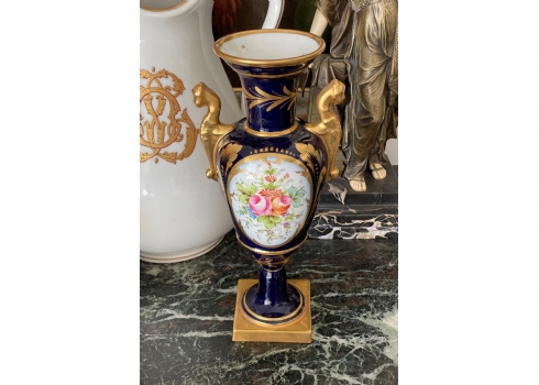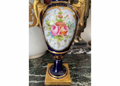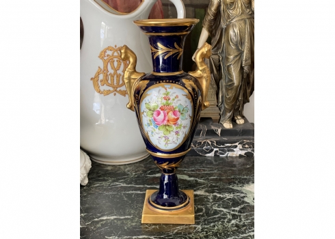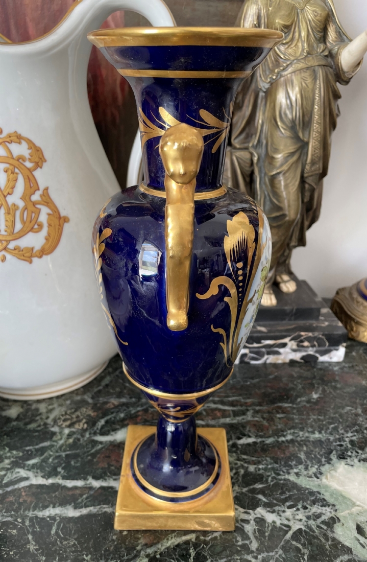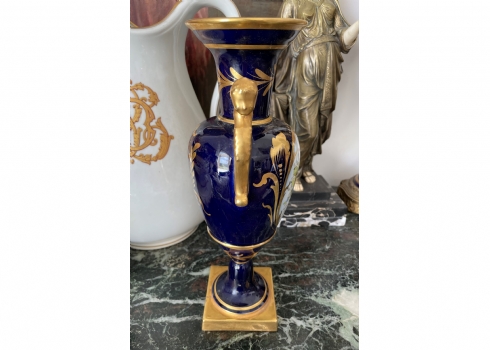אגרטל פורצלן צרפתי (לימוג' Limoges) בסגנון 'אמפיר', מעוטר על רקע קובלט כחול ובזהב, רוחב: 15 ס"מ, גובה: 32.5 ס"מ.
