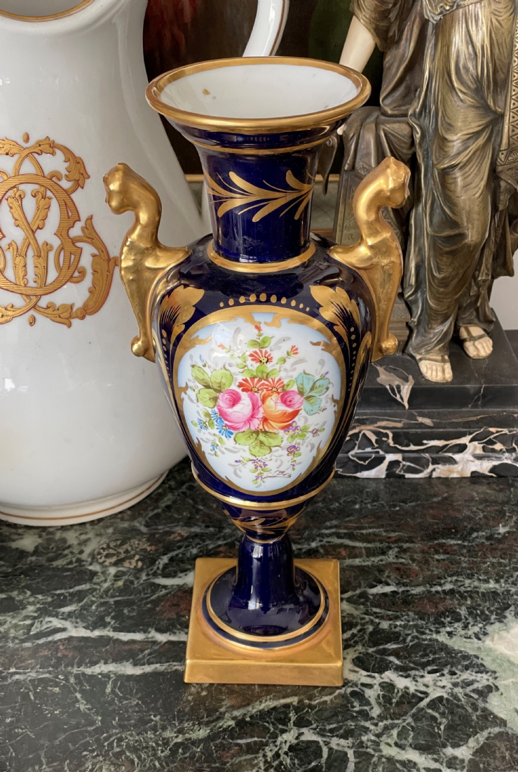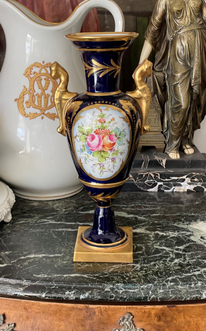 אגרטל פורצלן צרפתי (לימוג' Limoges) בסגנון 'אמפיר', מעוטר על רקע קובלט כחול