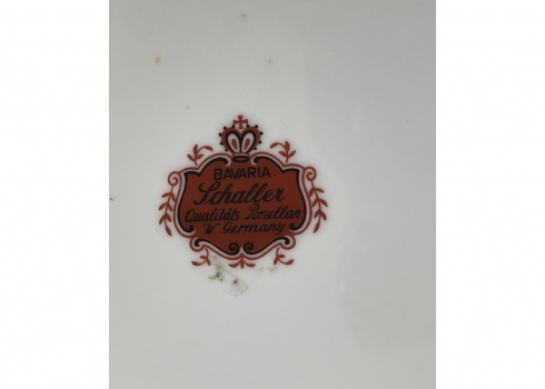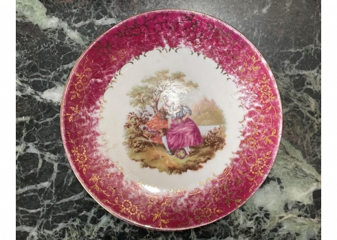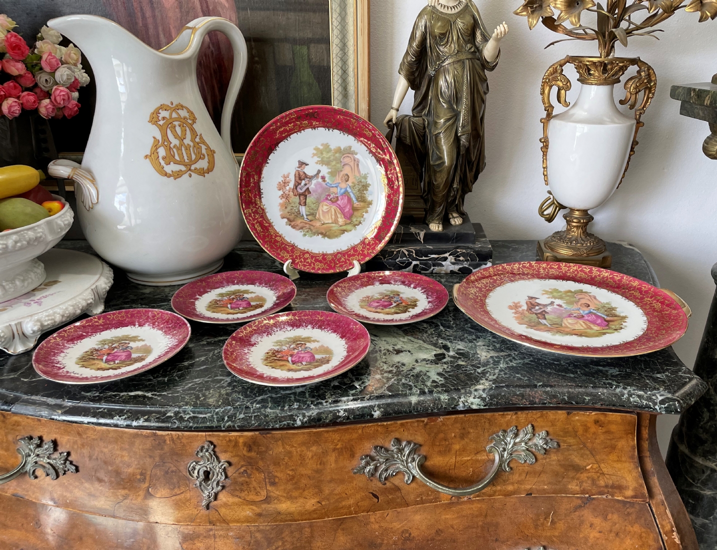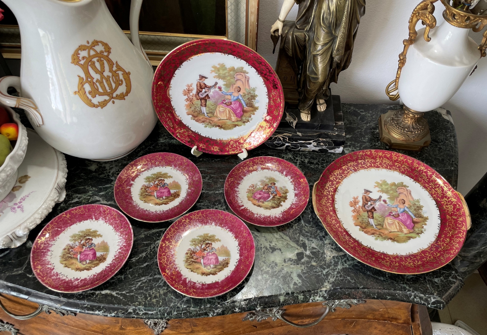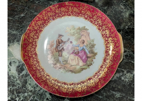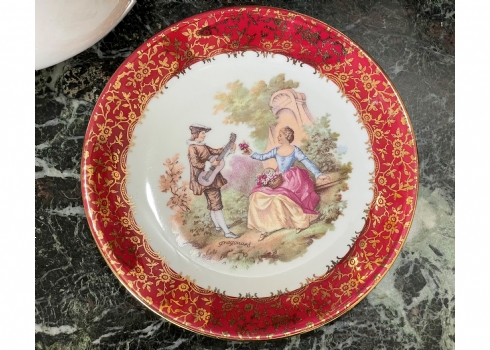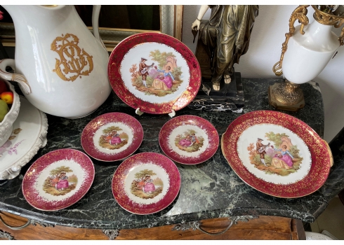 סט הגשה גרמני עשוי פורצלן, מעוטר בהדפסים של סצנות חיזור גלאנטיות ובזהב, על רקע אמרות בגון אדום וסגול, חתום, כולל: צלחת גדולה לעוגה ברוחב של 29 ס"מ, צלחת פירות מרכזית בקוטר: 25 ס"מ, ועוד 4 צלחות אישיות בקוטר: 17 ס"מ.