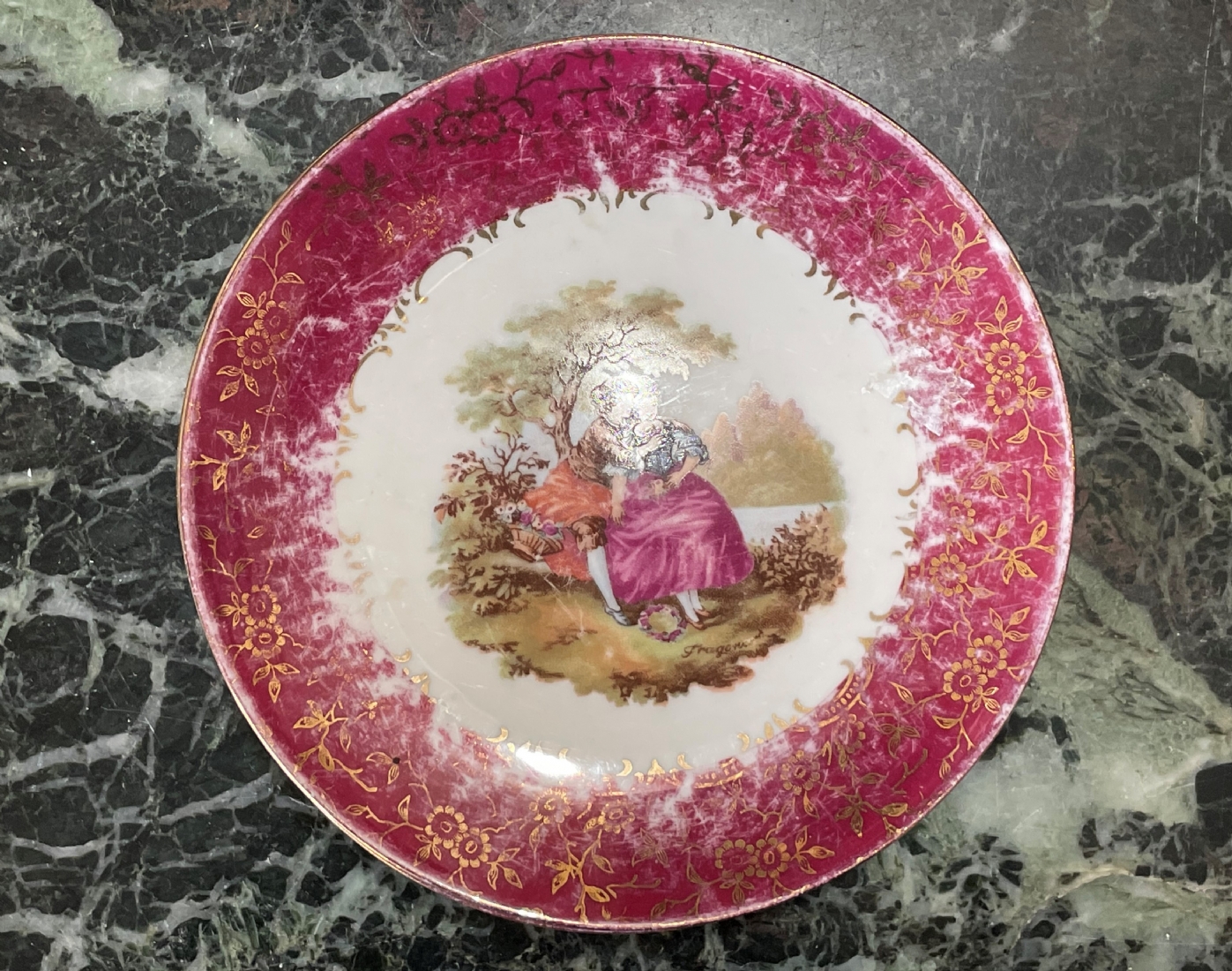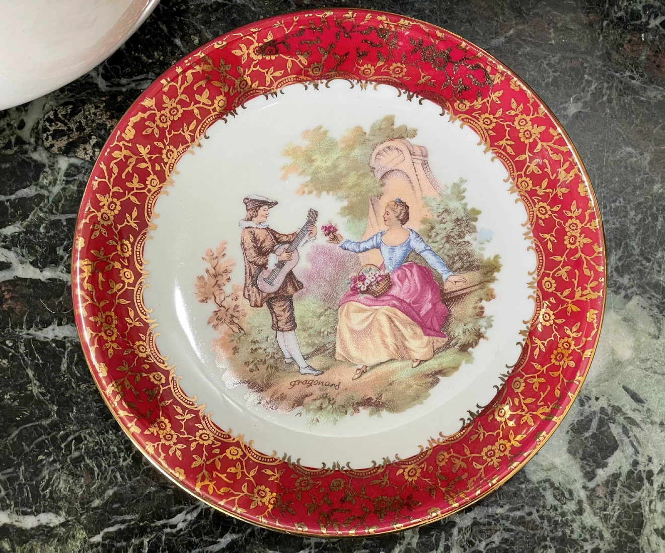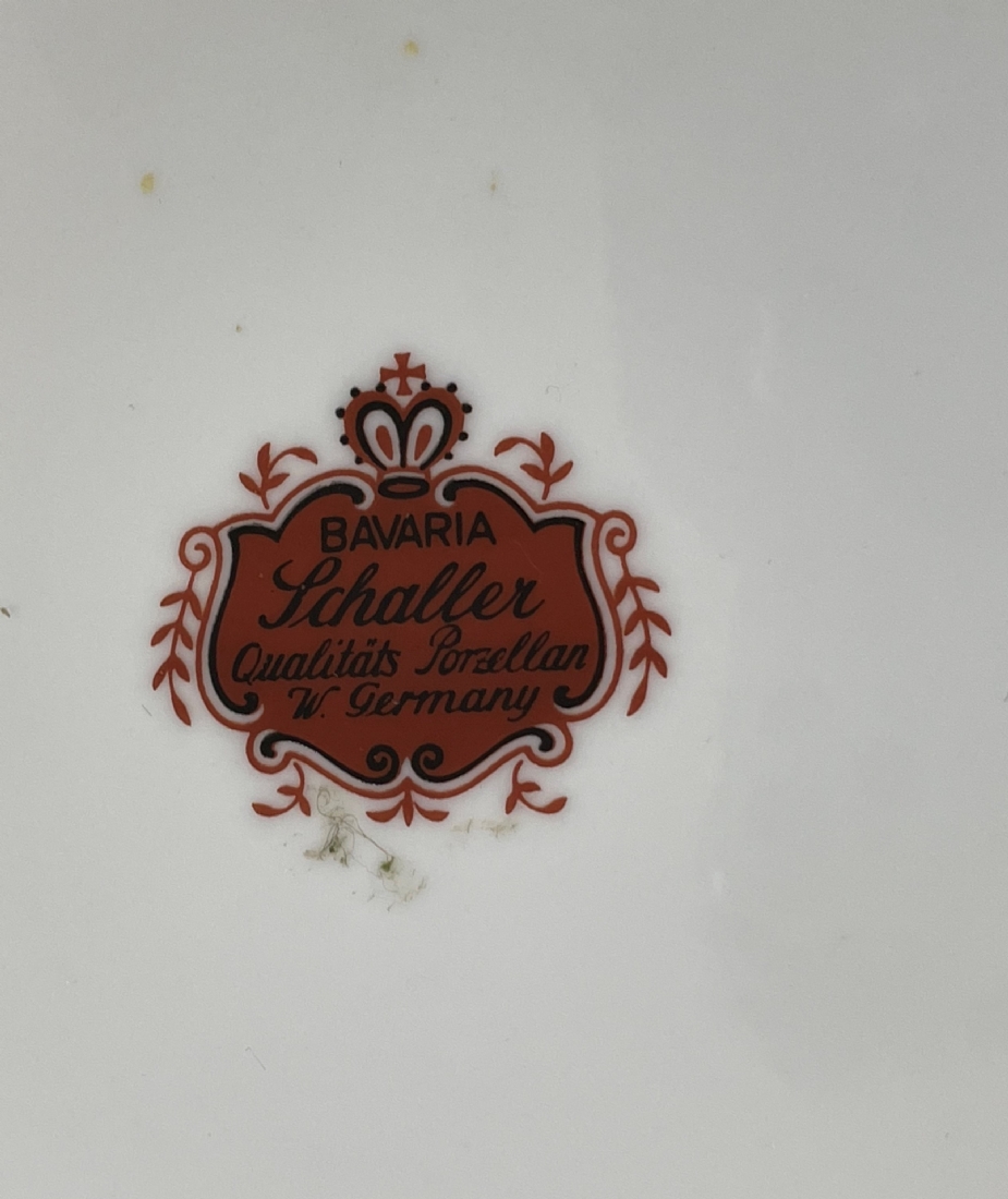 סט הגשה גרמני עשוי פורצלן, מעוטר בהדפסים של סצנות חיזור גלאנטיות ובזהב, על רקע אמרות בגון אדום וסגול, חתום, כולל: צלחת גדולה לעוגה ברוחב של 29 ס"מ, צלחת פירות מרכזית בקוטר: 25 ס"מ, ועוד 4 צלחות אישיות בקוטר: 17 ס"מ.
