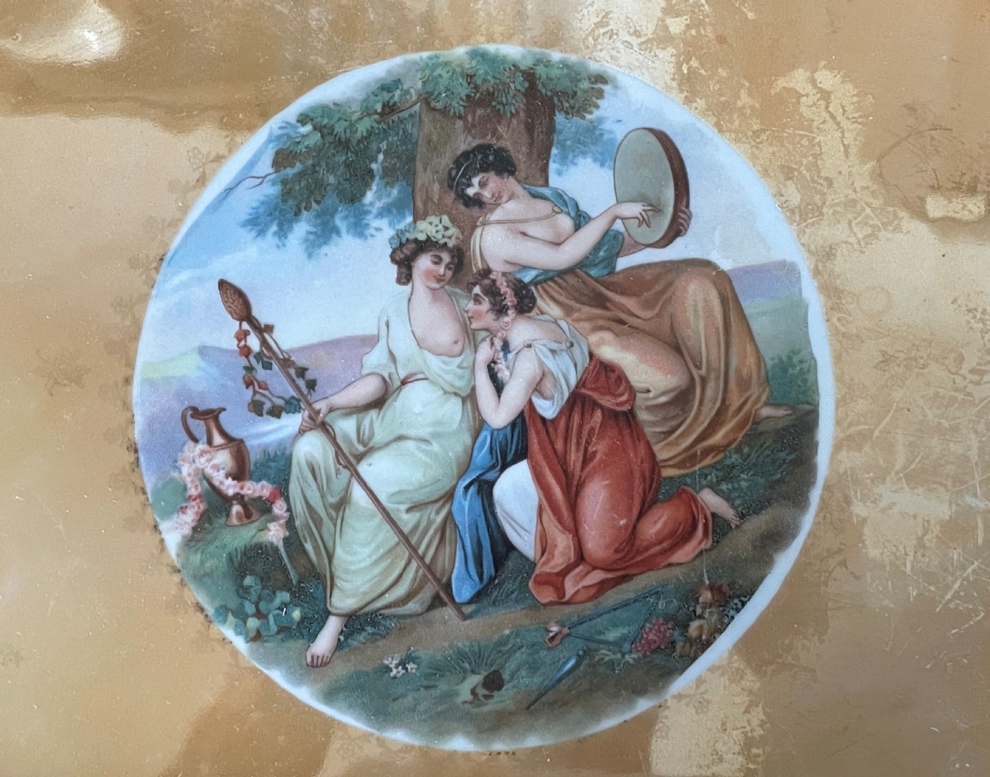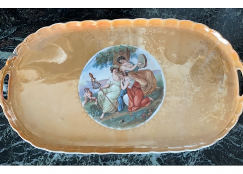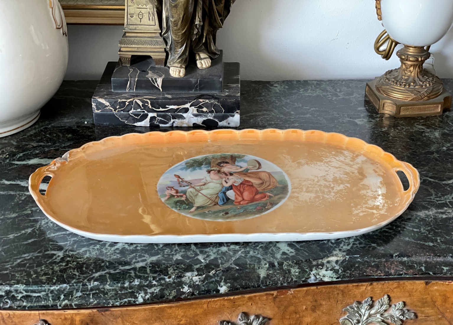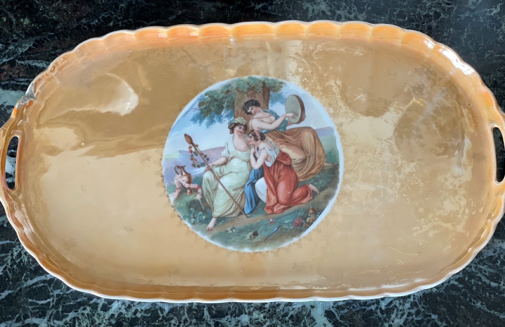 מגש פורצלן צ'כי גדול ויפה, מעוטר במרכזו בסצנה של שלוש בכחנטות, על רקע בגוון כתום