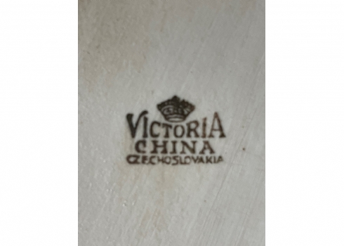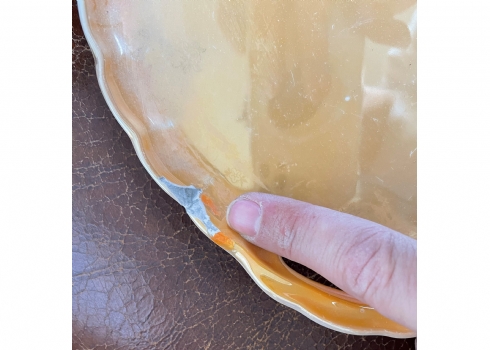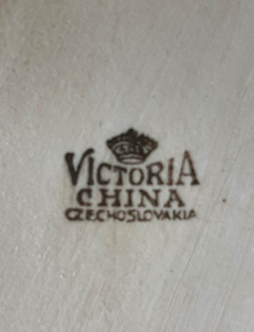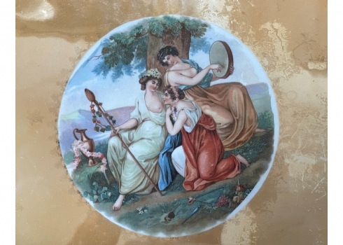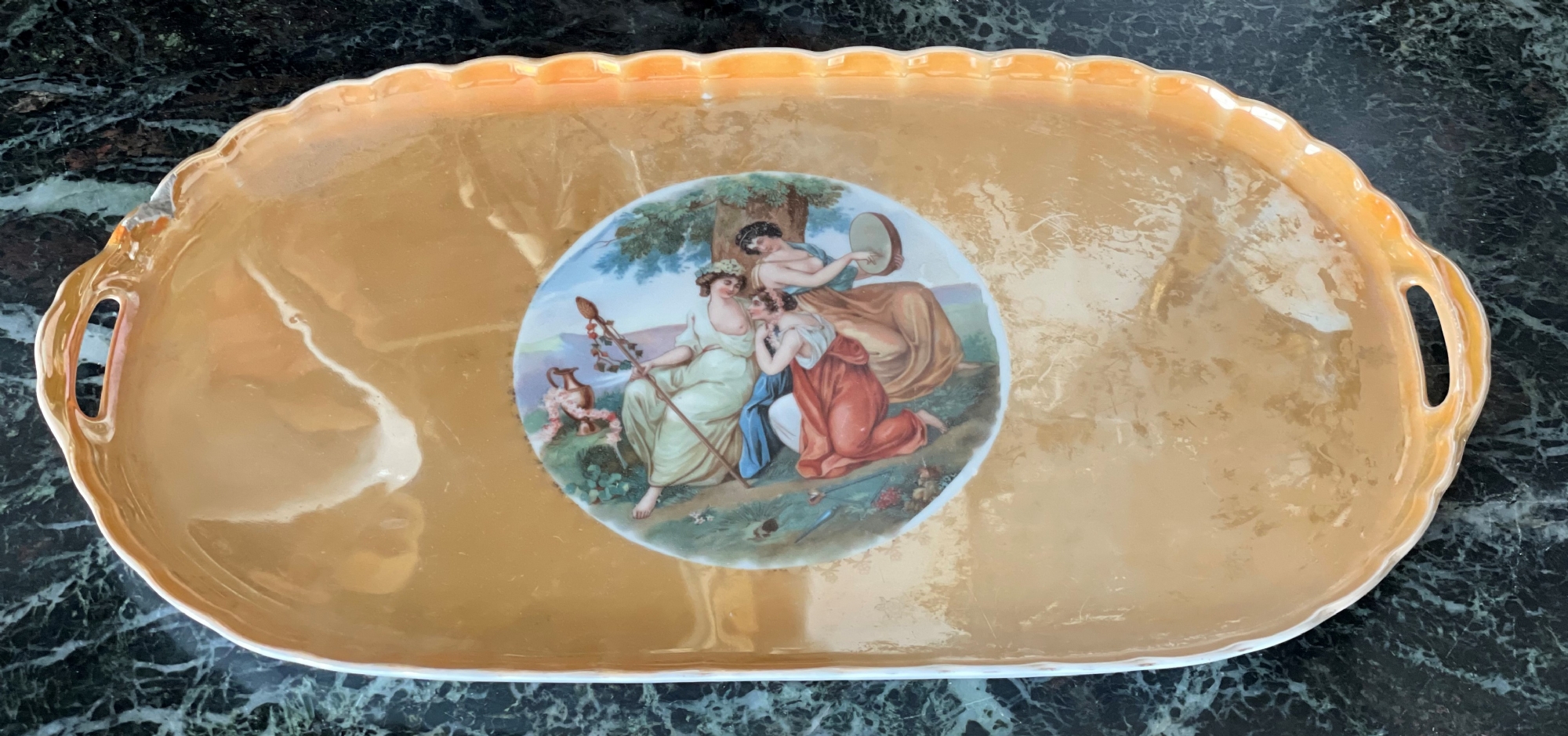מגש פורצלן צ'כי גדול ויפה, מעוטר במרכזו בסצנה של שלוש בכחנטות, על רקע בגוון כתום