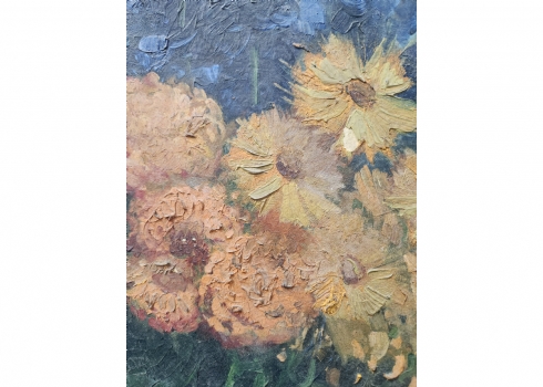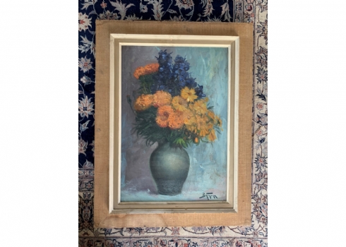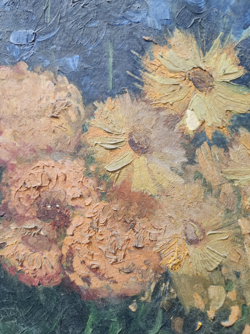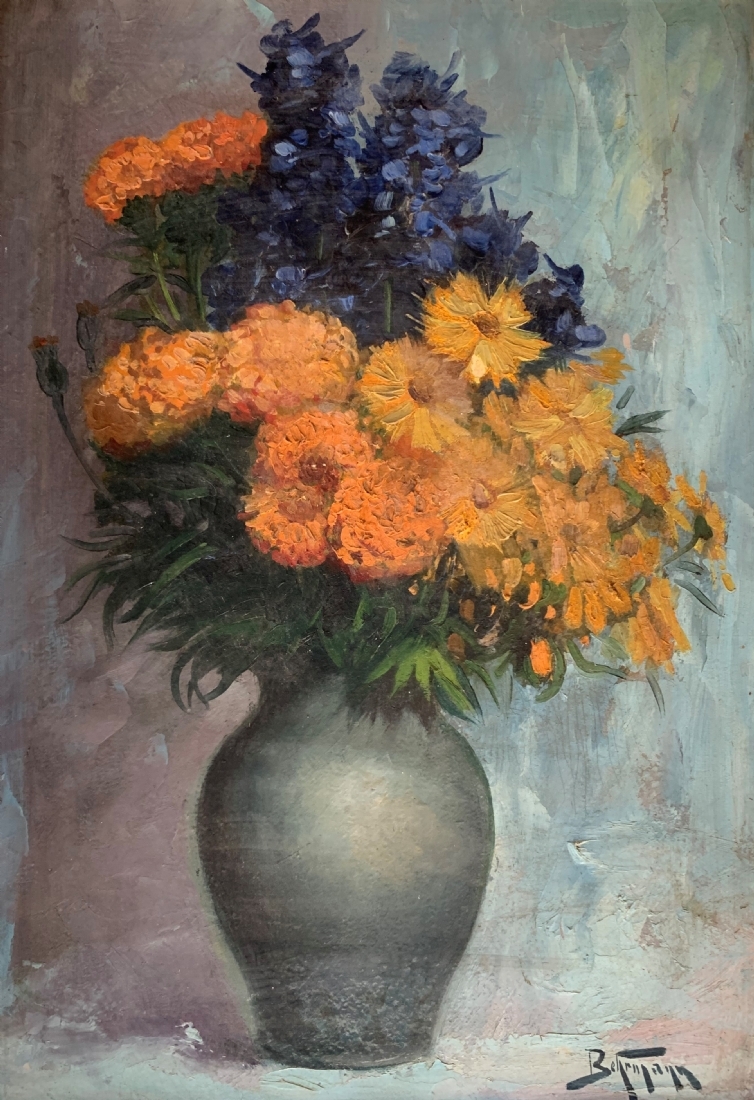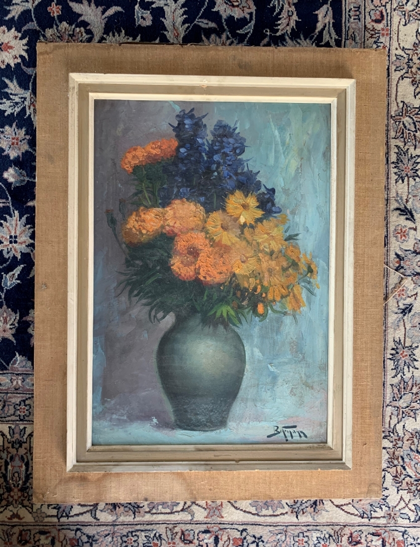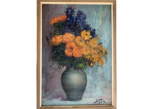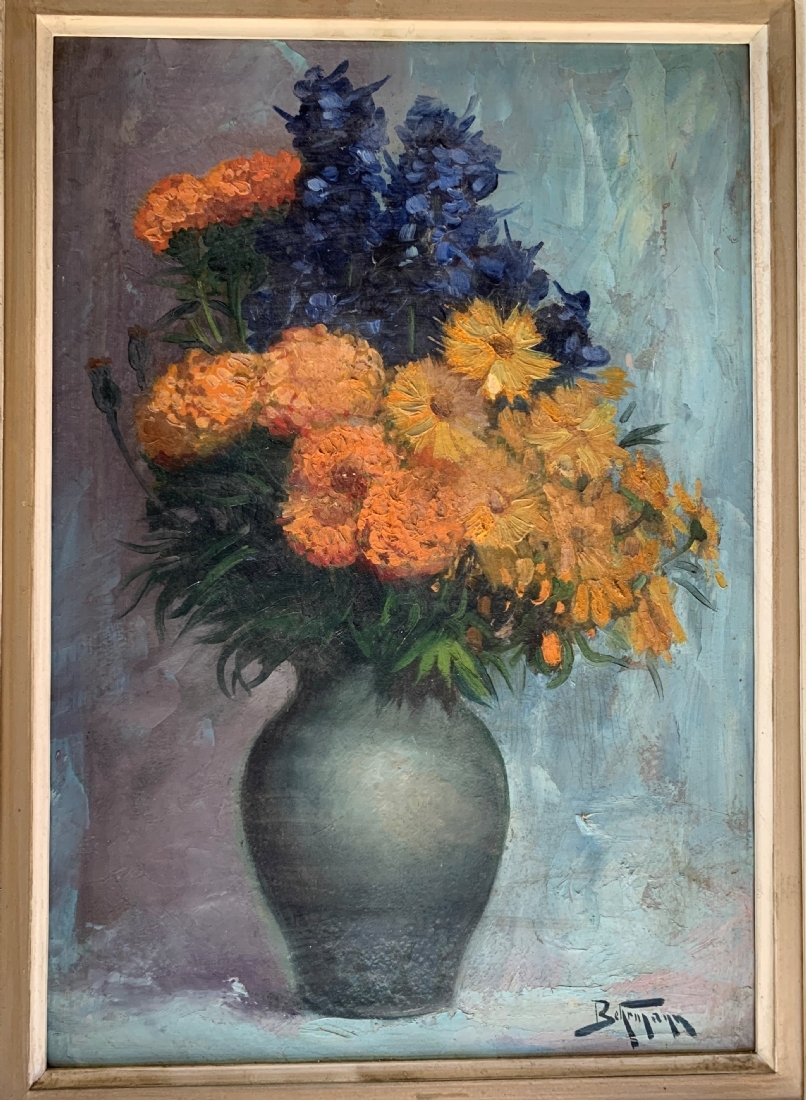 אברהם אדולף ברמן (adolf abraham behrmann) - 'פרחים כתומים וכחולים בכד ירוק' - ציור ישן, שמן על לוח, חתום, קילוף צבע (מצולם)