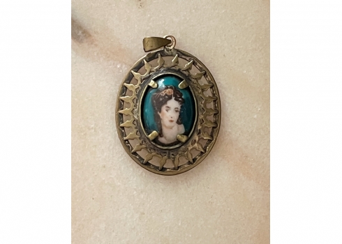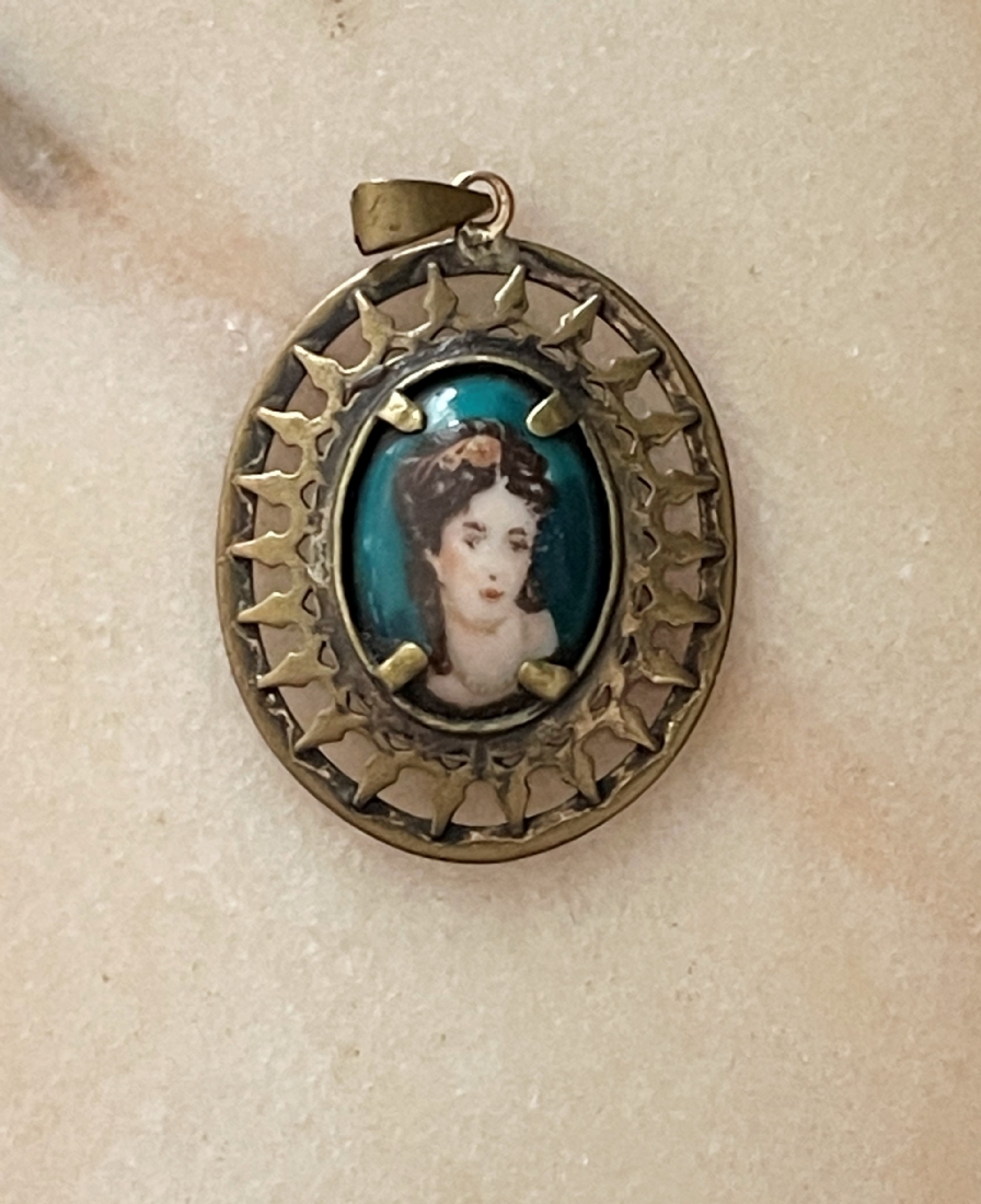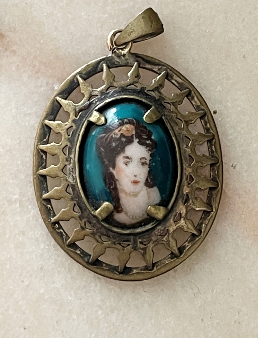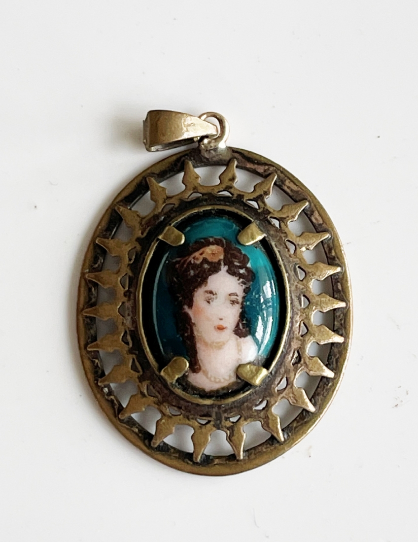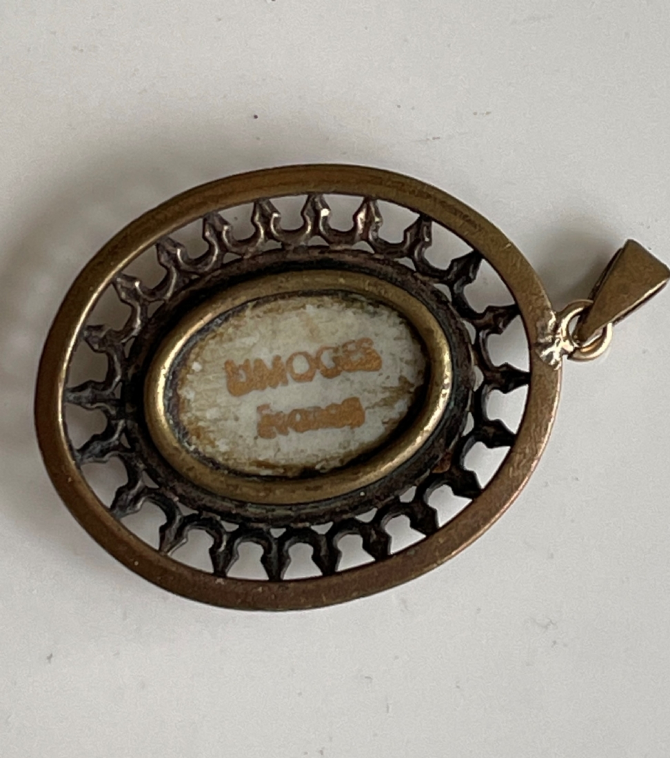 תליון משובץ פורצלן, מצויר באמייל על רקע טורקיז, תוצרת לימוז' צרפת, אורך כולל מתלה: 4.5 ס"מ, רוחב: 3 ס"מ.