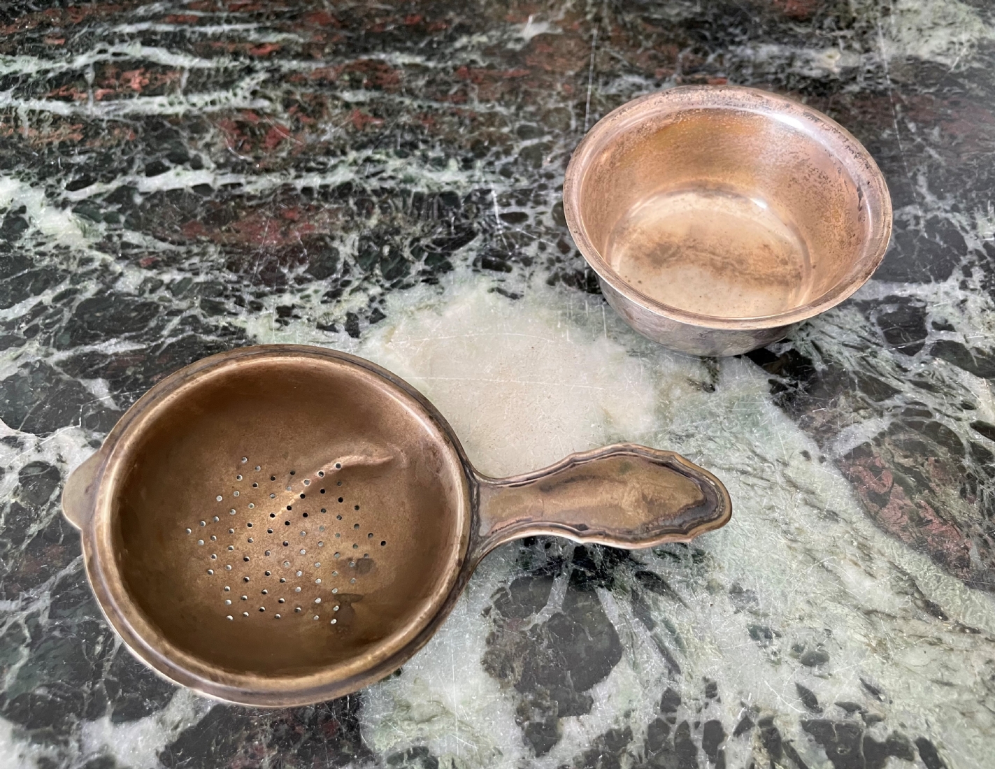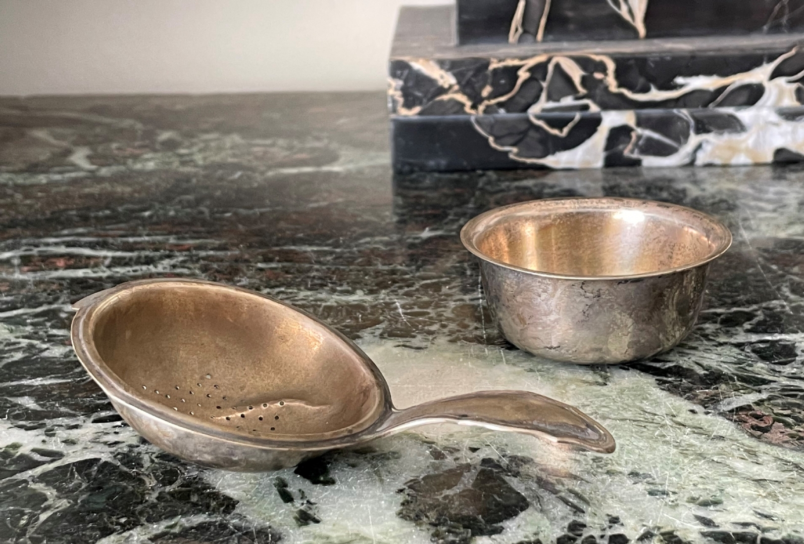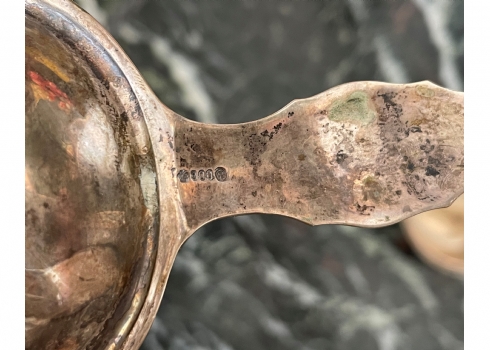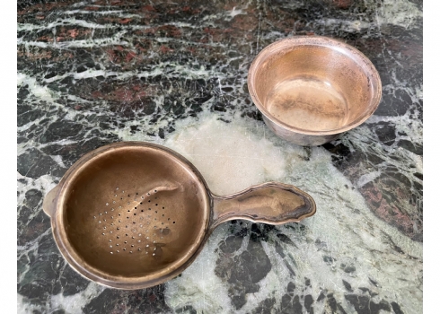 מעמד כסף גרמני לתיון ומסננת תה תואמת עשויים כסף '800', חתומים, קמט למסננת, אורך המסננת כולל ידית 11.5 ס"מ, משקל כולל: 81 גר'.