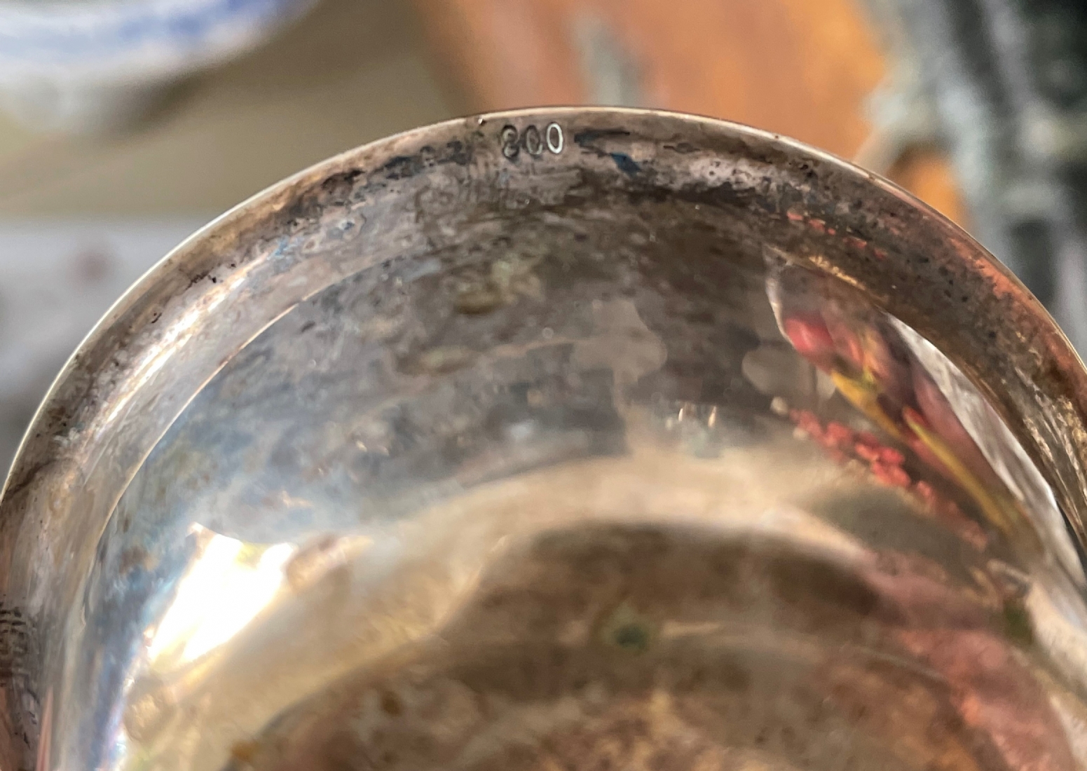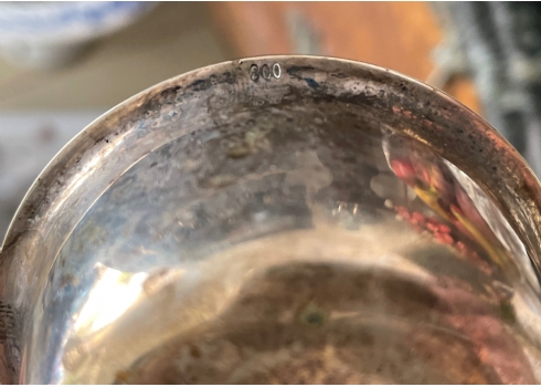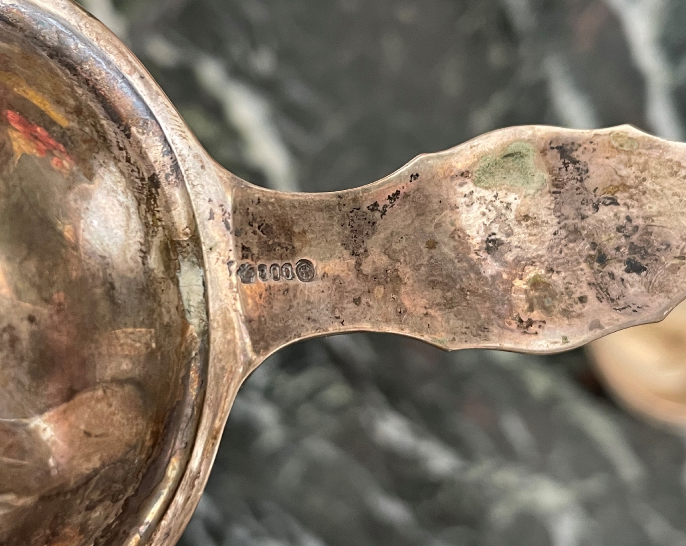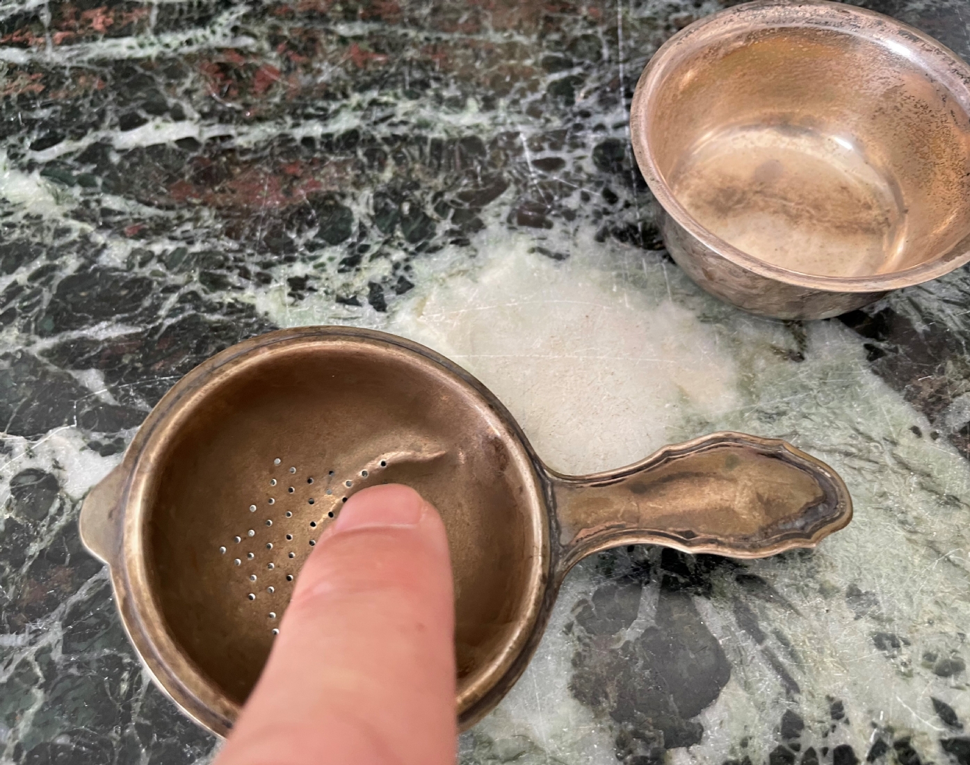 מעמד כסף גרמני לתיון ומסננת תה תואמת עשויים כסף '800', חתומים, קמט למסננת, אורך המסננת כולל ידית 11.5 ס"מ, משקל כולל: 81 גר'.