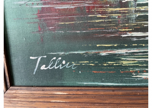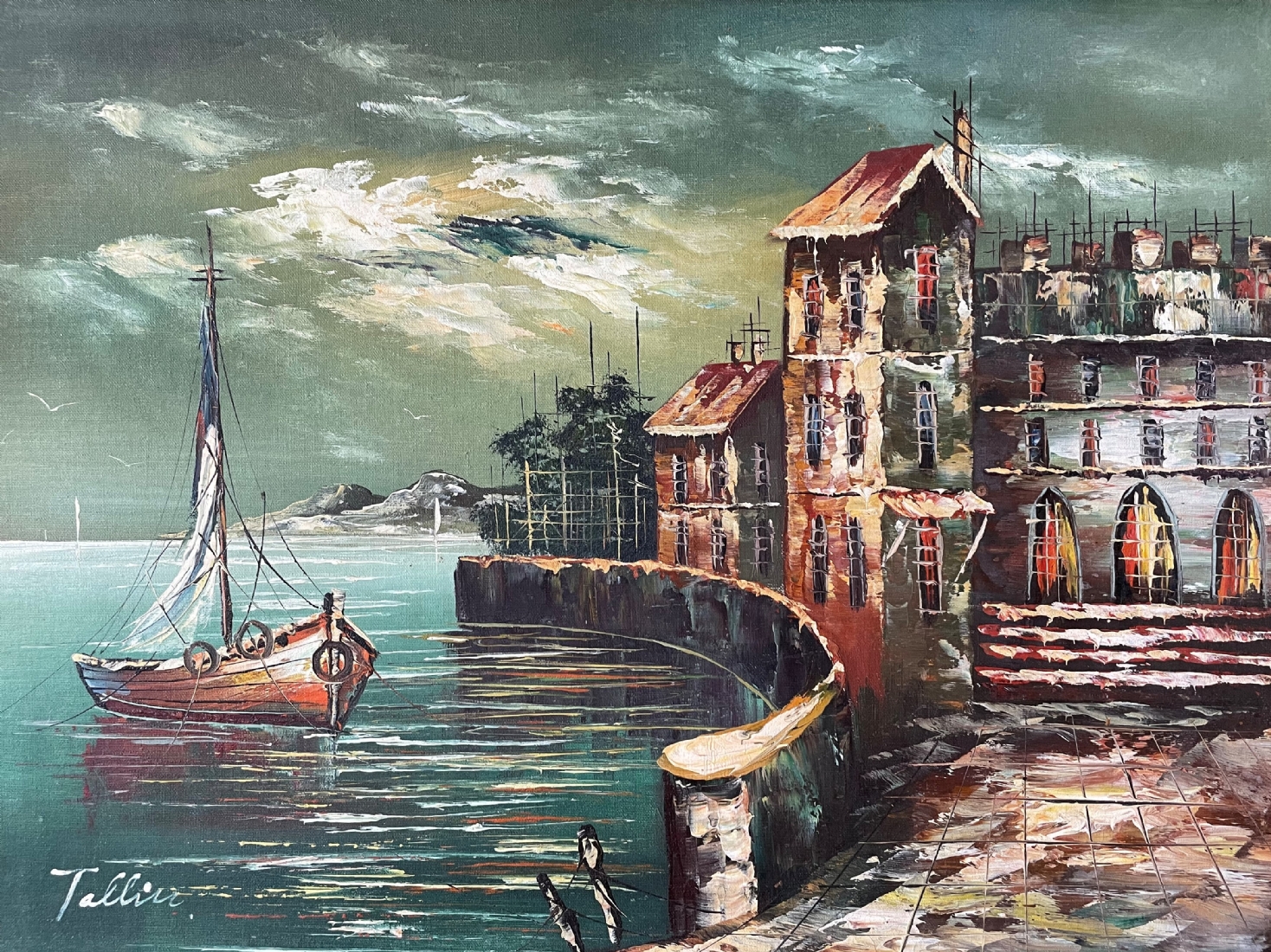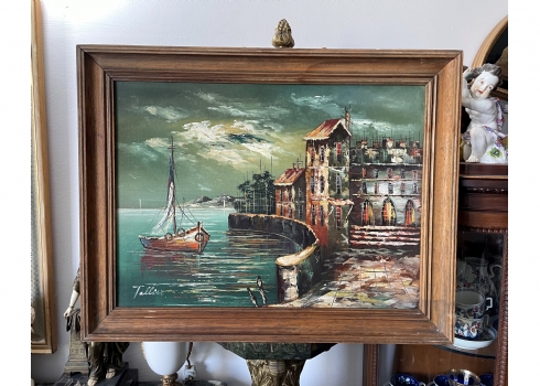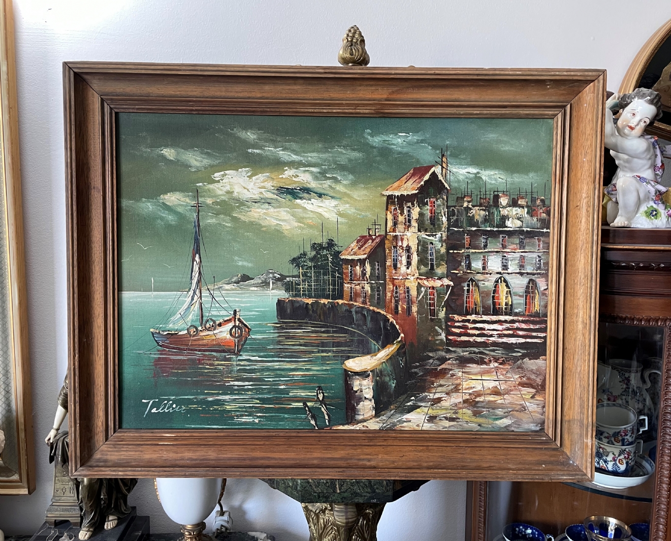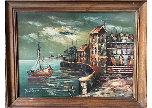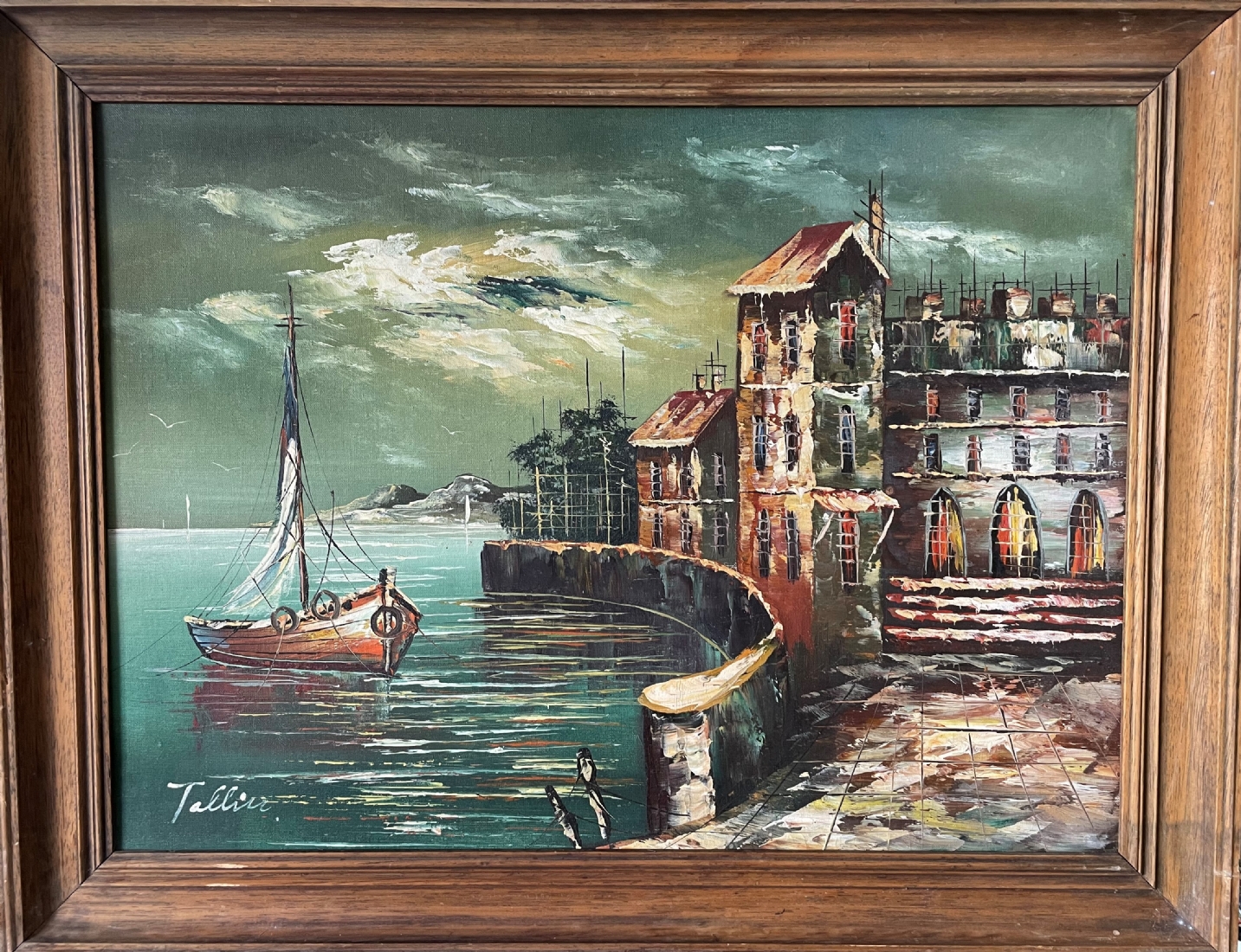'סירה בעיקול המזח' - ציור ישן, שמן על בד צרפתי חתום, מידות: 45X61 ס"מ.