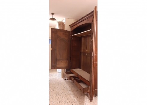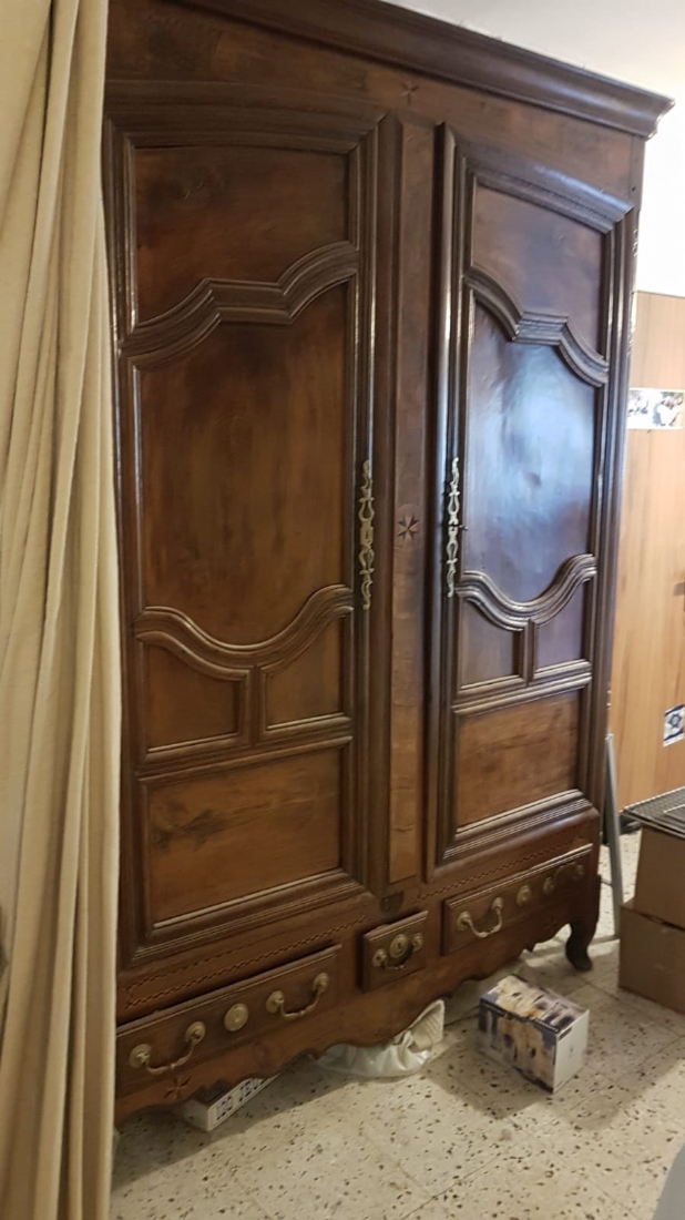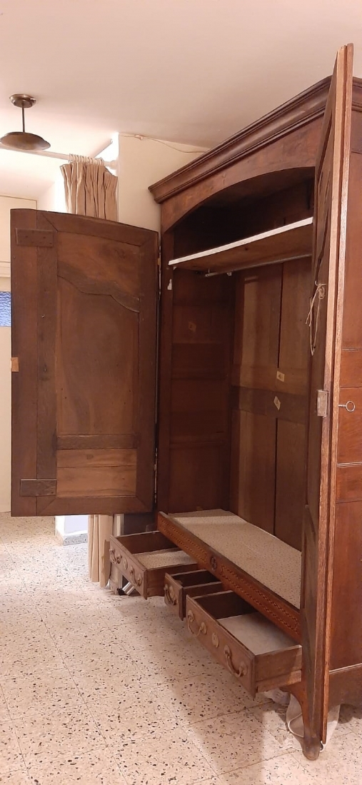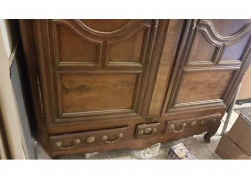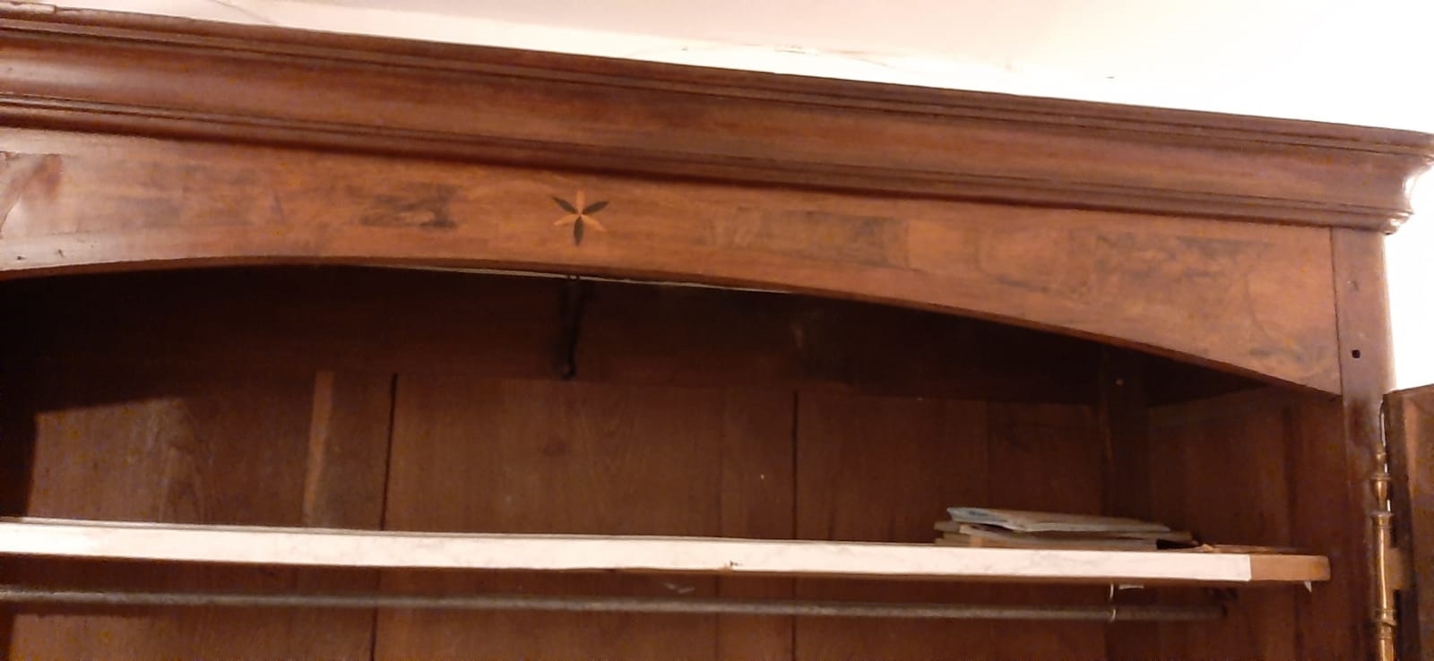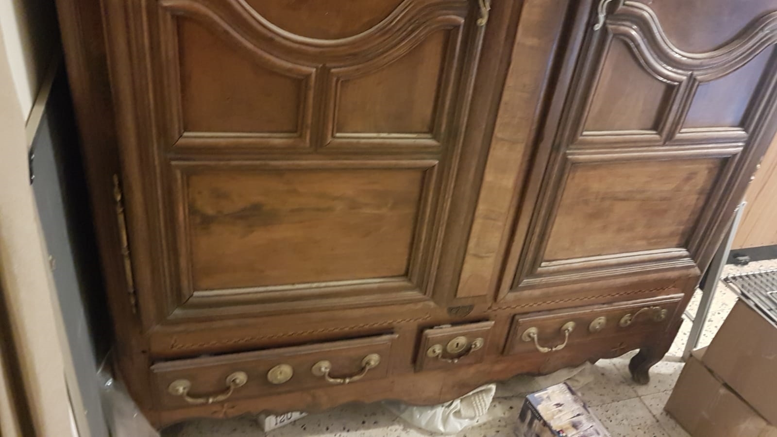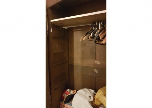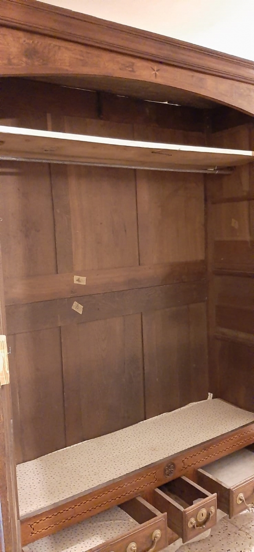 ארון בגדים ישן בסגנון עתיק, כפי הנראה גרמני או איטלקי, עשוי עץ ומעוטר עבודת שיבוץ 'פרקטרי' ועיטורים מגולפים בסגנון המאה ה-18, פגם לפינה (מצולם בתקריב), מפאת גודלו ומשקלו הושאר הארון בדירה בירושלים והזוכה בו מתחייב לפנותו מהדירה על חשבונו בתיאום עם בעל הדירה, מידות, גובה: 234 ס"מ, רוחב החזית: 164 ס"מ, עומק: 51 ס"מ.