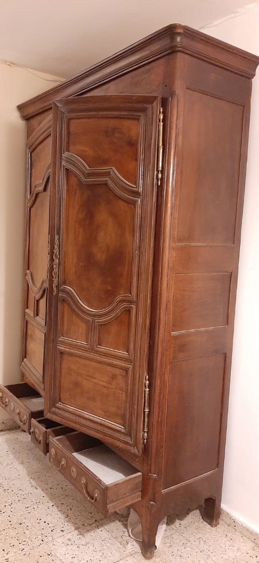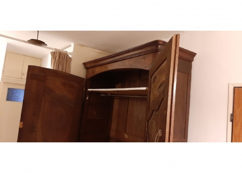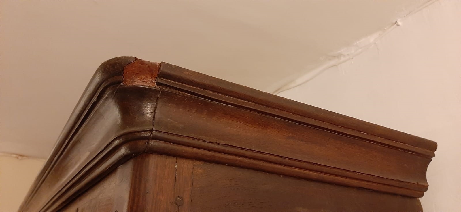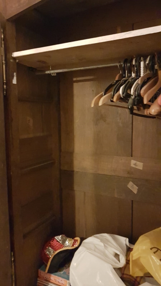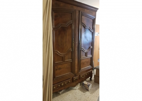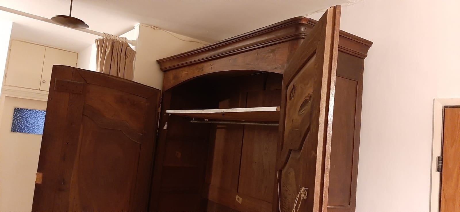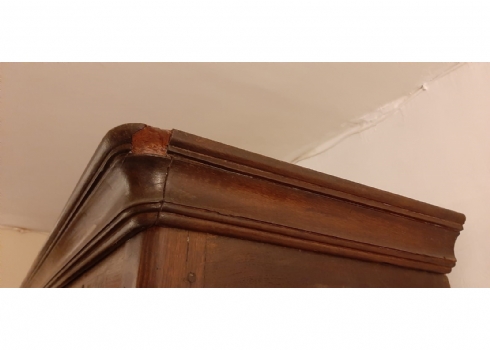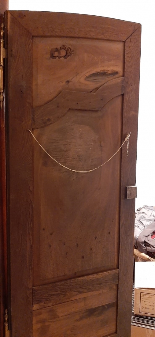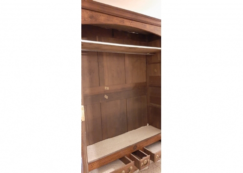 ארון בגדים ישן בסגנון עתיק, כפי הנראה גרמני או איטלקי, עשוי עץ ומעוטר עבודת שיבוץ 'פרקטרי' ועיטורים מגולפים בסגנון המאה ה-18, פגם לפינה (מצולם בתקריב), מפאת גודלו ומשקלו הושאר הארון בדירה בירושלים והזוכה בו מתחייב לפנותו מהדירה על חשבונו בתיאום עם בעל הדירה, מידות, גובה: 234 ס"מ, רוחב החזית: 164 ס"מ, עומק: 51 ס"מ.