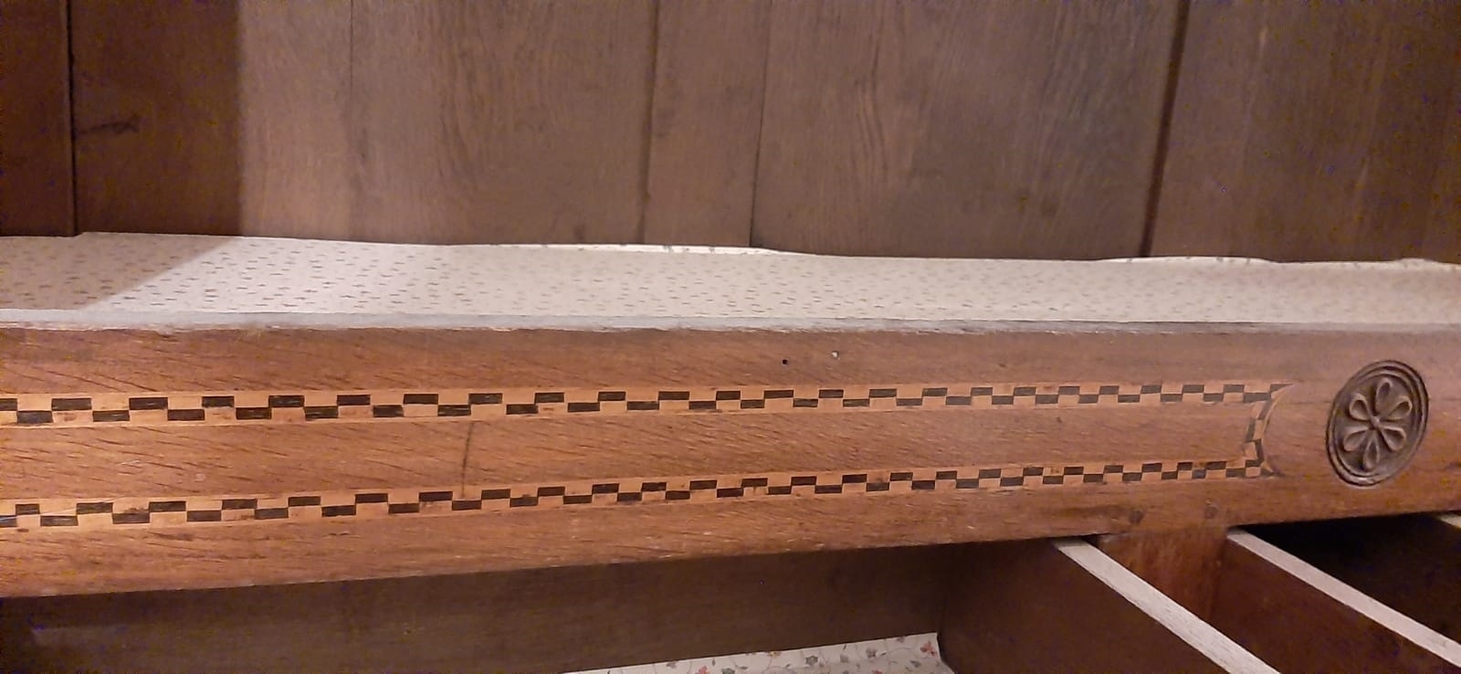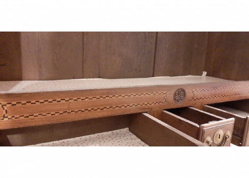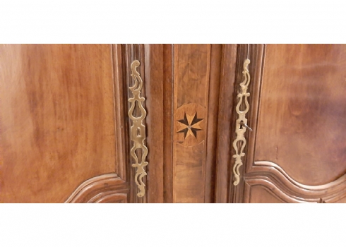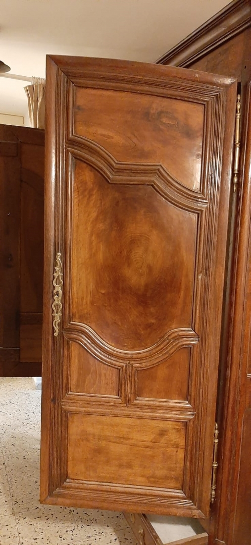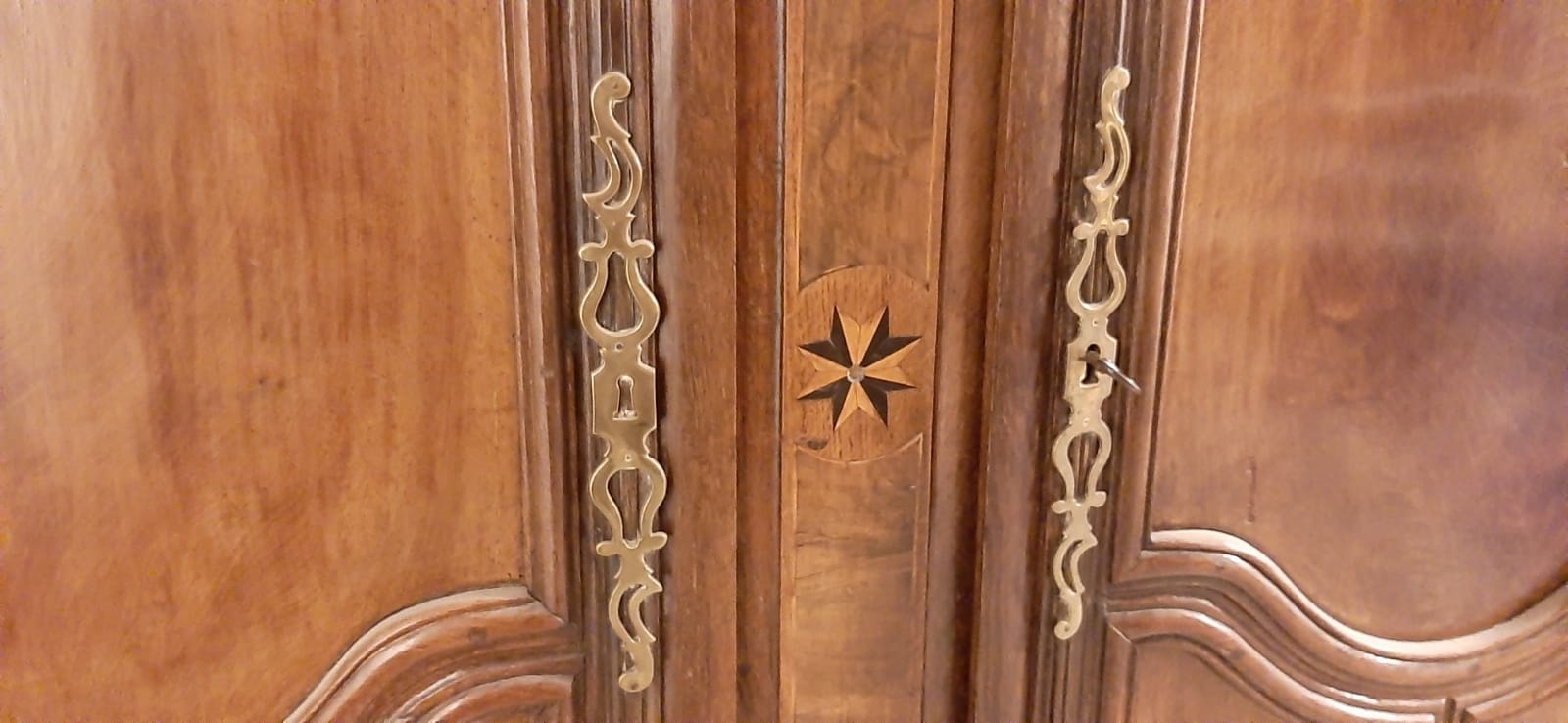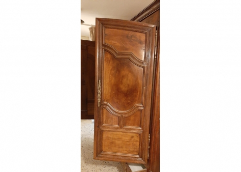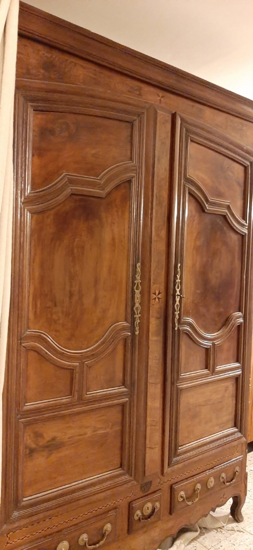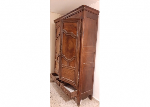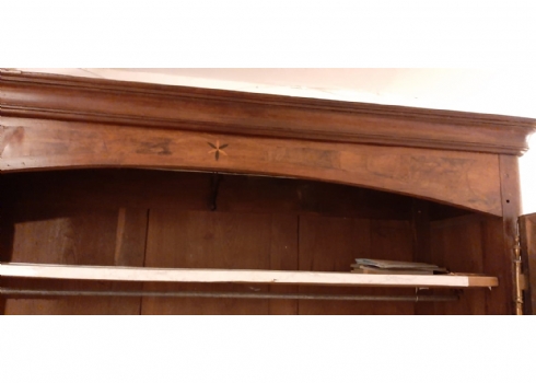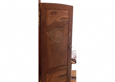 ארון בגדים ישן בסגנון עתיק, כפי הנראה גרמני או איטלקי, עשוי עץ ומעוטר עבודת שיבוץ 'פרקטרי' ועיטורים מגולפים בסגנון המאה ה-18, פגם לפינה (מצולם בתקריב), מפאת גודלו ומשקלו הושאר הארון בדירה בירושלים והזוכה בו מתחייב לפנותו מהדירה על חשבונו בתיאום עם בעל הדירה, מידות, גובה: 234 ס"מ, רוחב החזית: 164 ס"מ, עומק: 51 ס"מ.