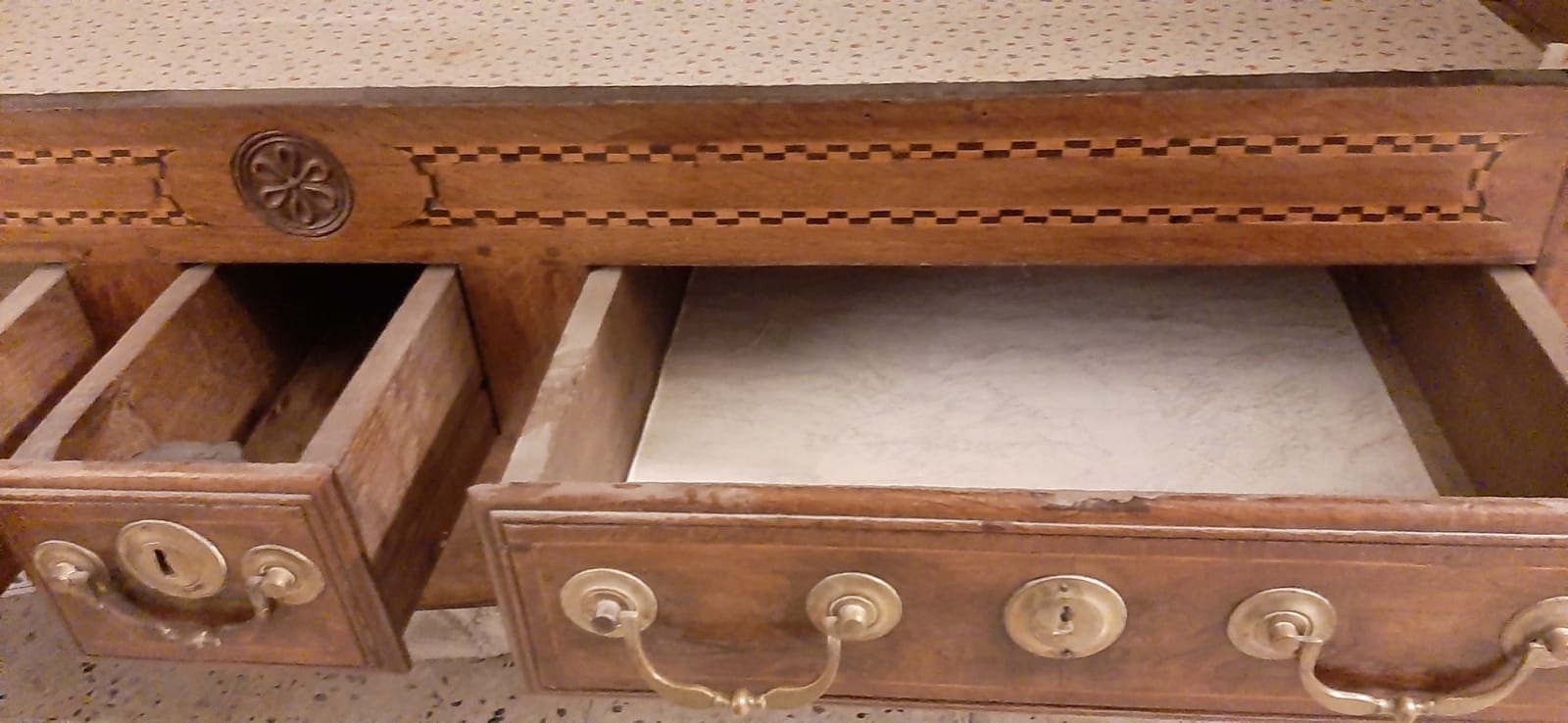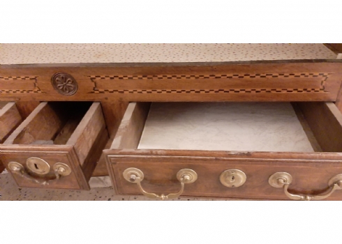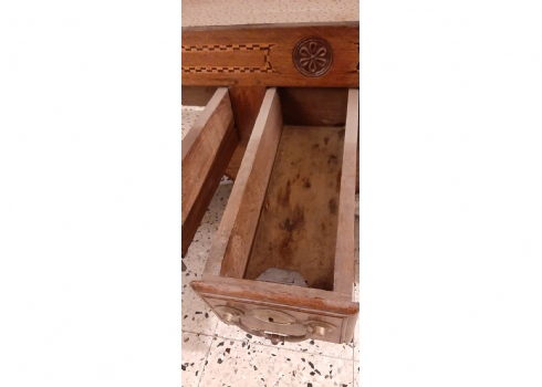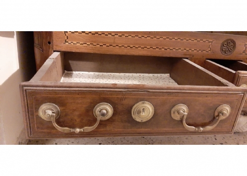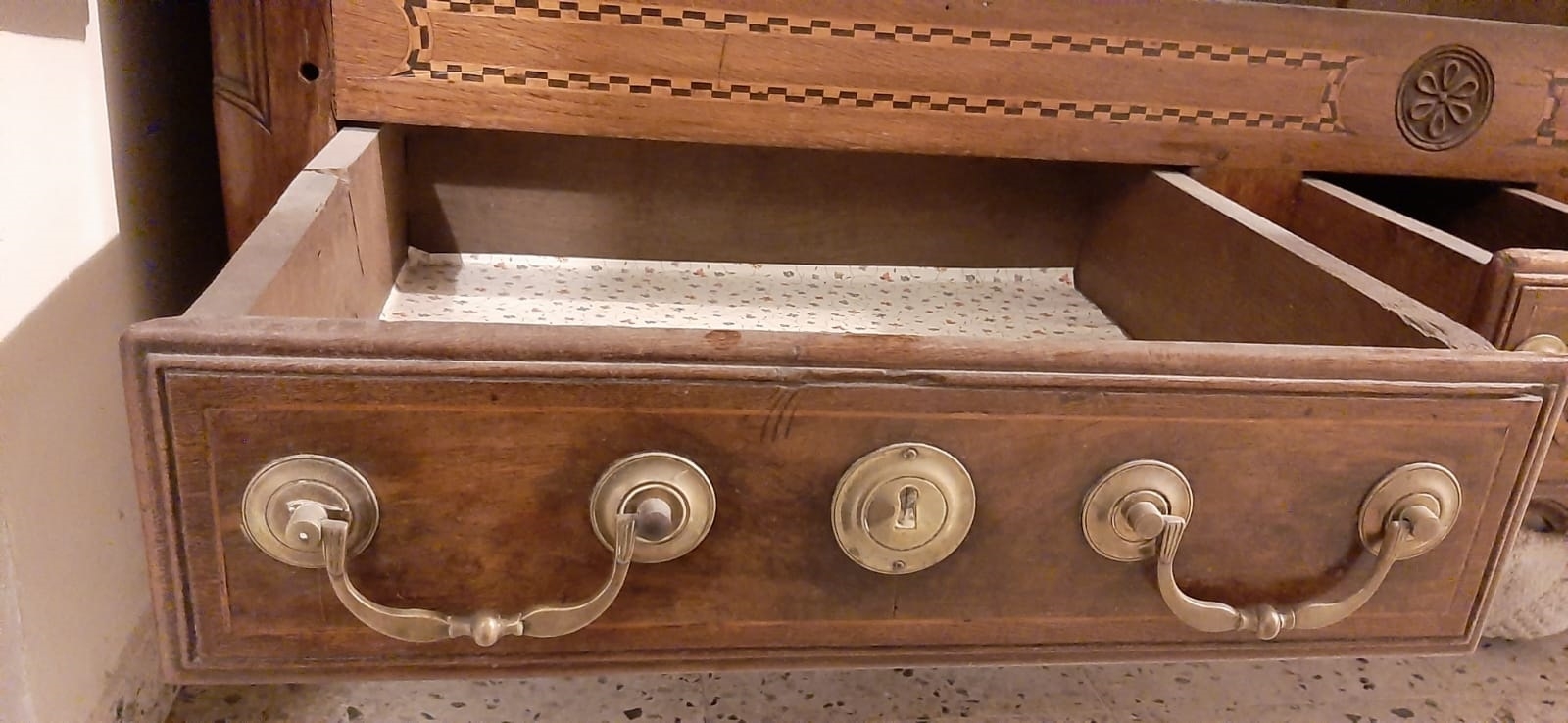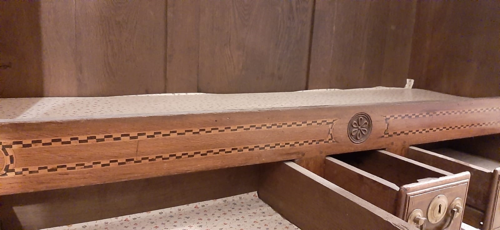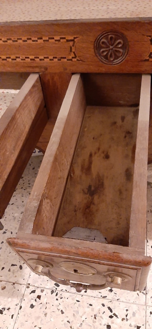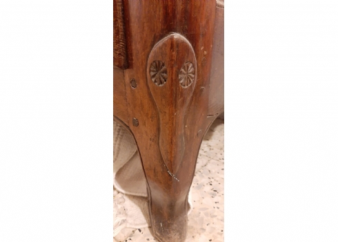 ארון בגדים ישן בסגנון עתיק, כפי הנראה גרמני או איטלקי, עשוי עץ ומעוטר עבודת שיבוץ 'פרקטרי' ועיטורים מגולפים בסגנון המאה ה-18, פגם לפינה (מצולם בתקריב), מפאת גודלו ומשקלו הושאר הארון בדירה בירושלים והזוכה בו מתחייב לפנותו מהדירה על חשבונו בתיאום עם בעל הדירה, מידות, גובה: 234 ס"מ, רוחב החזית: 164 ס"מ, עומק: 51 ס"מ.