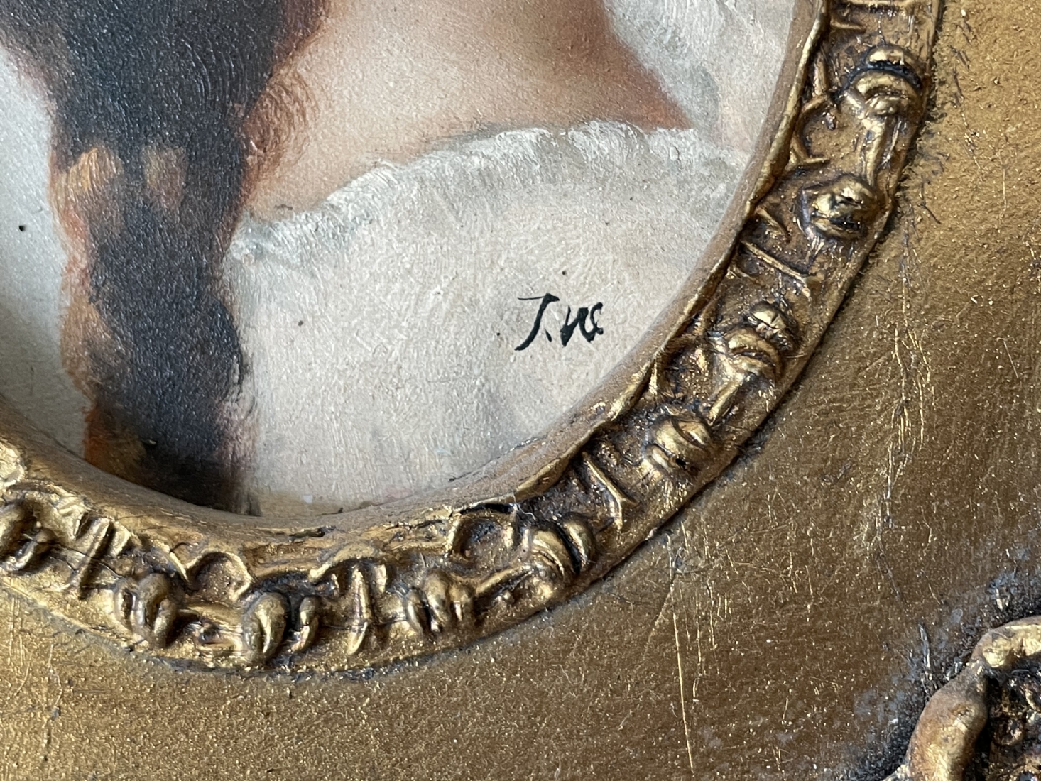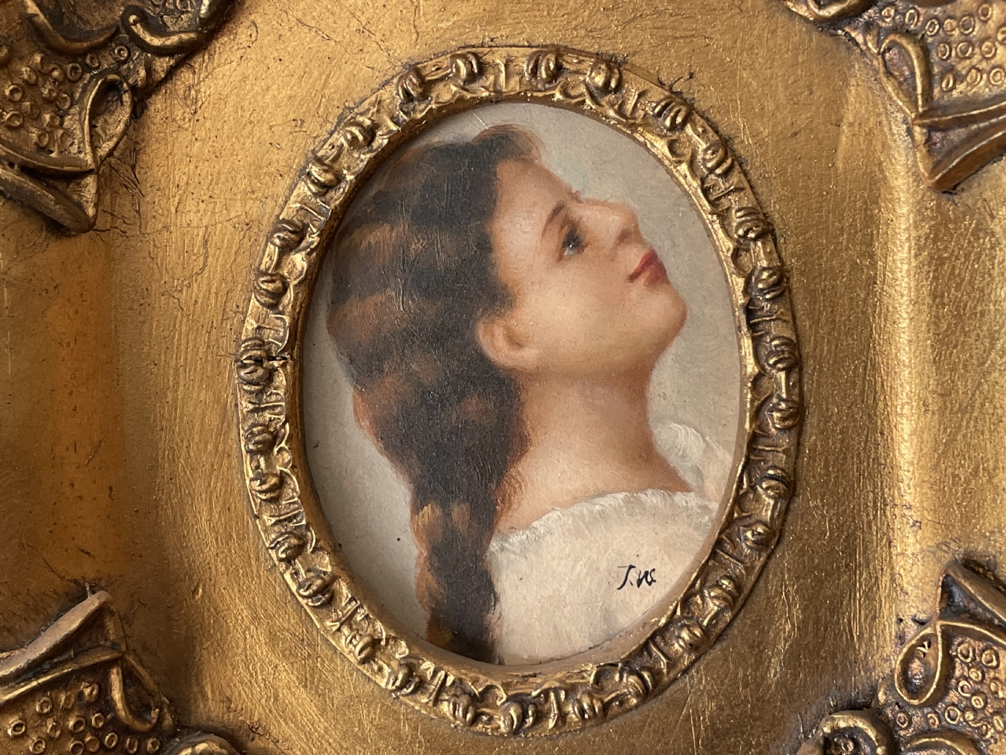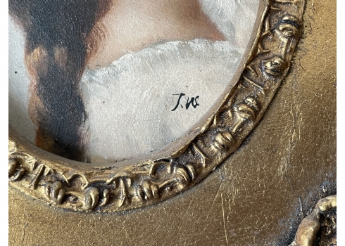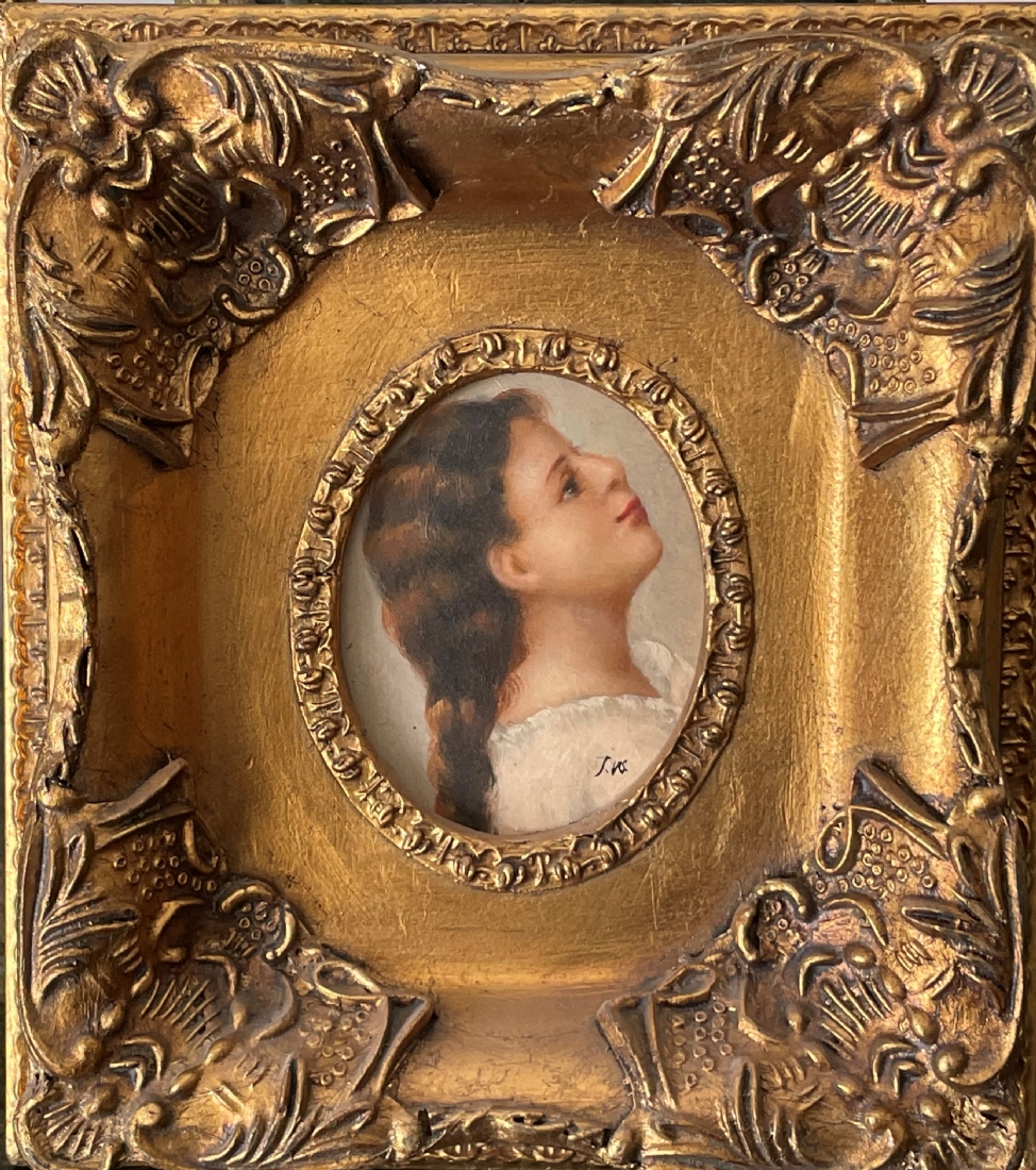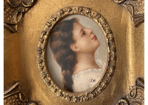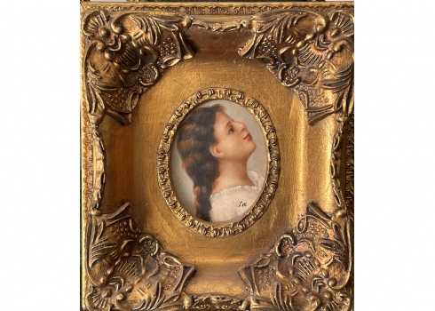פורטרט 'ילדה בחולצה לבנה'- ציור בסגנון עתיק, שמן על לוח, חתום, נתון במסגרת נאה, מידות המסגרת: 20X19 ס"מ.