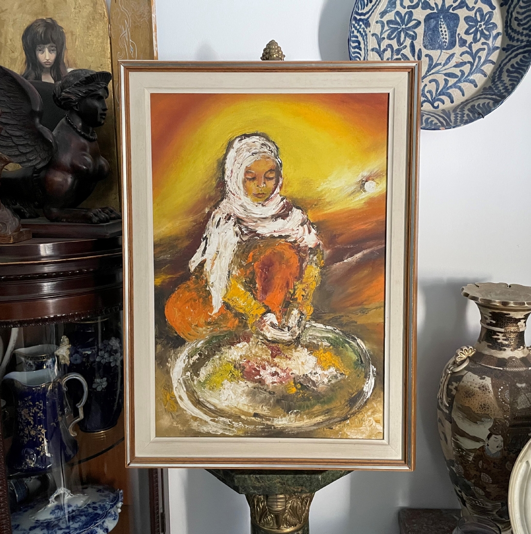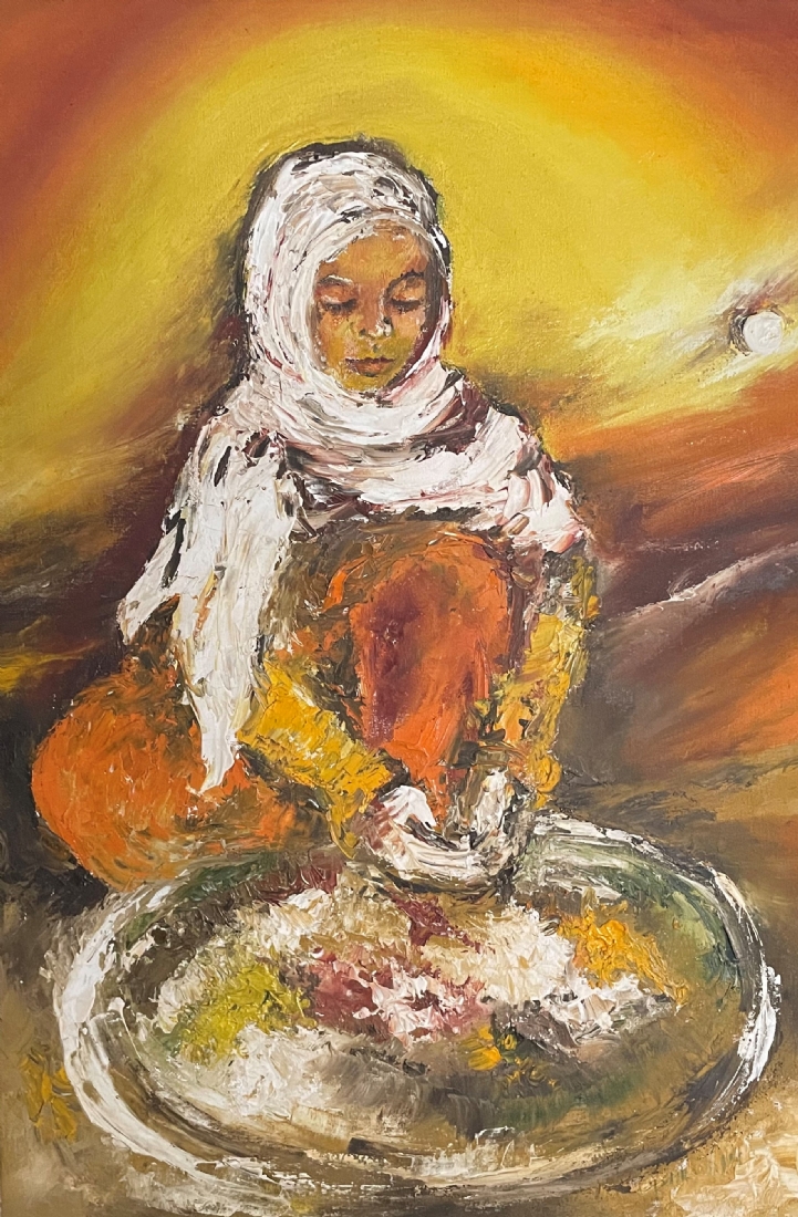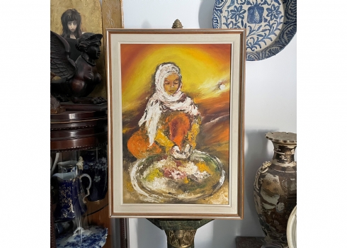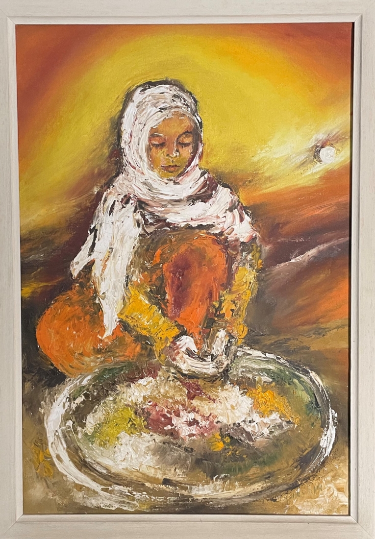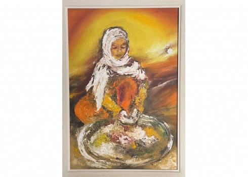 זיוה ראובני - 'אישה ערביה מבשלת' - ציור ישן, שמן על בד, חתום