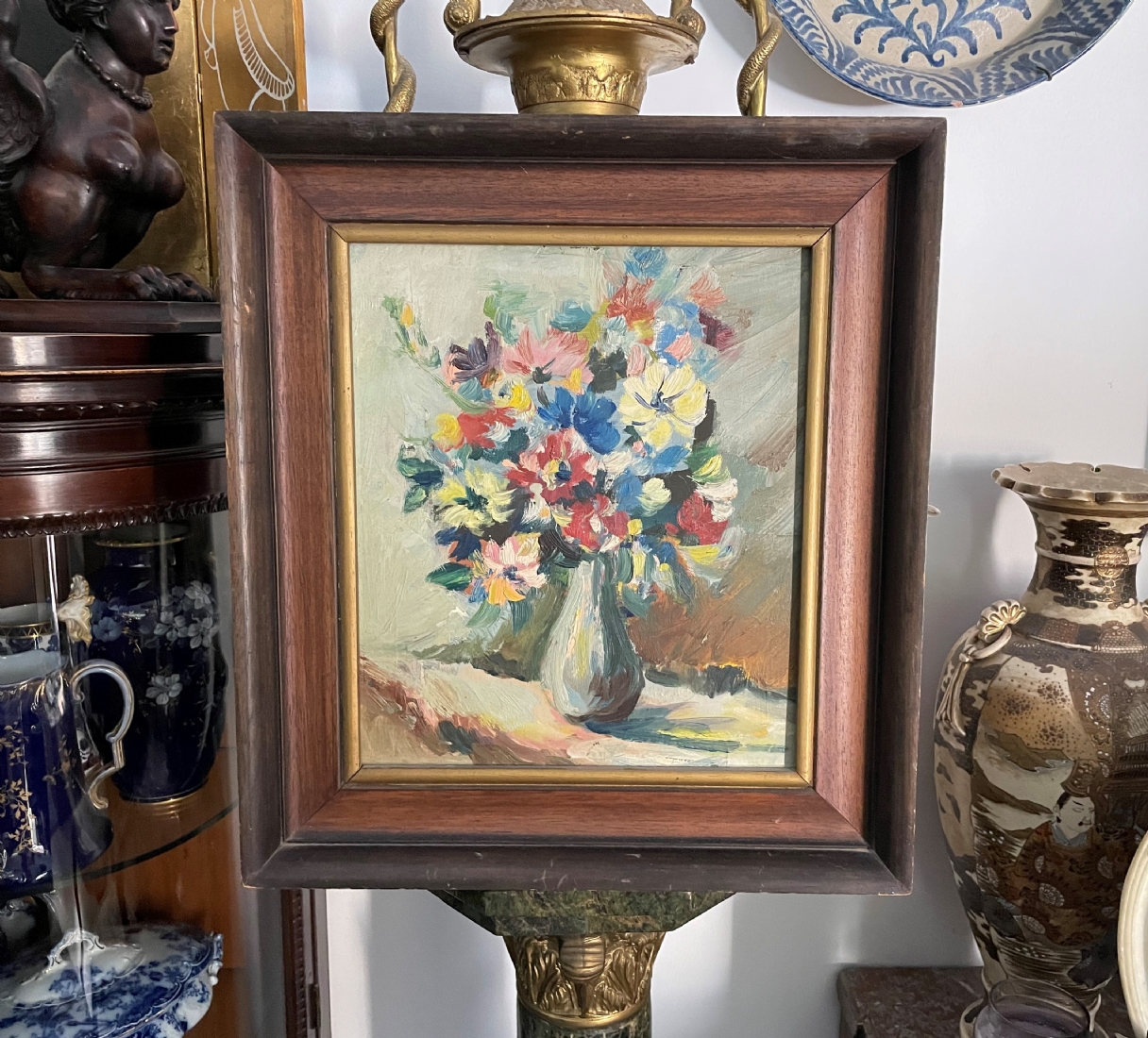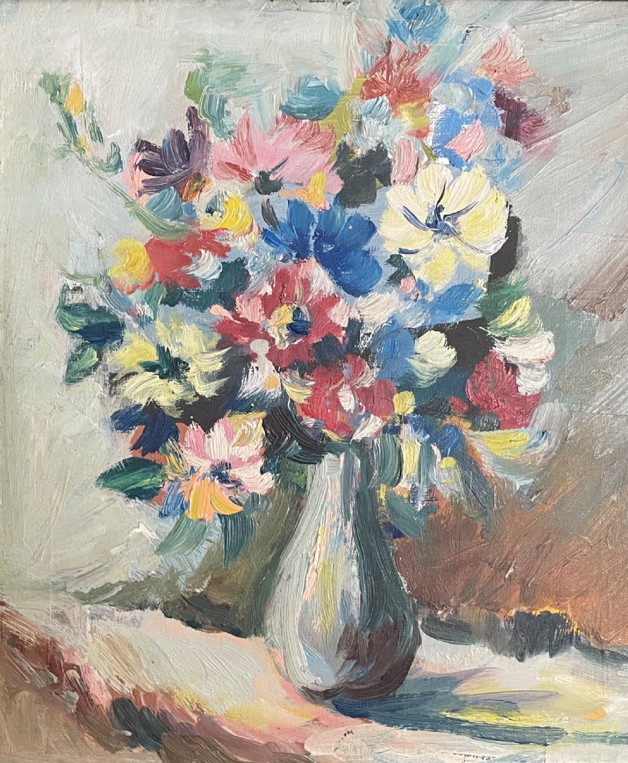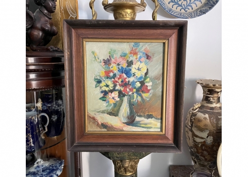 'פרחים באגרטל' - ציור ישן, שמן על בד צרפתי, אמן לא ידוע, לא חתום, מידות: 34X29 ס"מ.