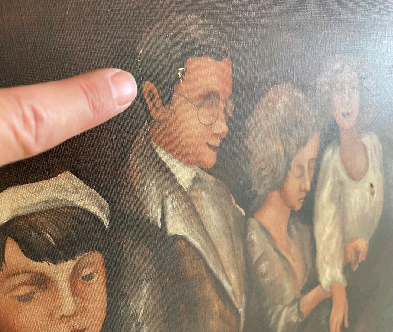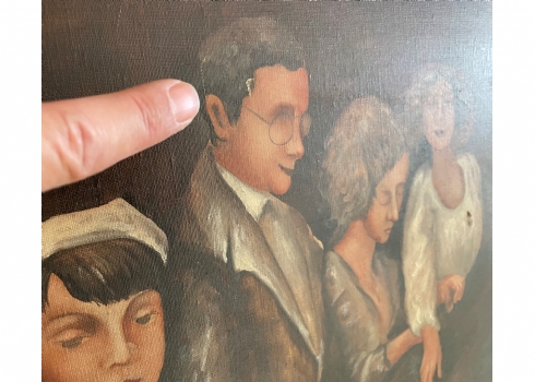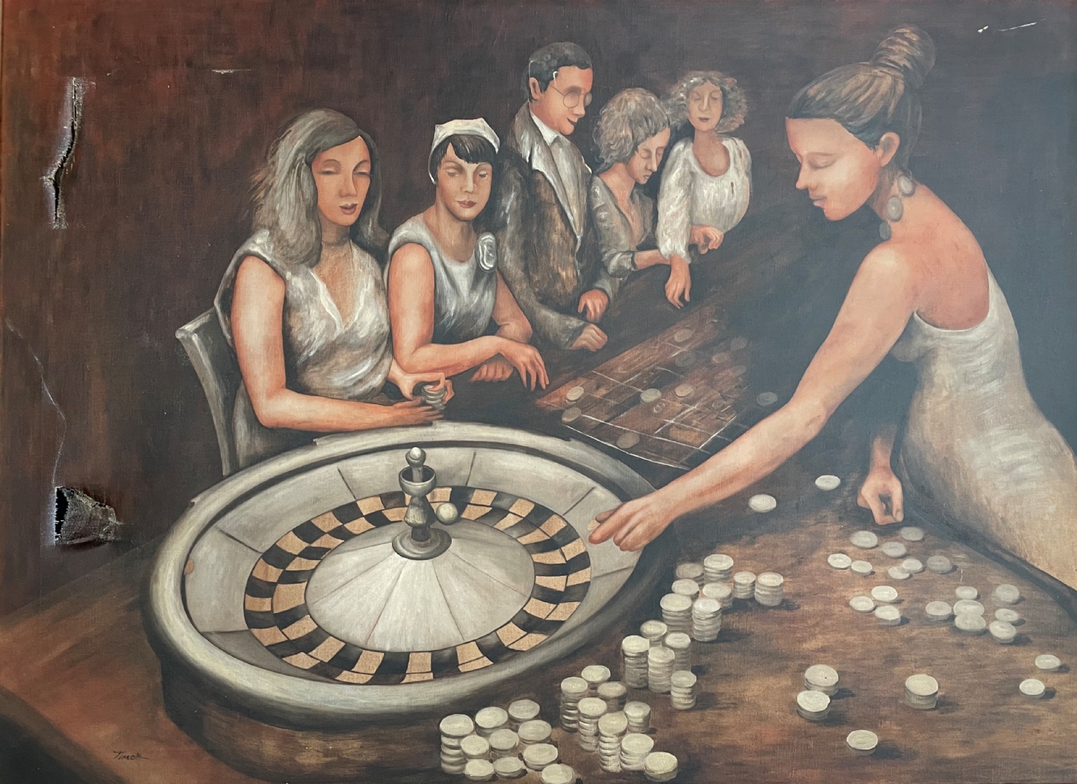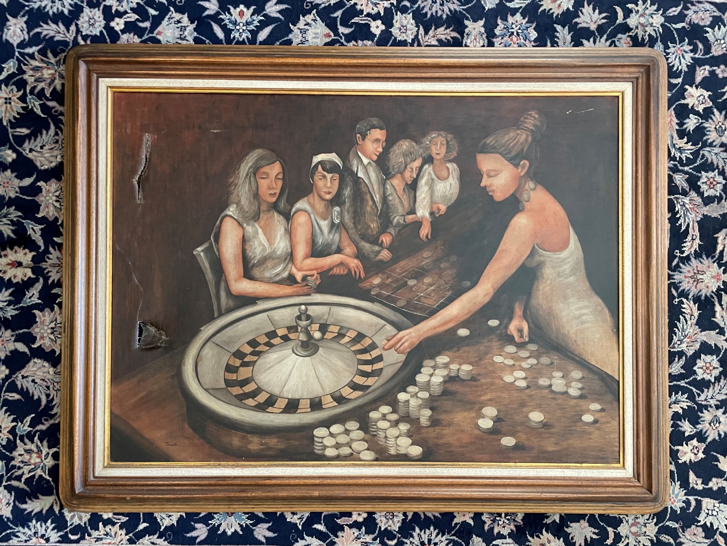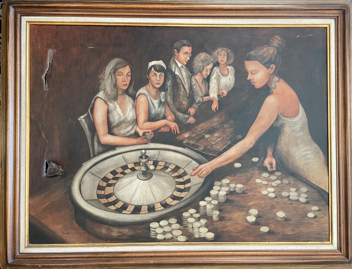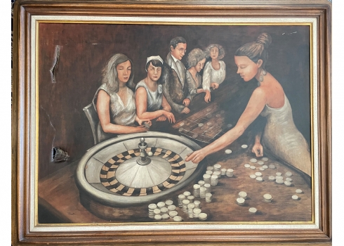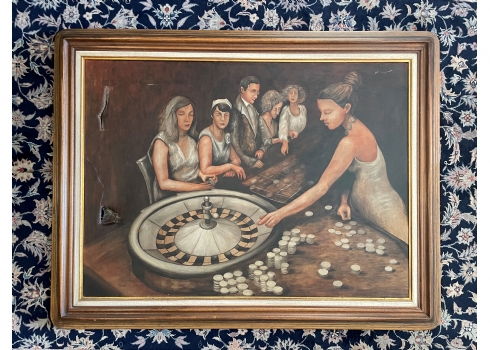 רחל טימור (Rachel Timor) - 'שחקני הרולטה' - ציור גדול, שמן על בד, פגום (מצולם), מידות: 75X100 ס"מ.