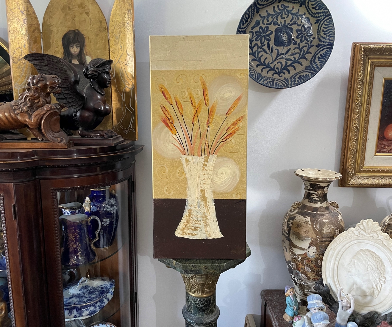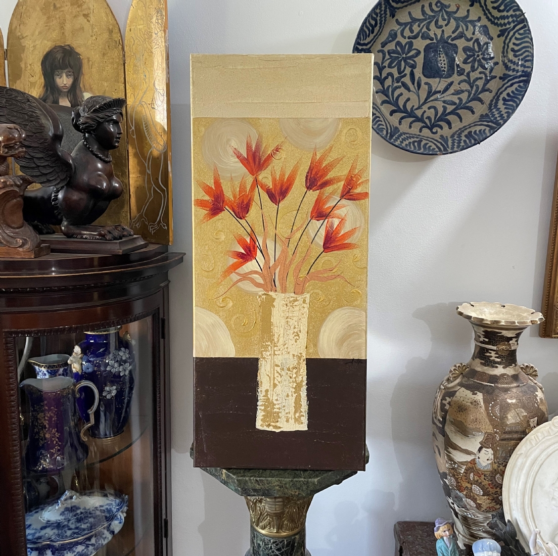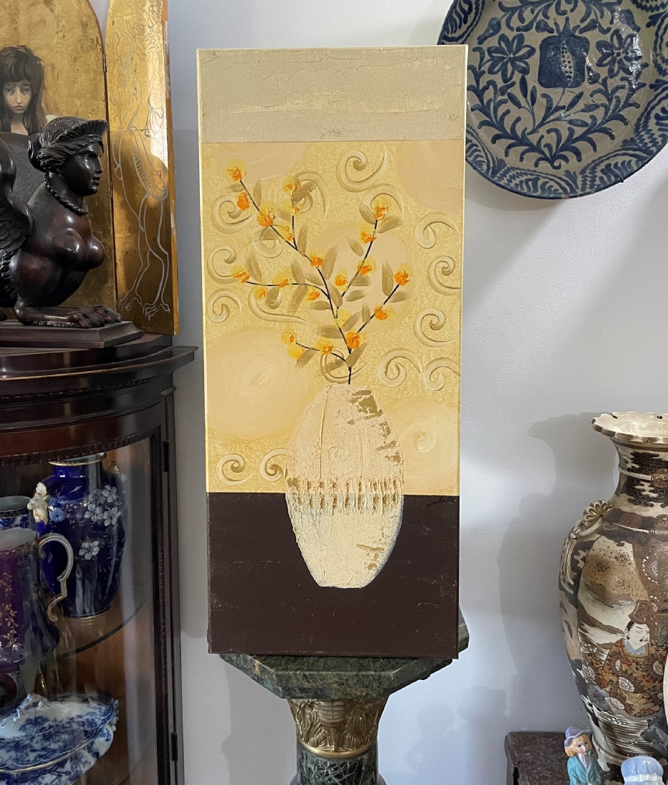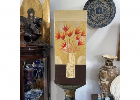 סט של 3 תמונות דקורטיביות מלבניות, שמן על בד, לא חתום, מידות כל תמונה: 70X30 ס"מ.