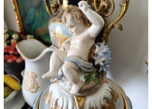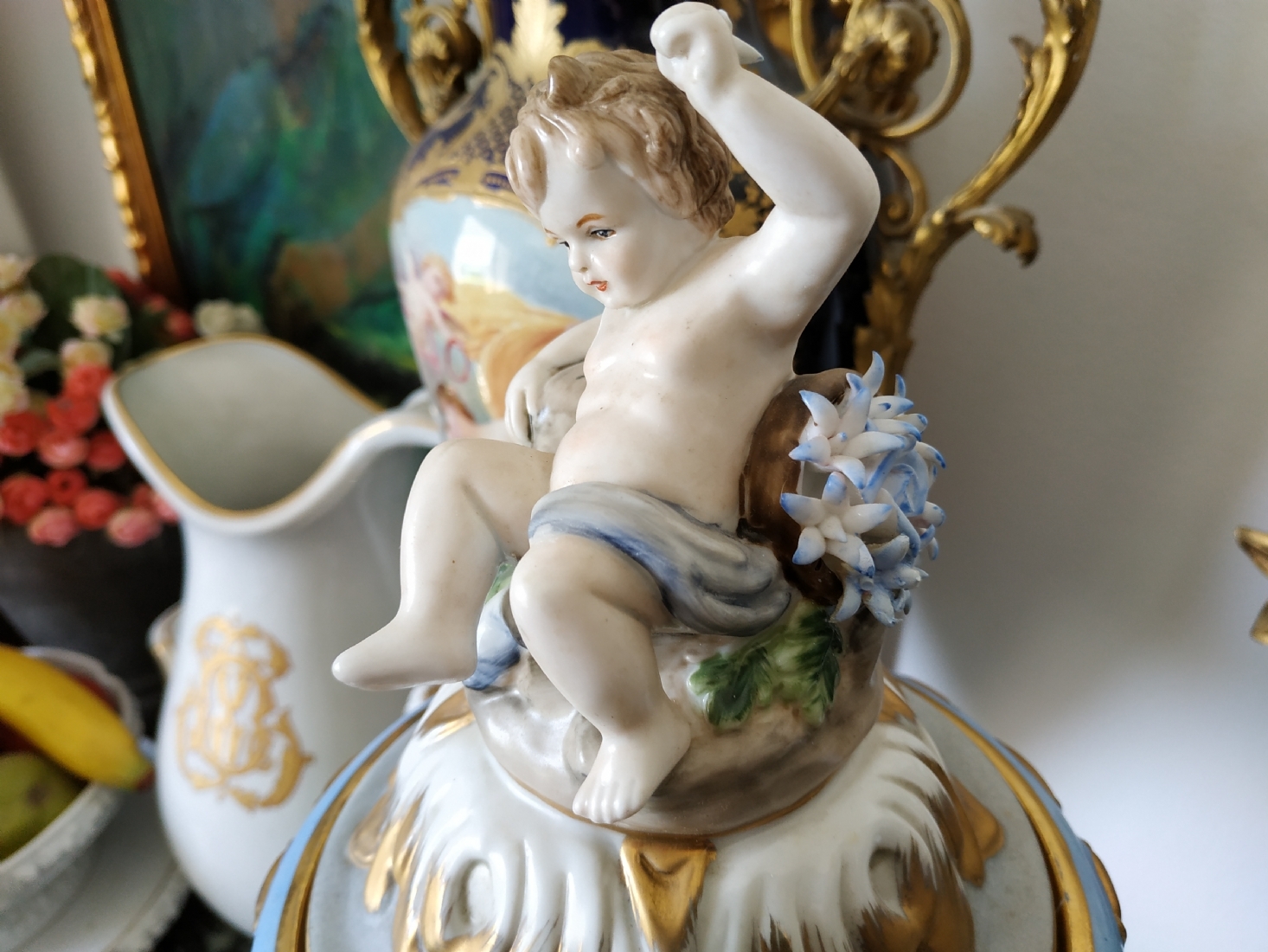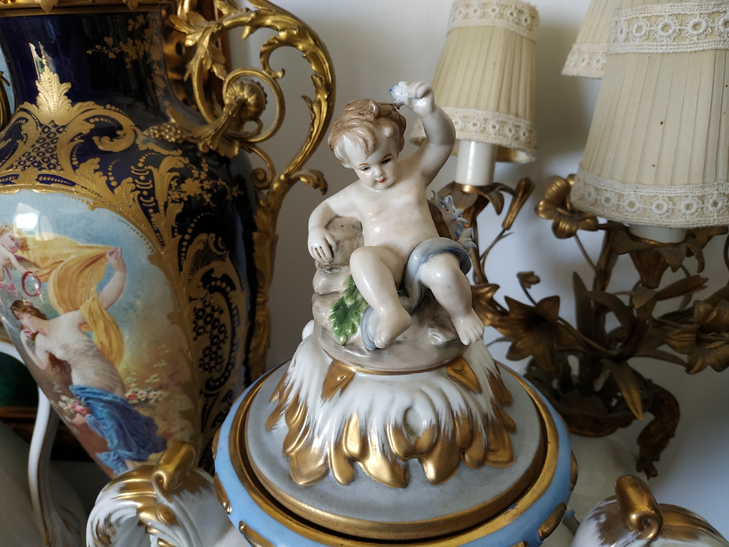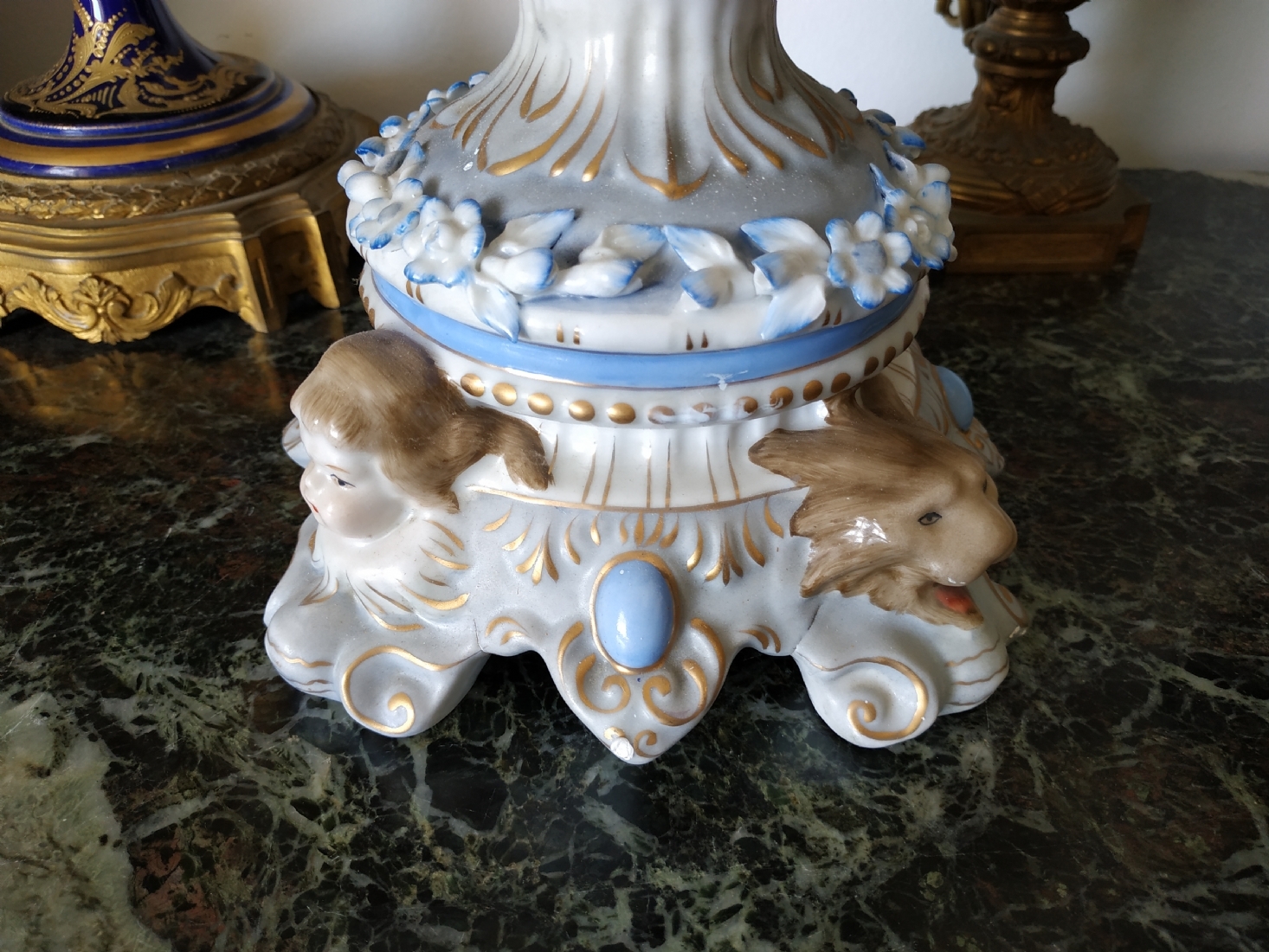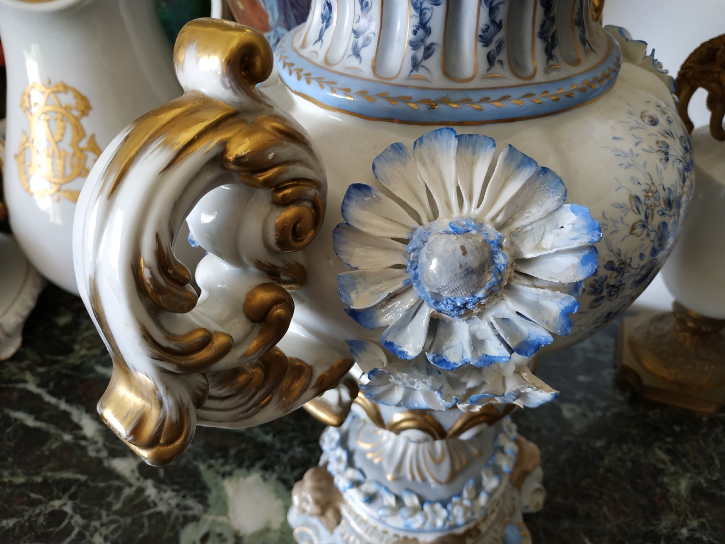 אגרטל פורצלן גדול, מפואר ומרשים במיוחד, פגם וחוסר באחד מעלי הכותרת ותיקון ישן לרגל (מצולם), יתכן וישנם תיקונים לחלק מעלי הכותרת, חתום, גובה: 57 ס"מ.