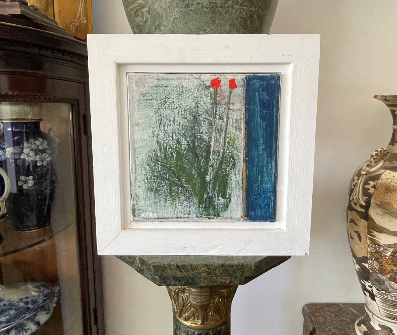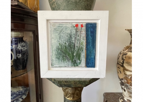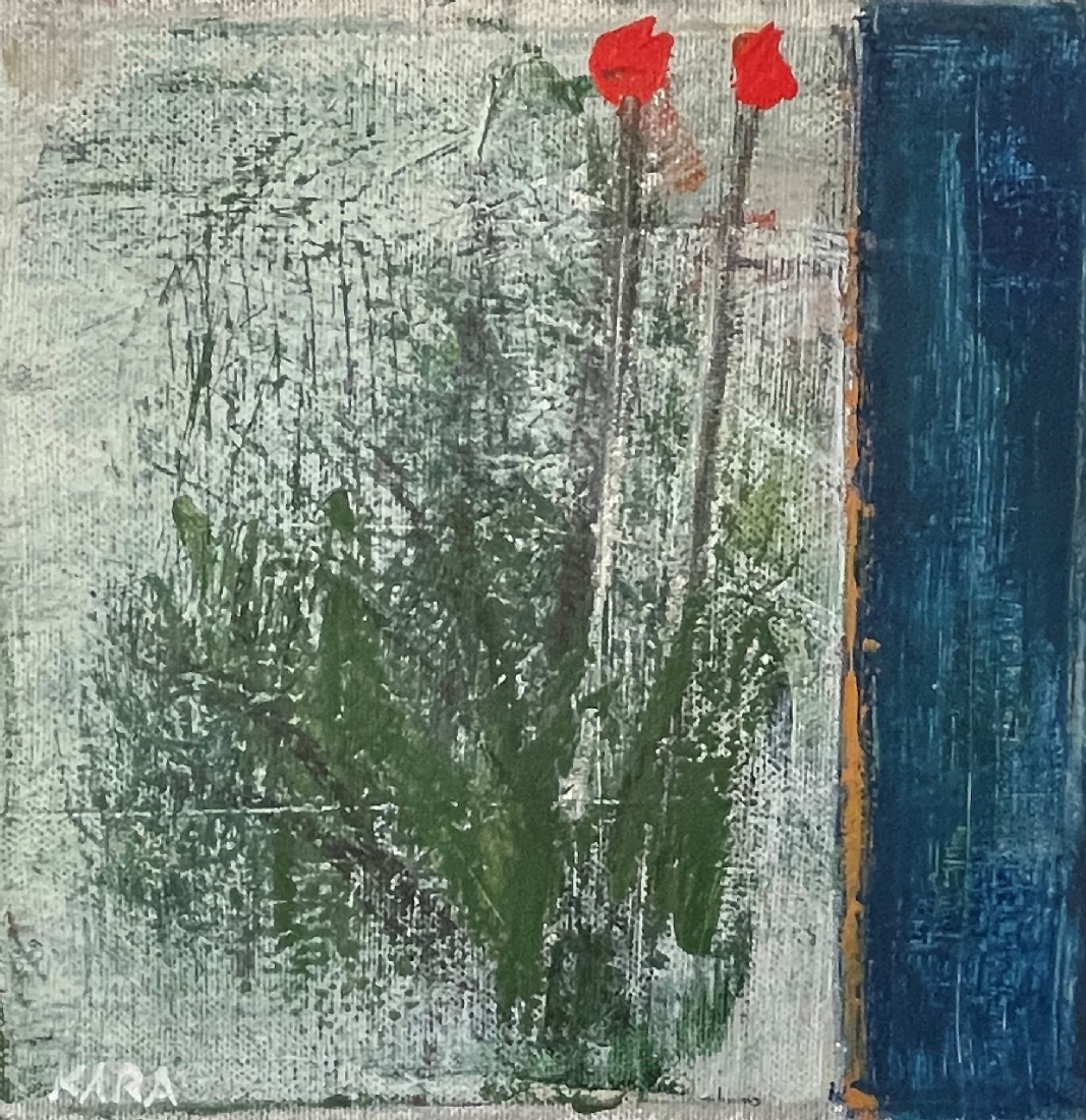 סאלח אלקרא - 'שני פרחים אדומים' - שמן על בד, חתום, מידות: 20X20 ס"מ.