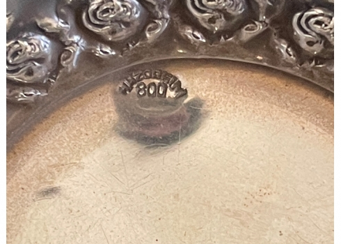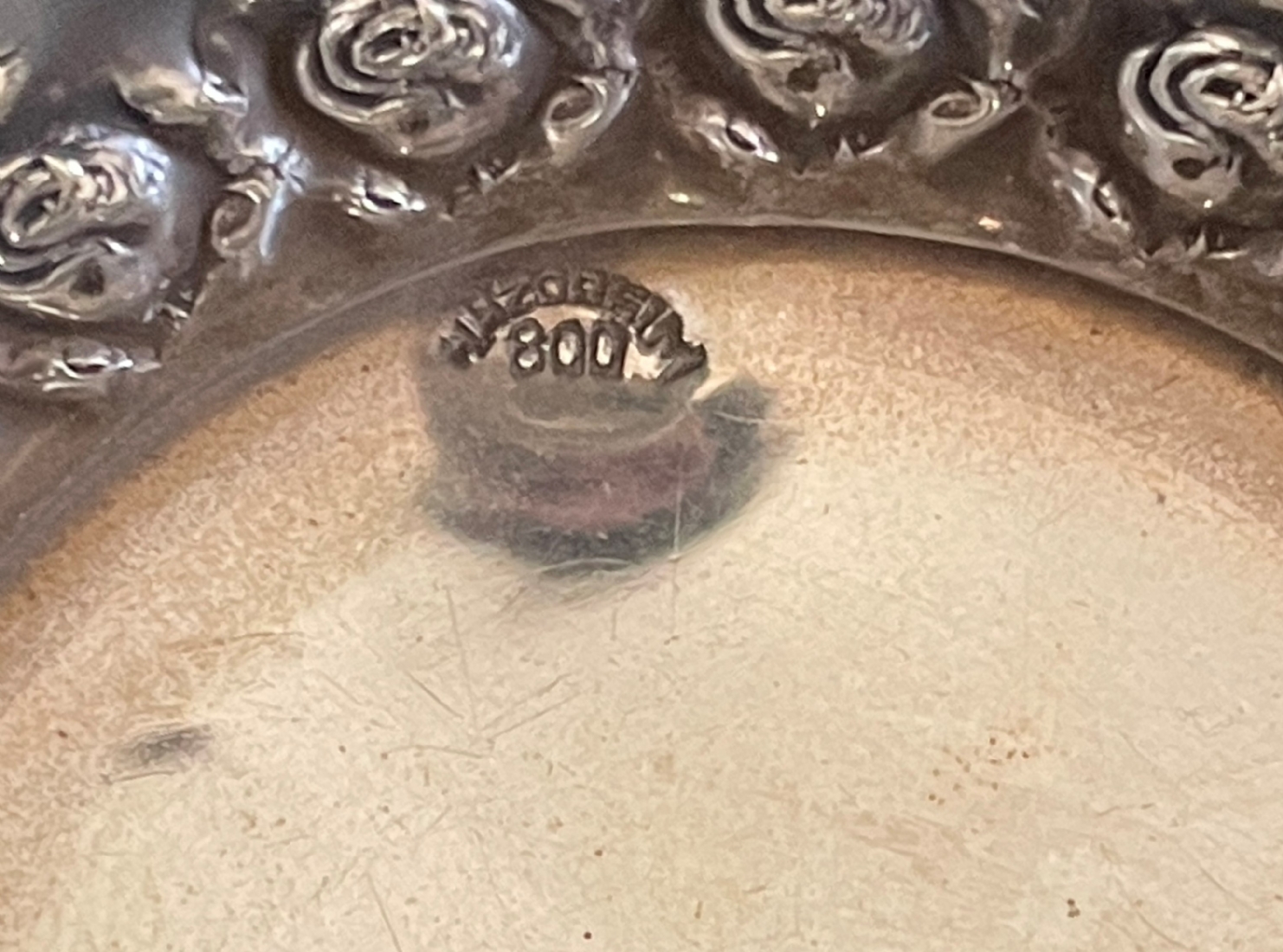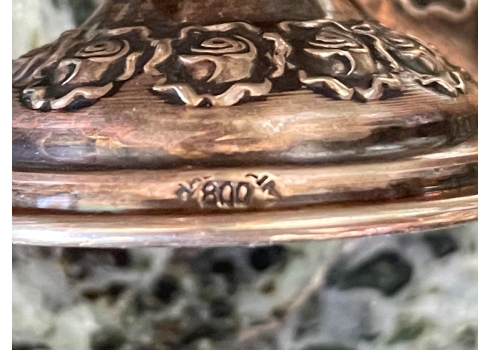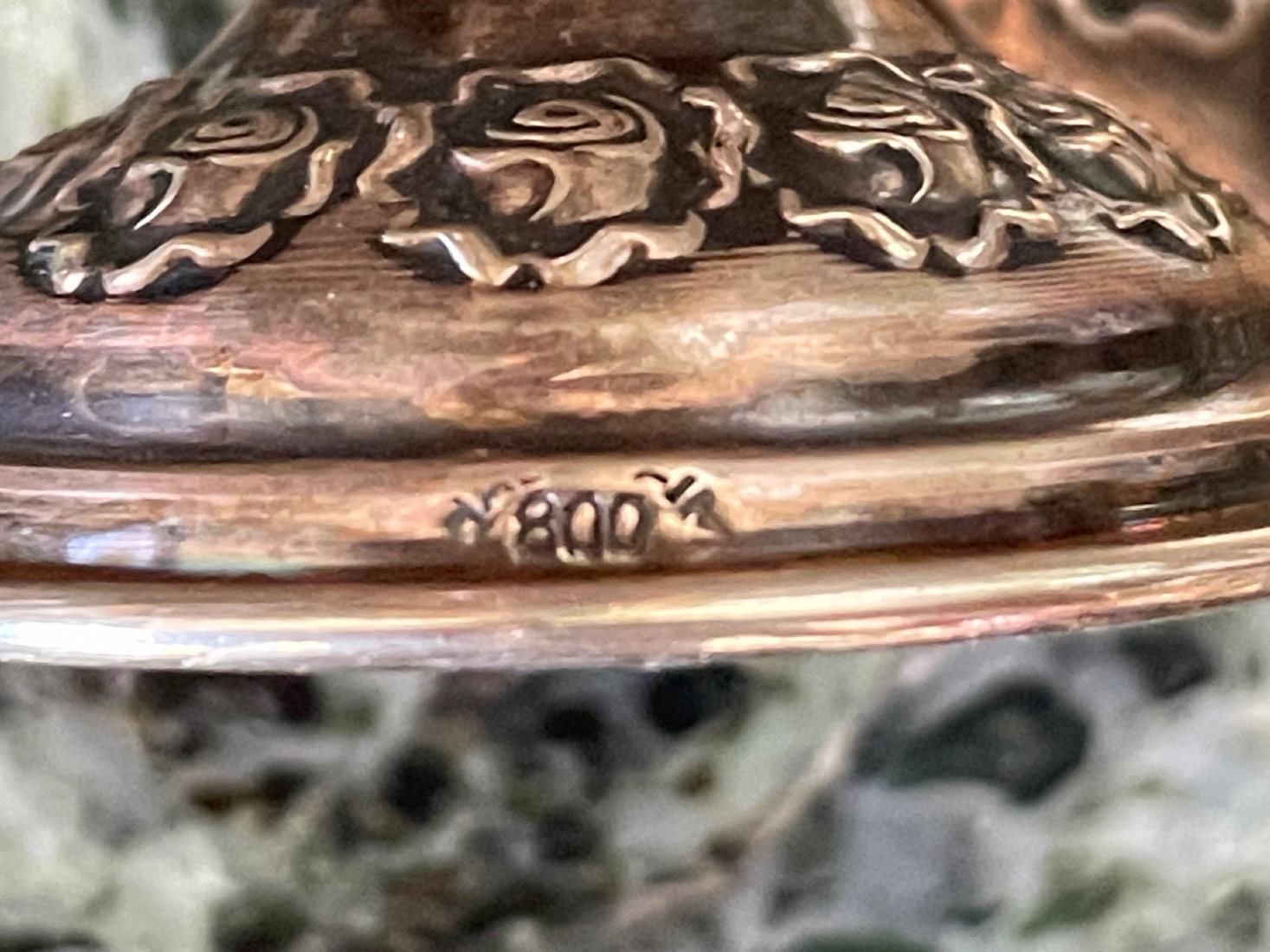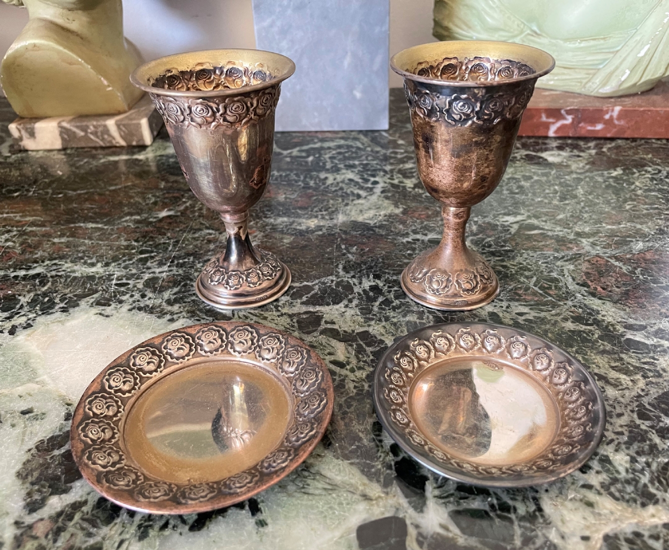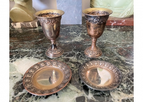 לוט של 4 פרטי כסף ישנים (זוג גביעים לקידוש ותחתיות תואמות) עשויים כסף '800', חתומים, משקל כולל: 81 גרם סה"כ, גובה גביע: 9.5 ס"מ, קוטר צלוחית: 8 ס"מ.