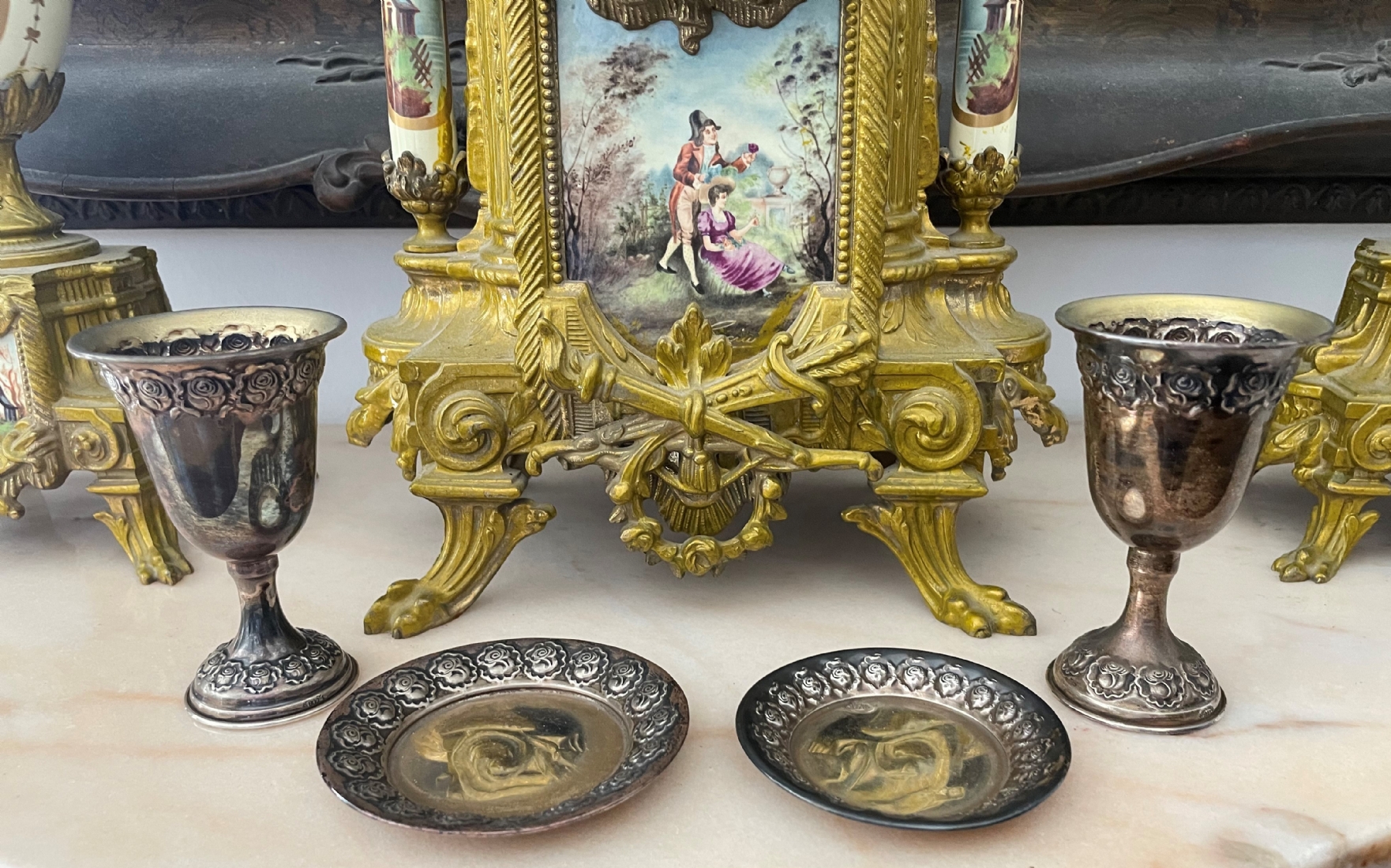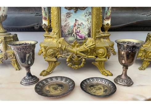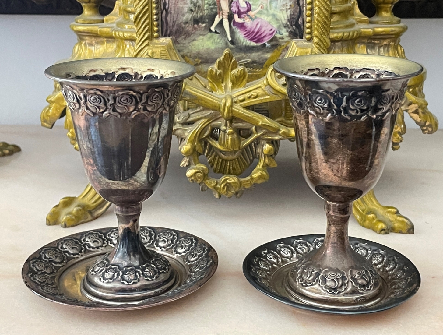 לוט של 4 פרטי כסף ישנים (זוג גביעים לקידוש ותחתיות תואמות) עשויים כסף '800'