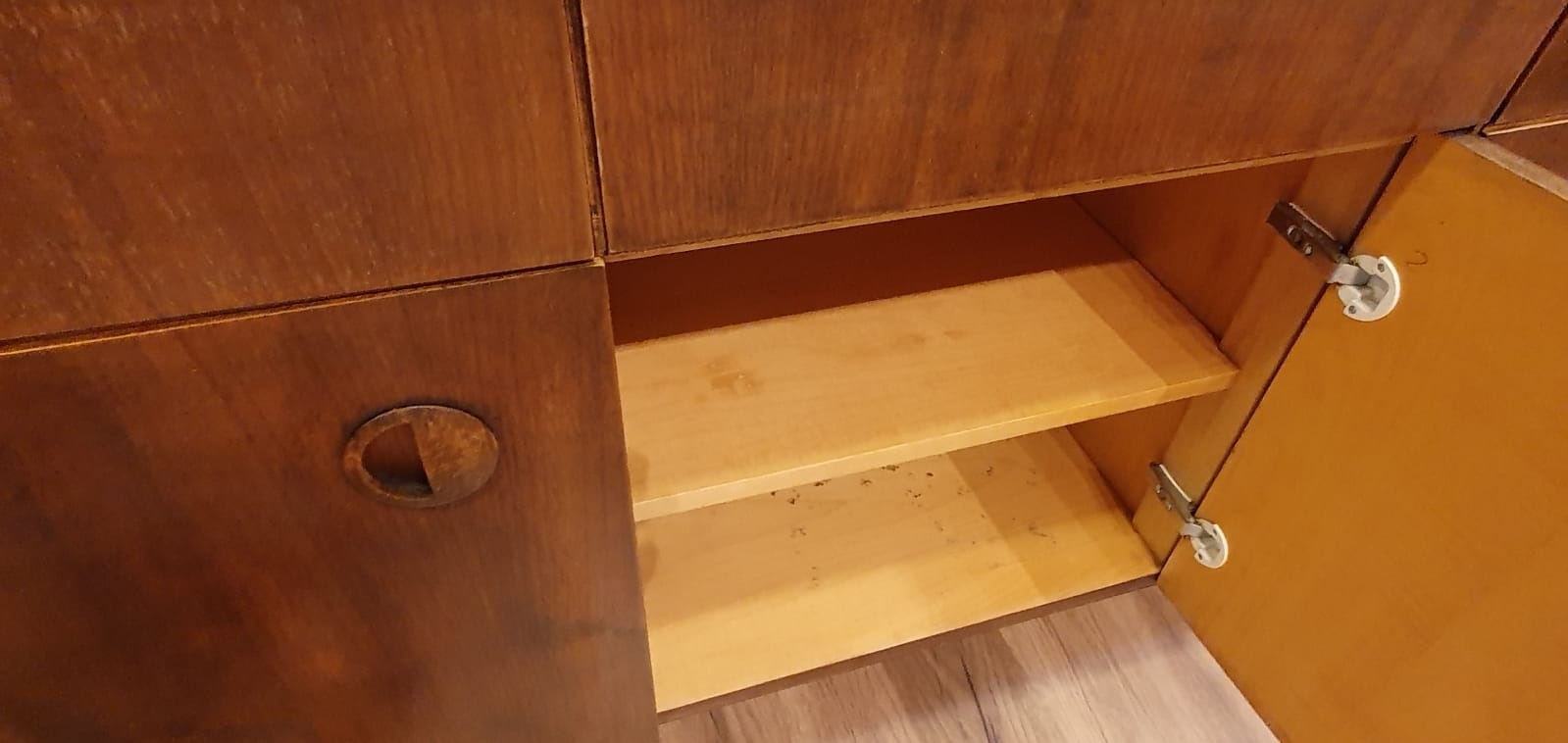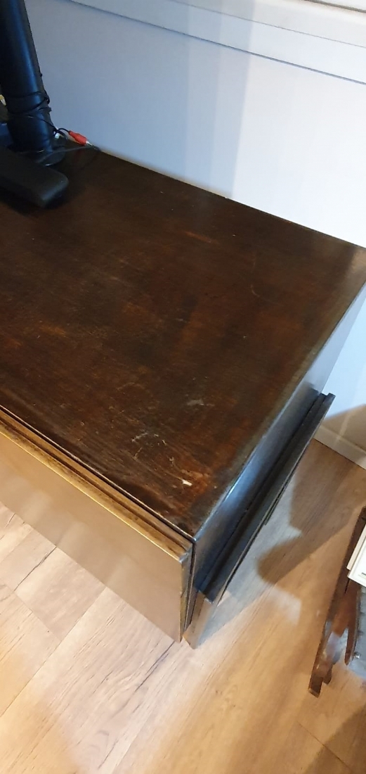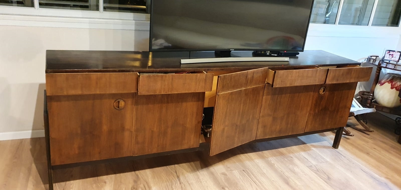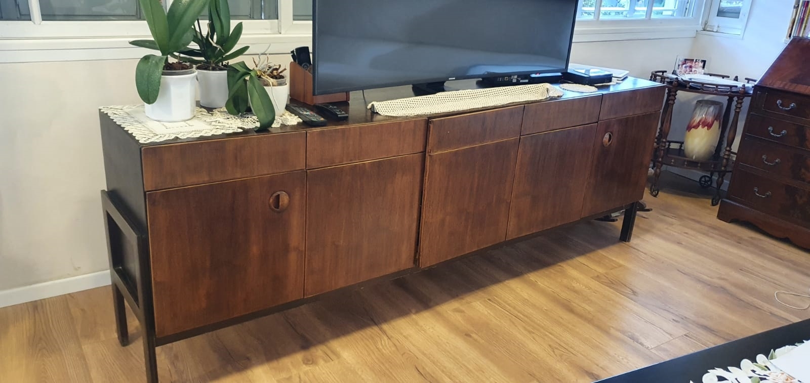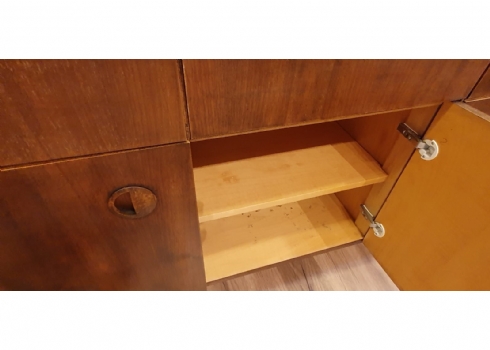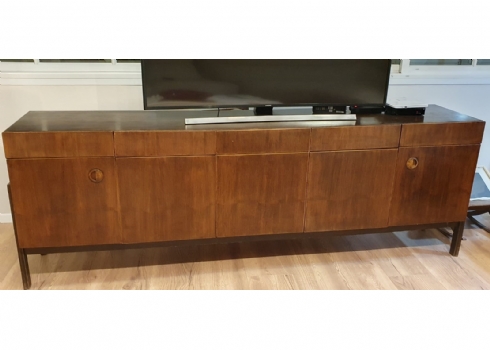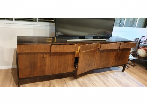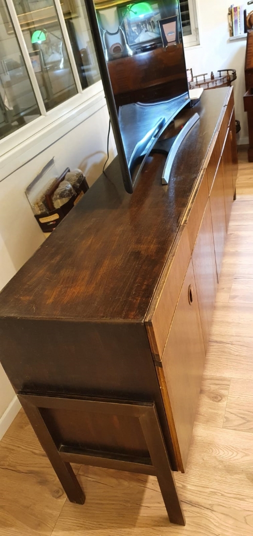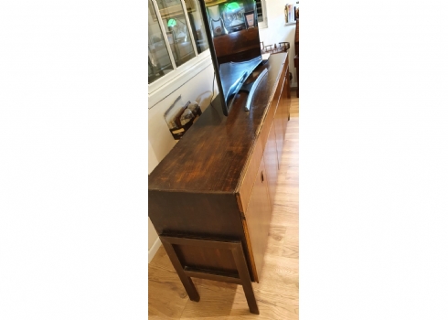 מזנון רומני וינטג' משנות ה-50, עשוי עץ, רוחב 46 ס"מ, אורך: 227 ס"מ, גובה: 80 ס"מ. (מפאת גודלו ומשקלו של הרהיט - הוא הושאר בדירה בתל אביב הזוכה בו מתחייב לפנותו מהדירה על חשבונו ובתיאום עם בעלי הבית).
