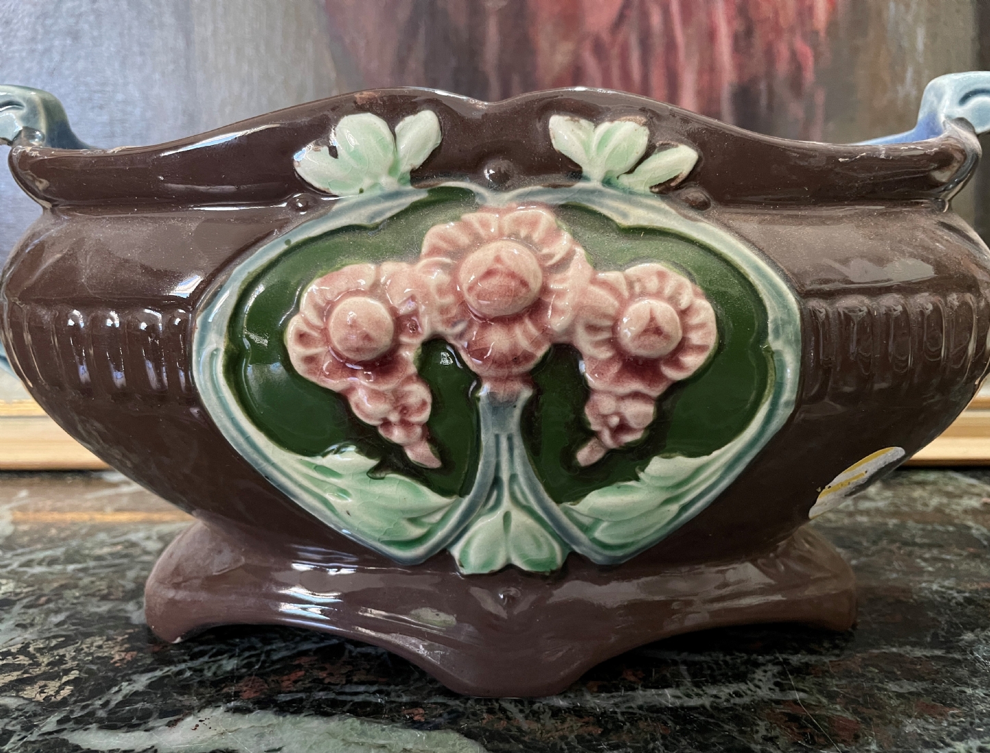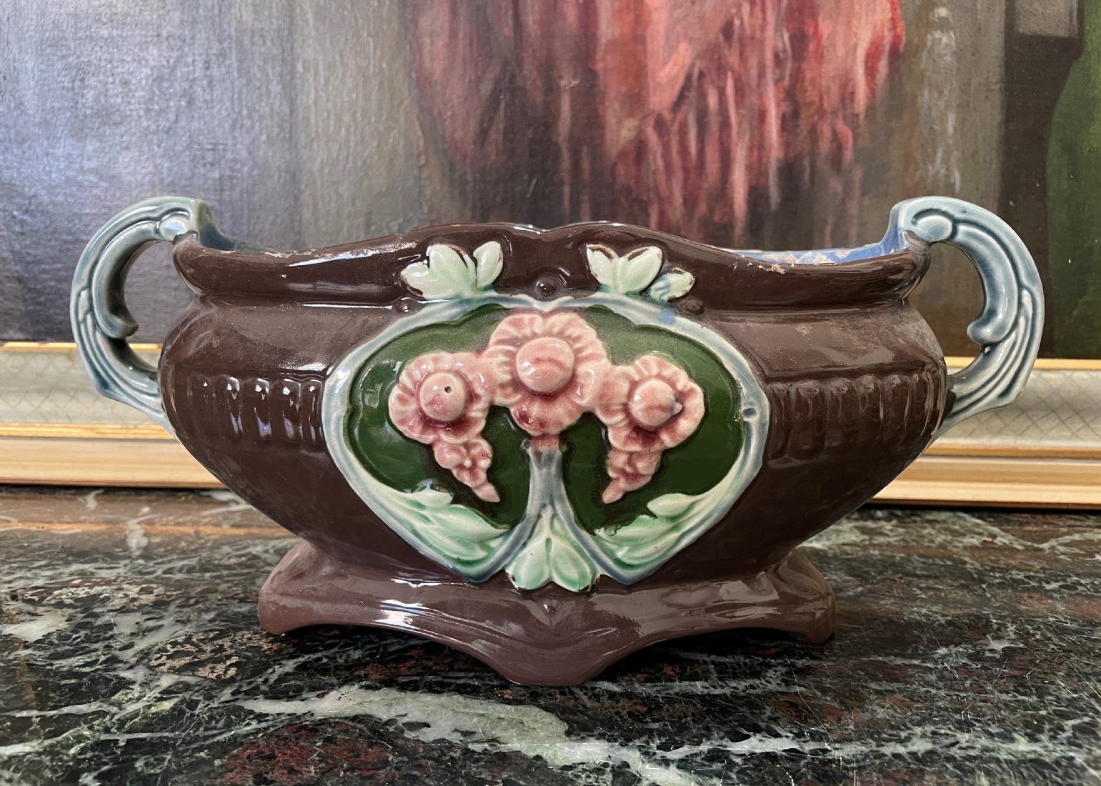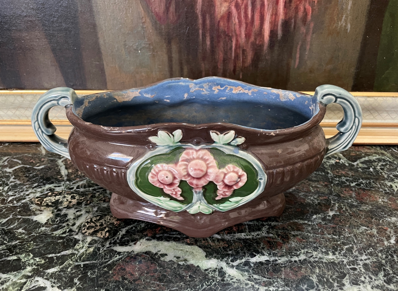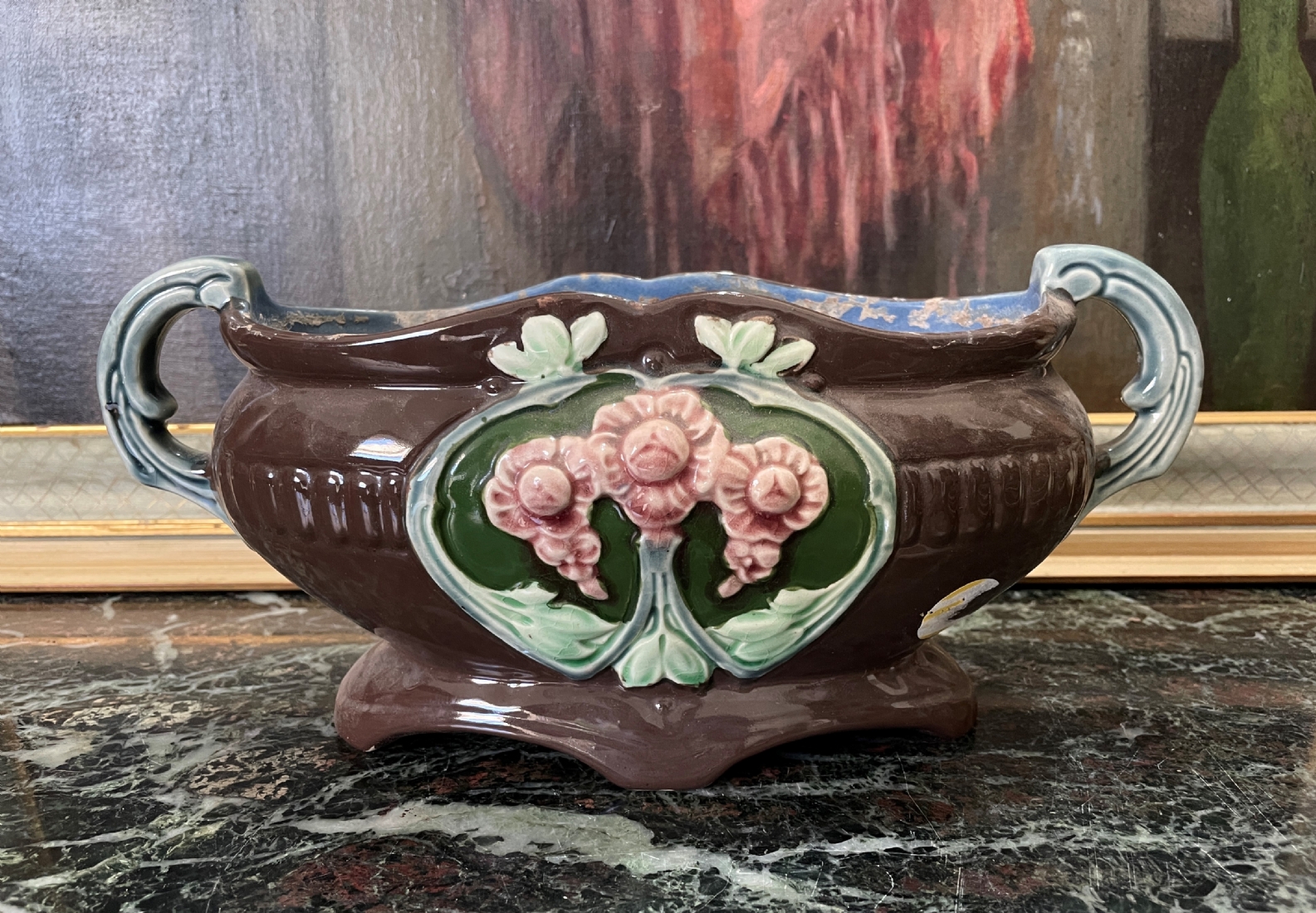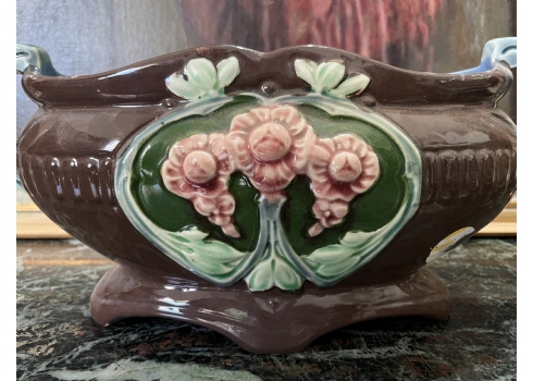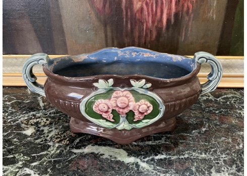 סנטרפיס עתיק ויפה, עשוי עשוי מג'וליקה (Majolica), חתום, כפי הנראה מתוצרת: 'Eichwald', הפנים צבוע כחול, גובה: 14.5 ס"מ, אורך כולל ידיות: 32 ס"מ.