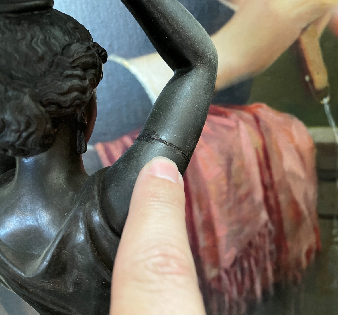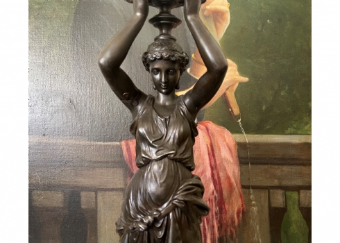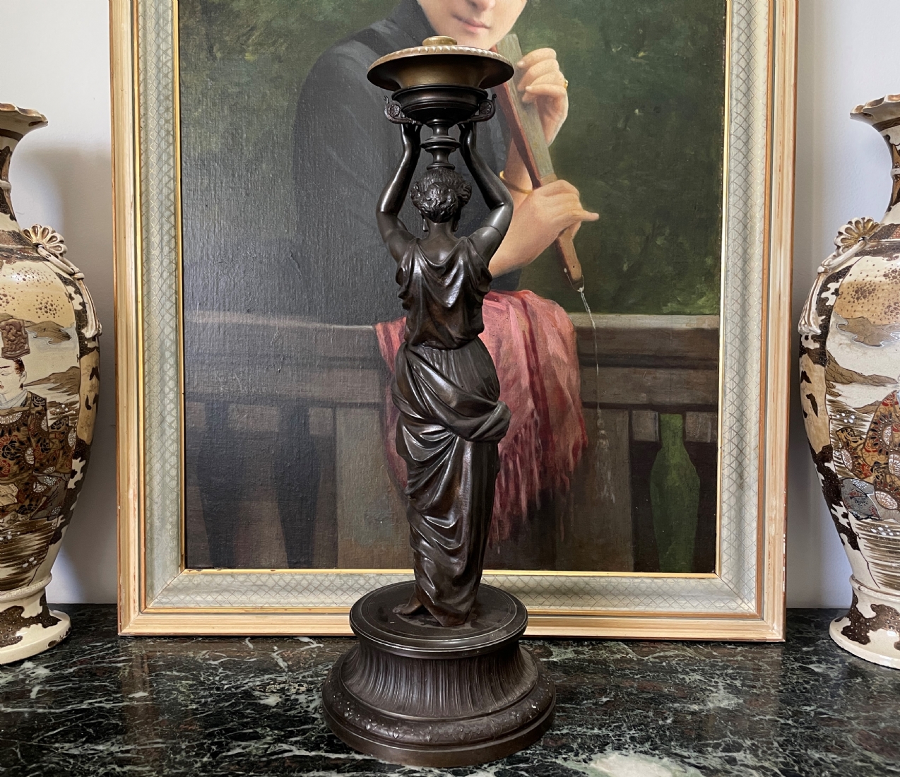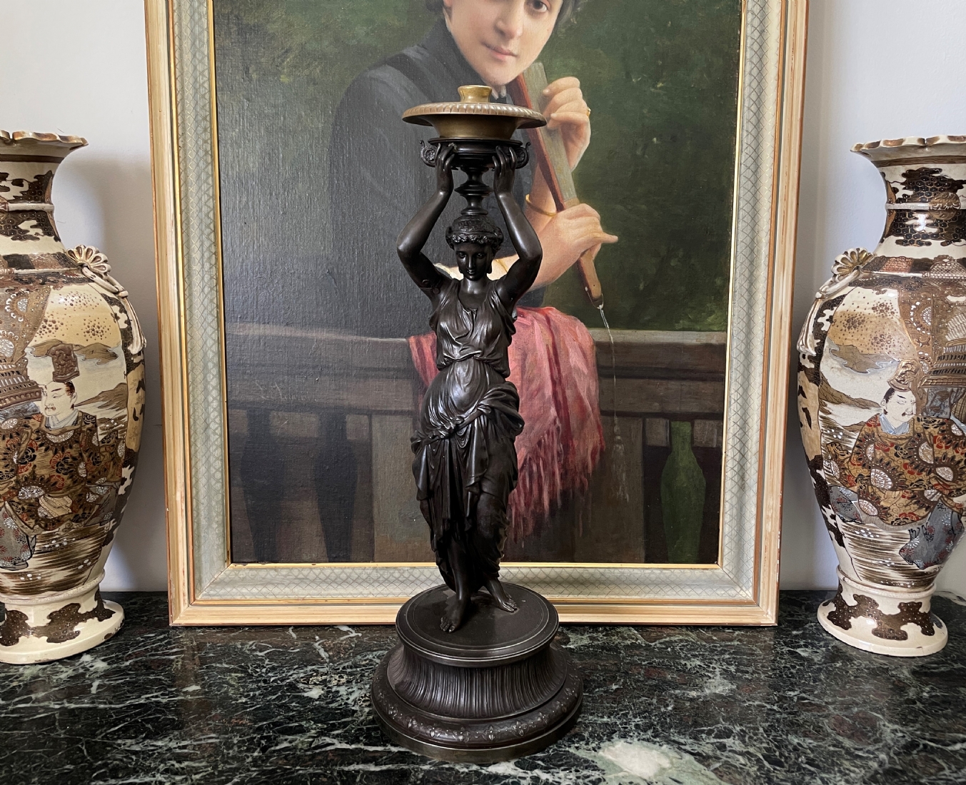 פמוט גדול בדמות קריאטידה (Caryatid), עשוי שפלטר, פאטינה דמויית ברונזה