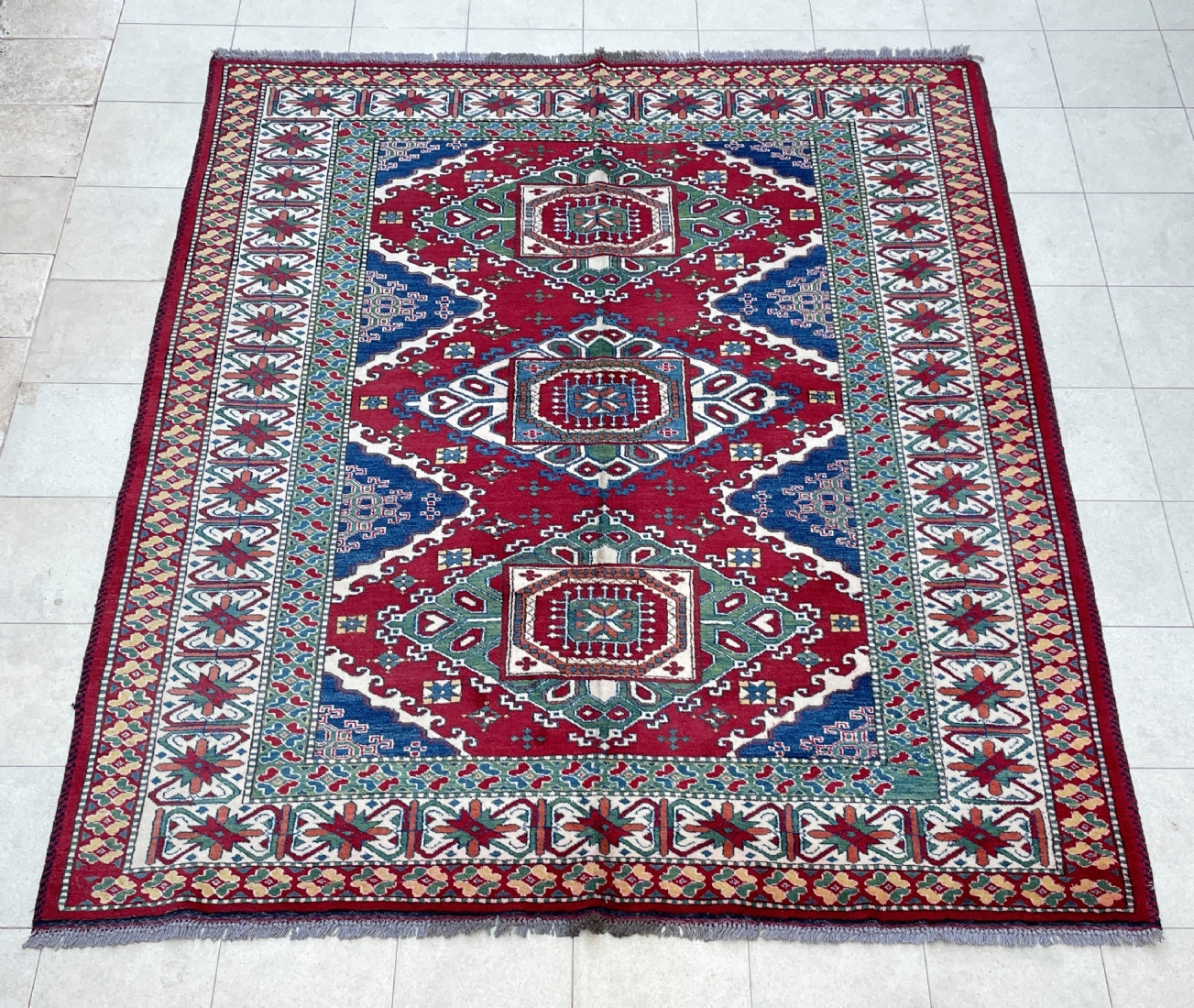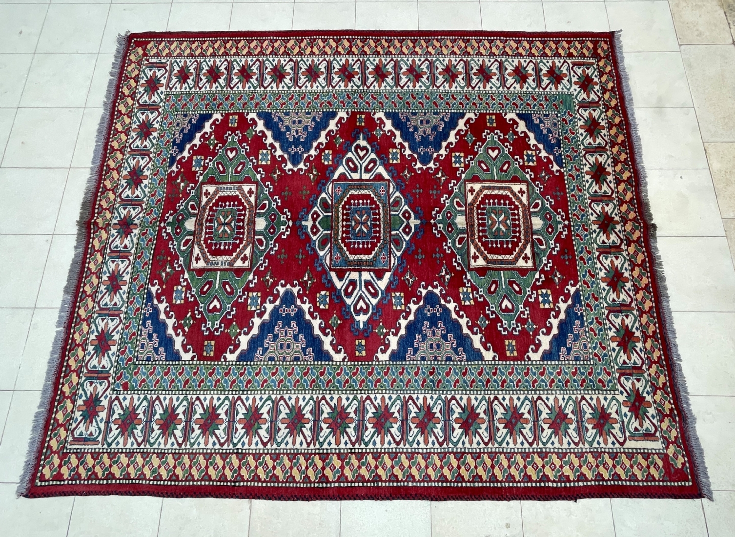 שטיח קווקזי, צמר על צמר, עבודת יד, מידות: 227X194.5 ס"מ