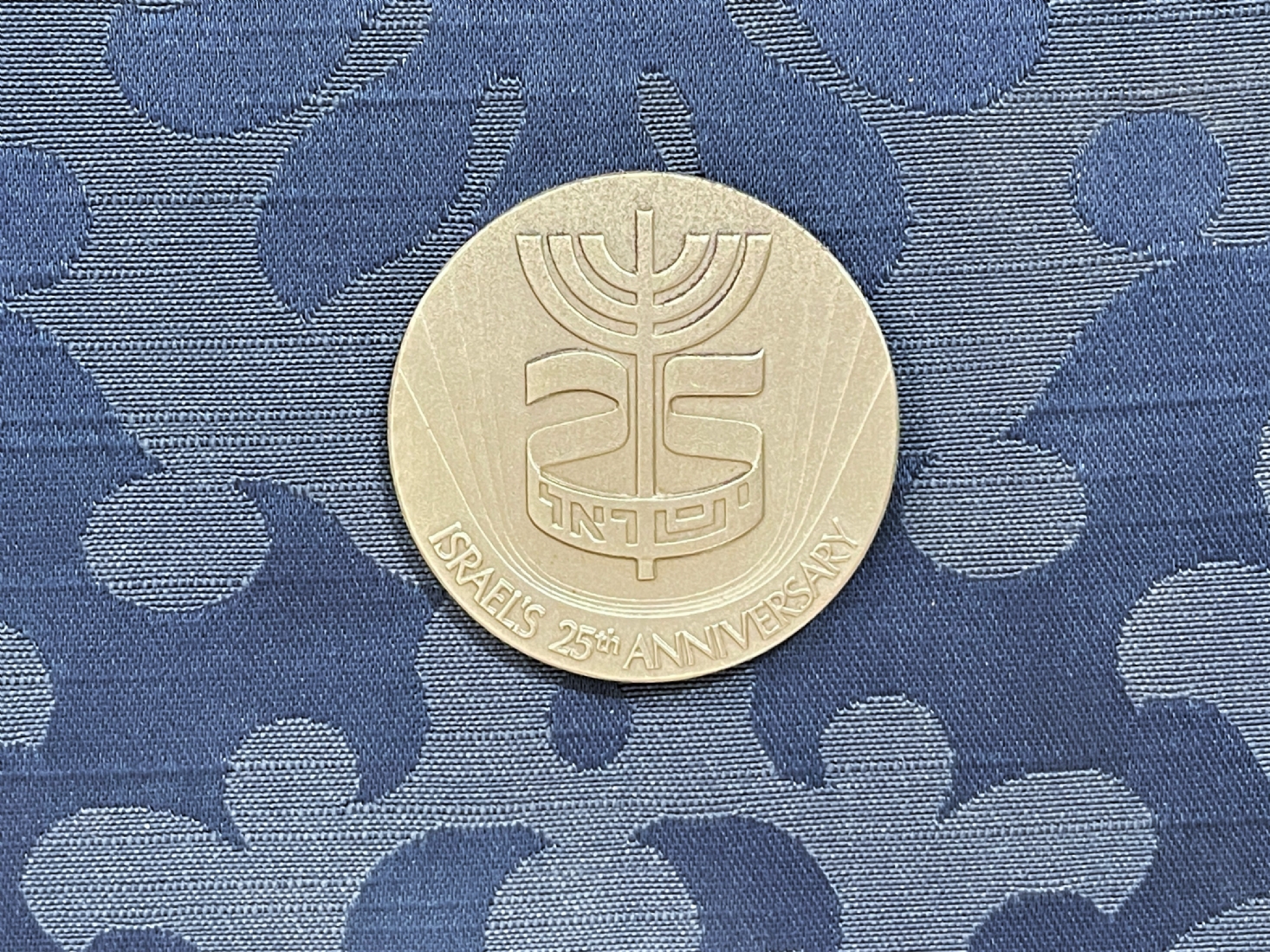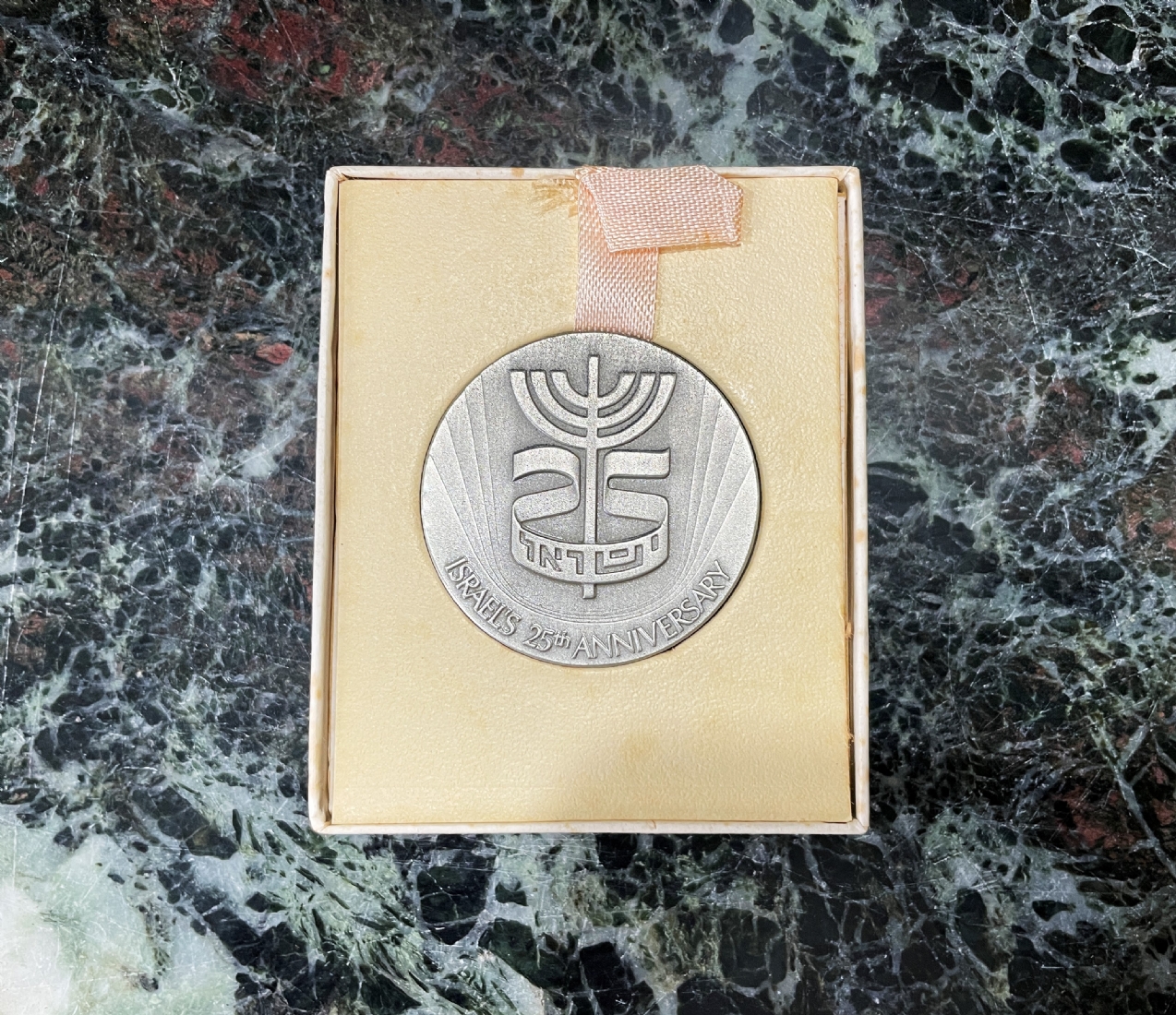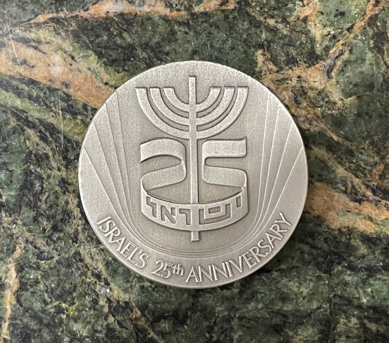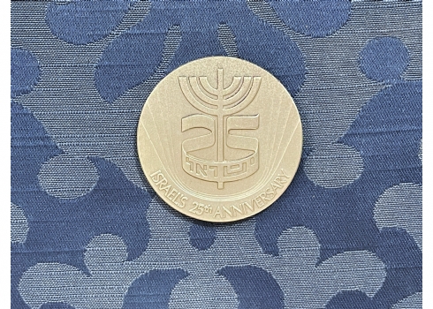 מדלית כסף ישראלית ישנה ליובל 25 למדינת ישראל, עשויה כסף '935', חתומה, משקל: 46.8 גרם, קוטר: 4.5 ס"מ.