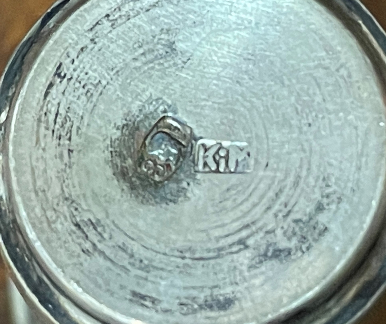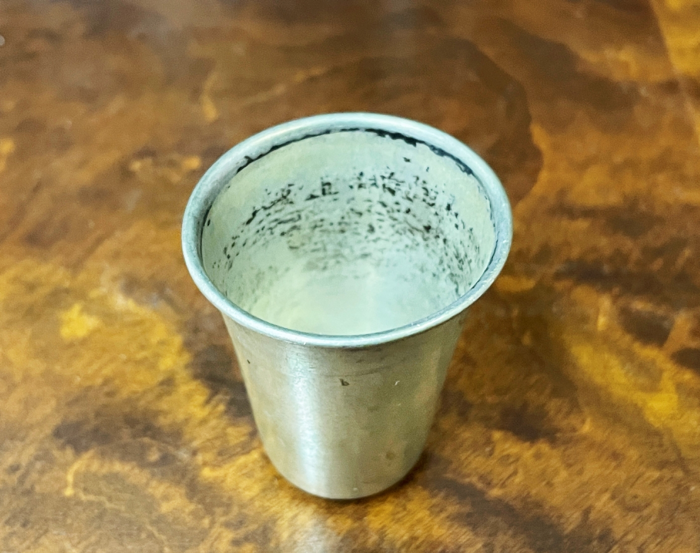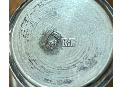 כוס כסף פולנית קטנה (וורשה), חתומה (1920-1931) ומעוטרת בחריטת יד עדינה, משקל: 13 גרם, קוטר המפתח העליון: 3.3 ס"מ, גובה: 4 ס"מ.