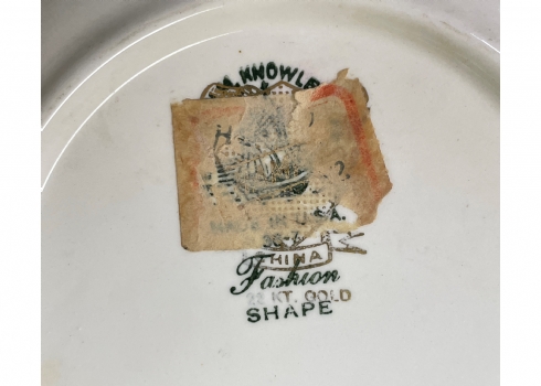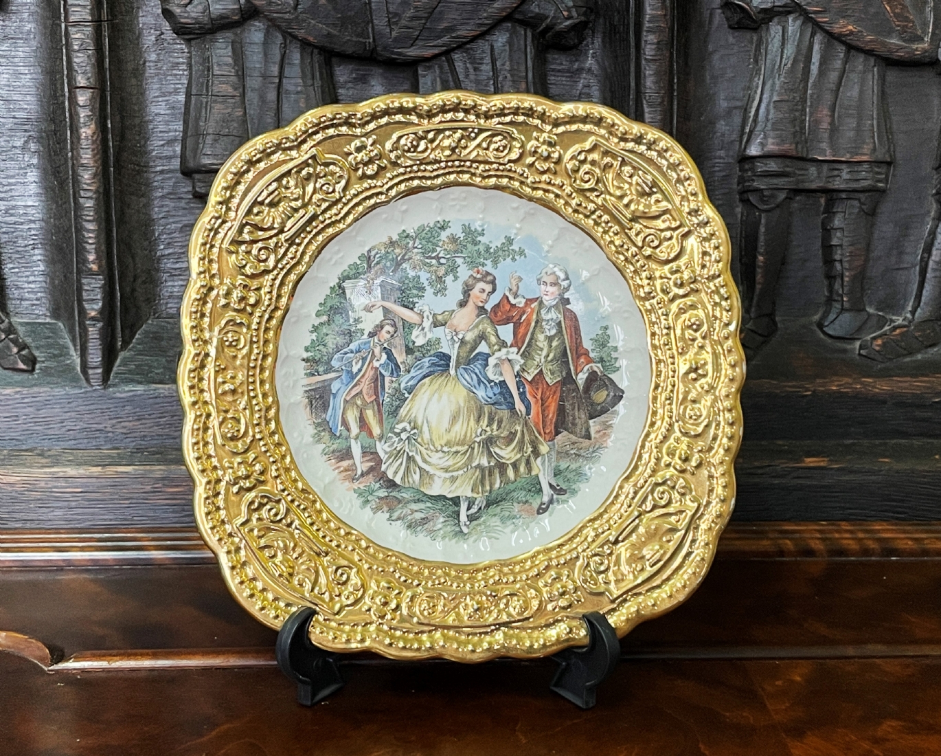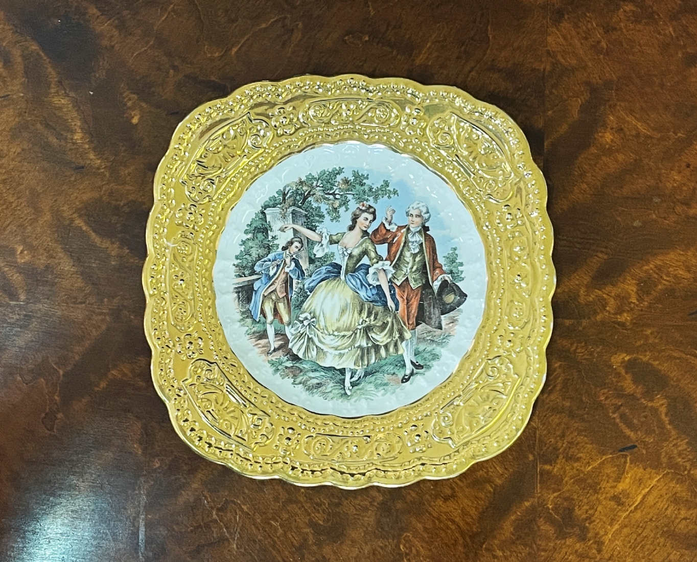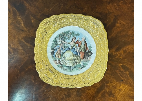 צלחת חרסינה ישנה ויפה, מעוטרת בהדפס של זוג אצילים ומעוטרת בזהב