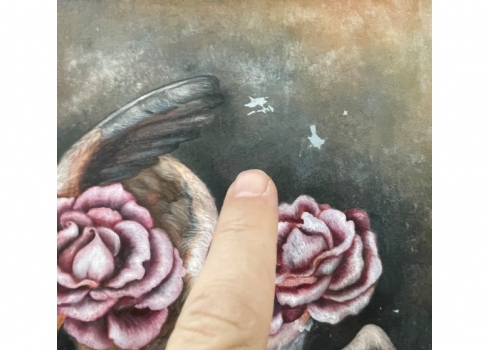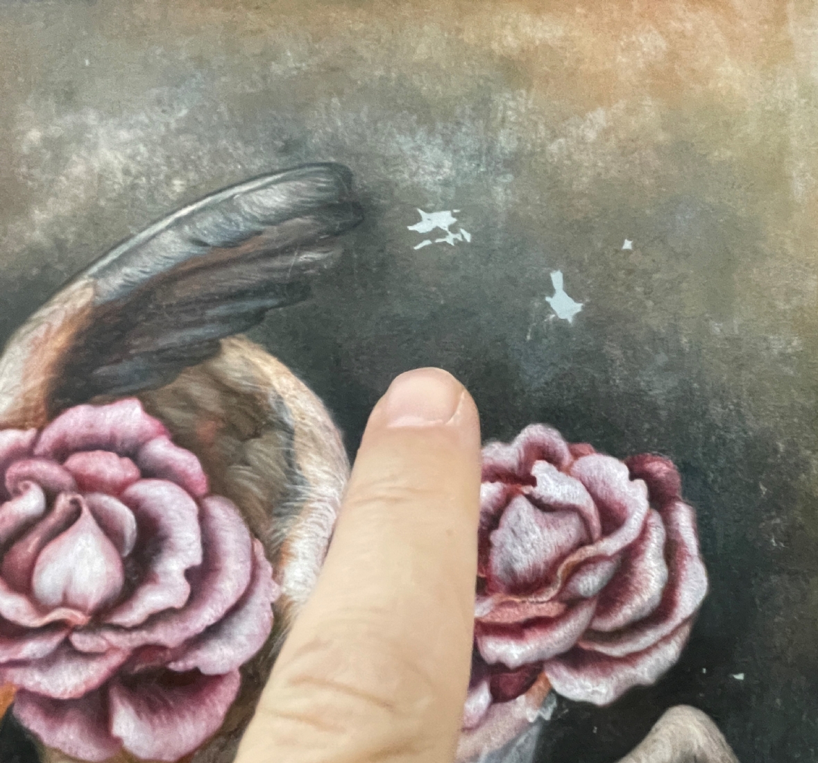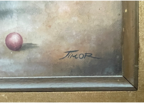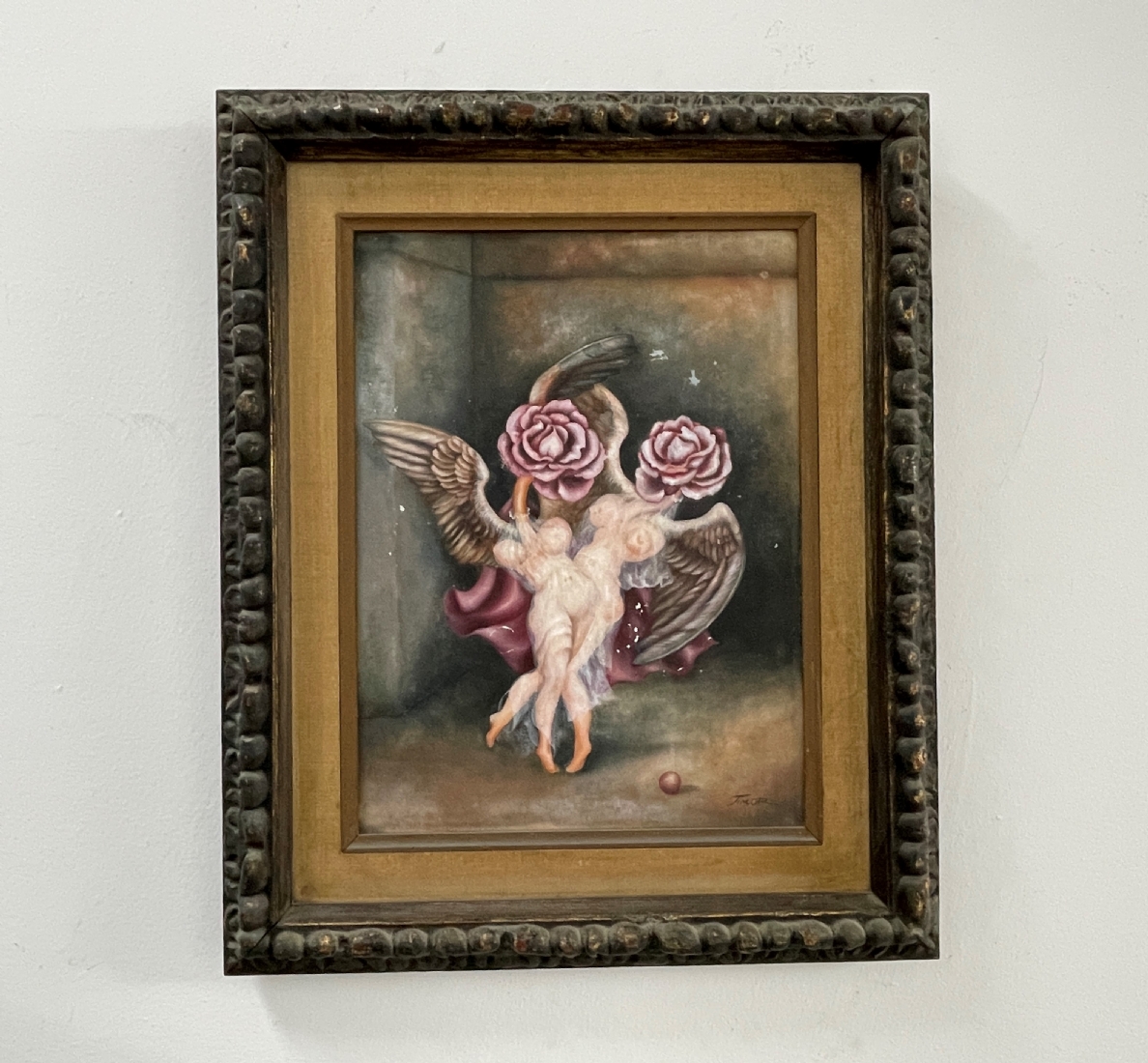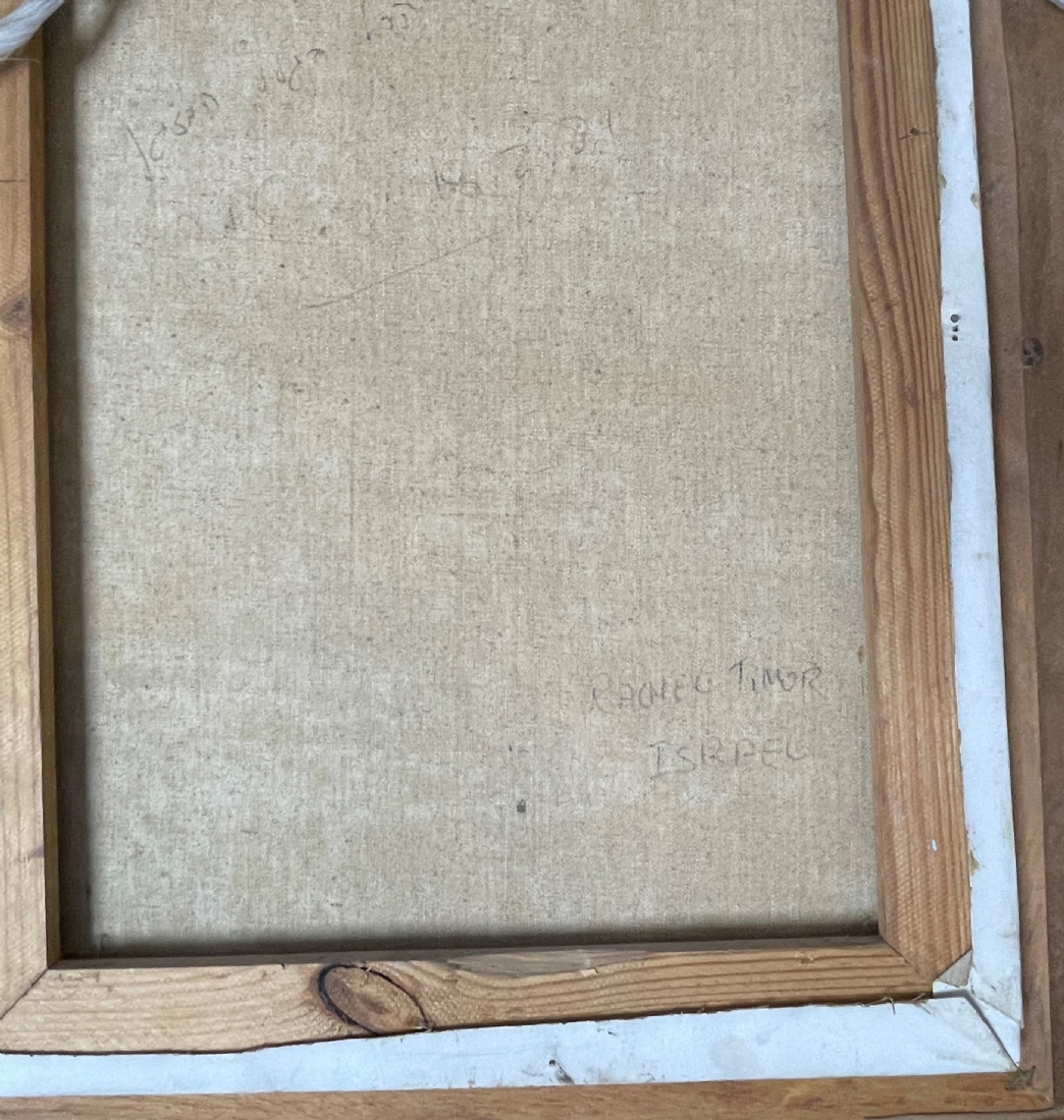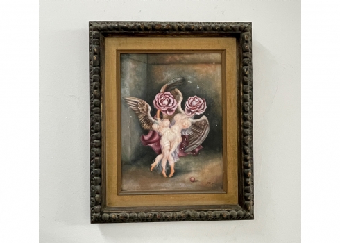 רחל טימור (Rachel Timor) - 'המלאכיות של שושנה' - ציור ישן, שמן על בד, חתום, קילופי צבע, מידות: 40X30 ס"מ.