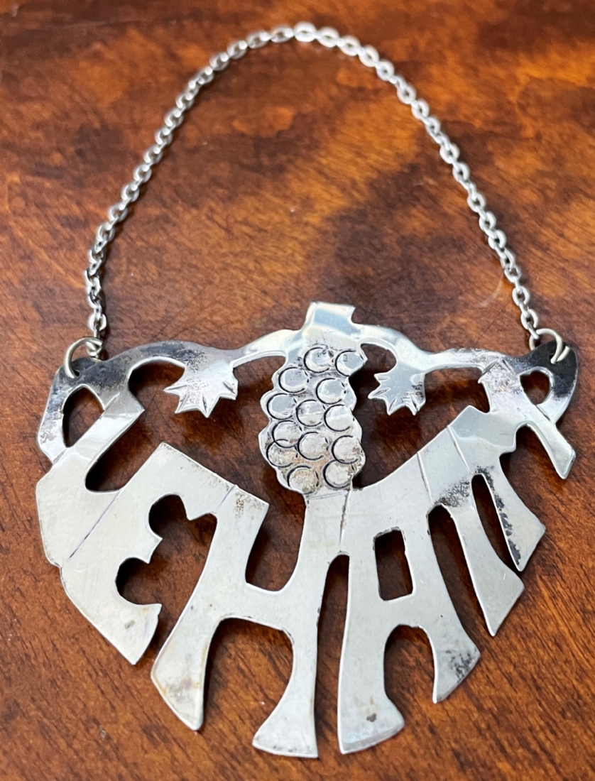 תוית כסף לבקבוק יין, עשויה כסף 'סטרלינג' (925), חתום, מעוצבת כמילה: Lehaim