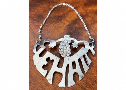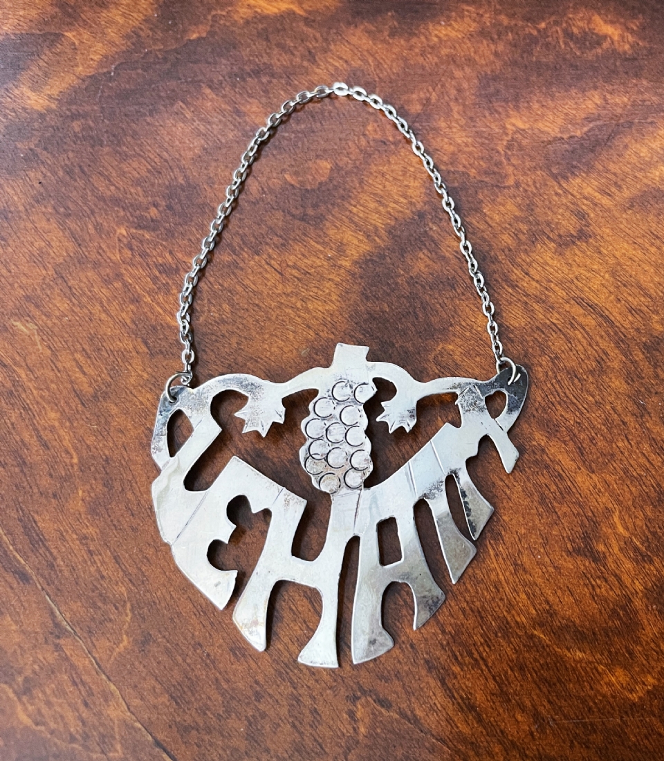 תוית כסף לבקבוק יין, עשויה כסף 'סטרלינג' (925), חתום, מעוצבת כמילה: Lehaim (לחיים), משקל: 5 גרם, גובה כולל שרשרת התליה: 9 ס"מ, רוחב: 5.5 ס"מ.