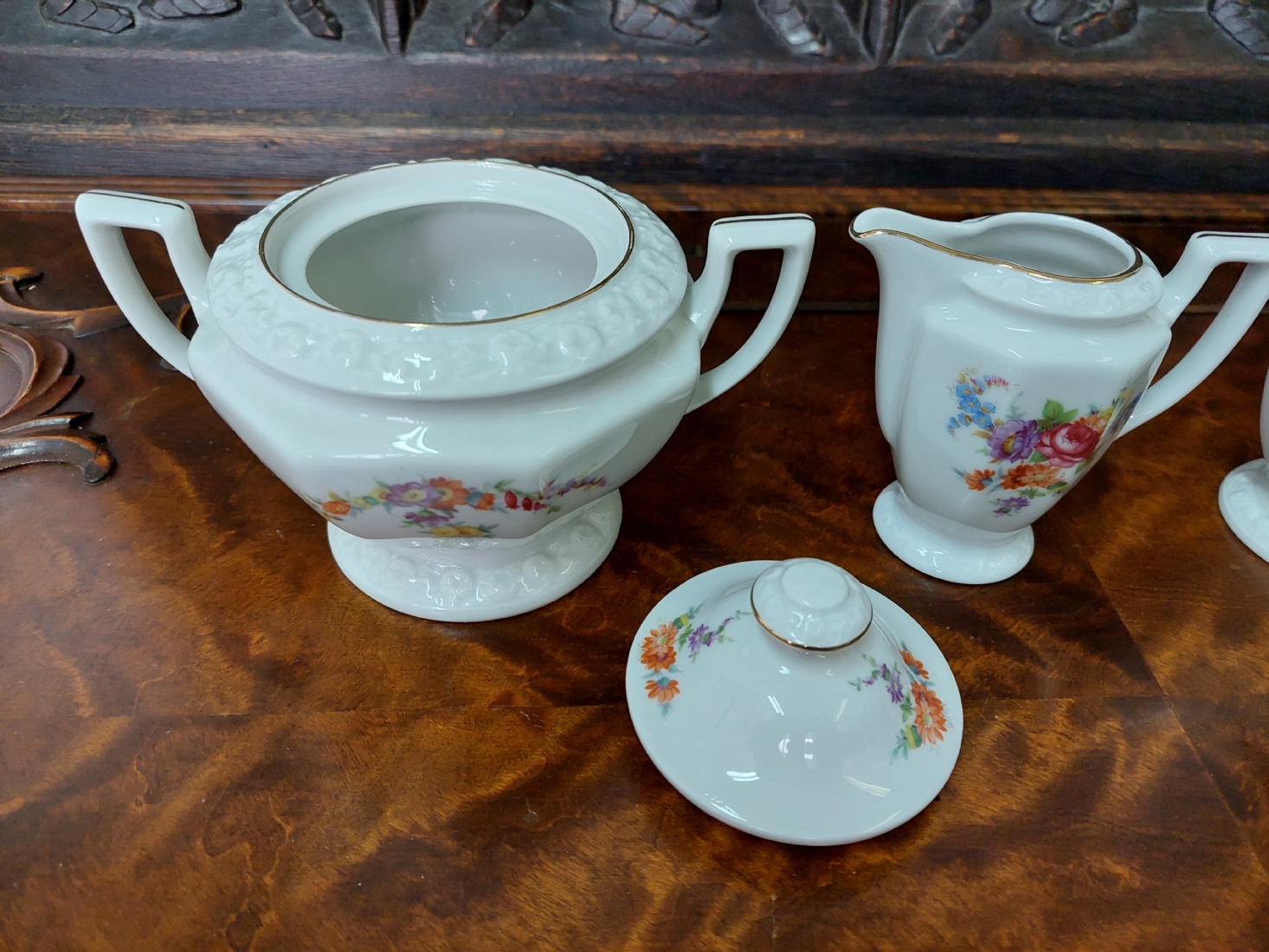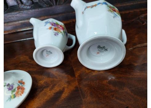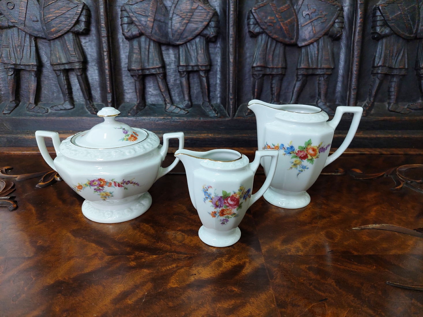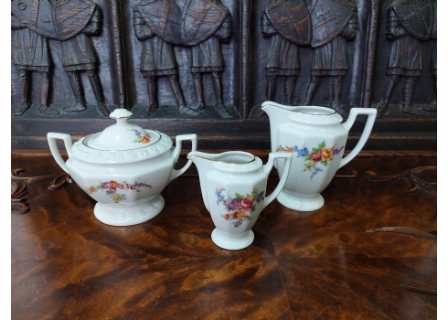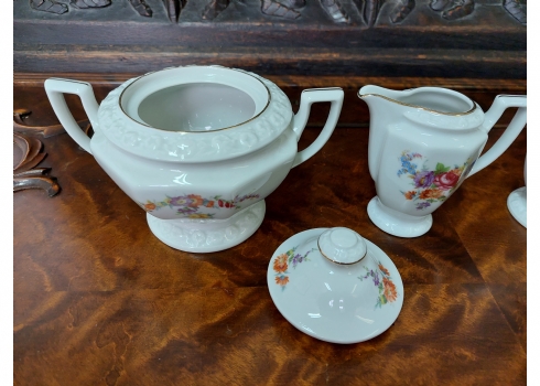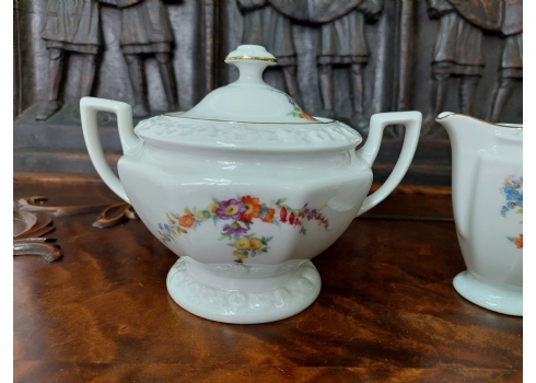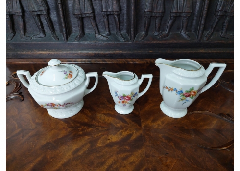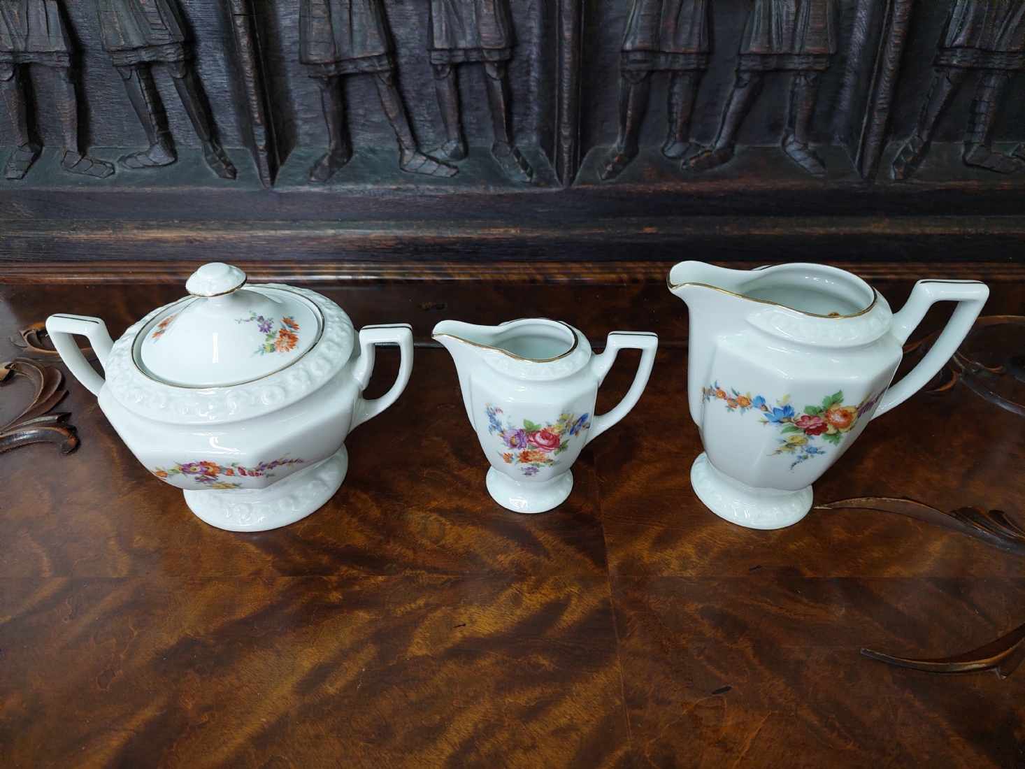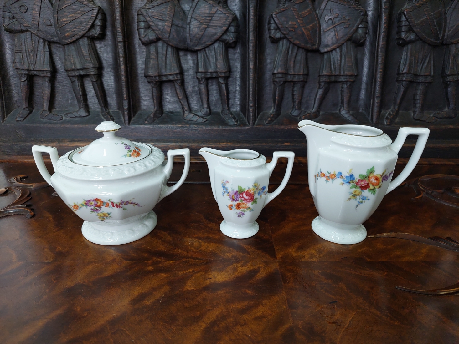 סט של 3 כלי הגשה גרמנים לסוכר, חלב ושמנת, מתוצרת: 'רוזנטל' (Rosenthal), דגם 'מריה', חתום, מעוטרים בהדפס פרחוני ובזהב, רוחב הכלי לסוכר כולל ידיות: 18 ס"מ, גובה כולל מכסה: 14 ס"מ, גובה קנקן השמנת הקטן: 10.5 ס"מ, גובה קנקן החלב: 13.5 ס"מ.