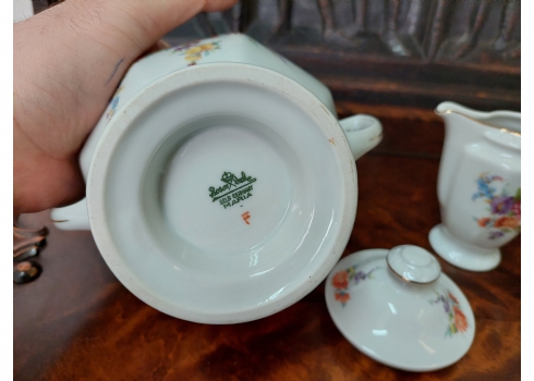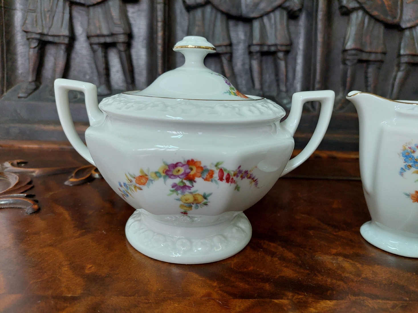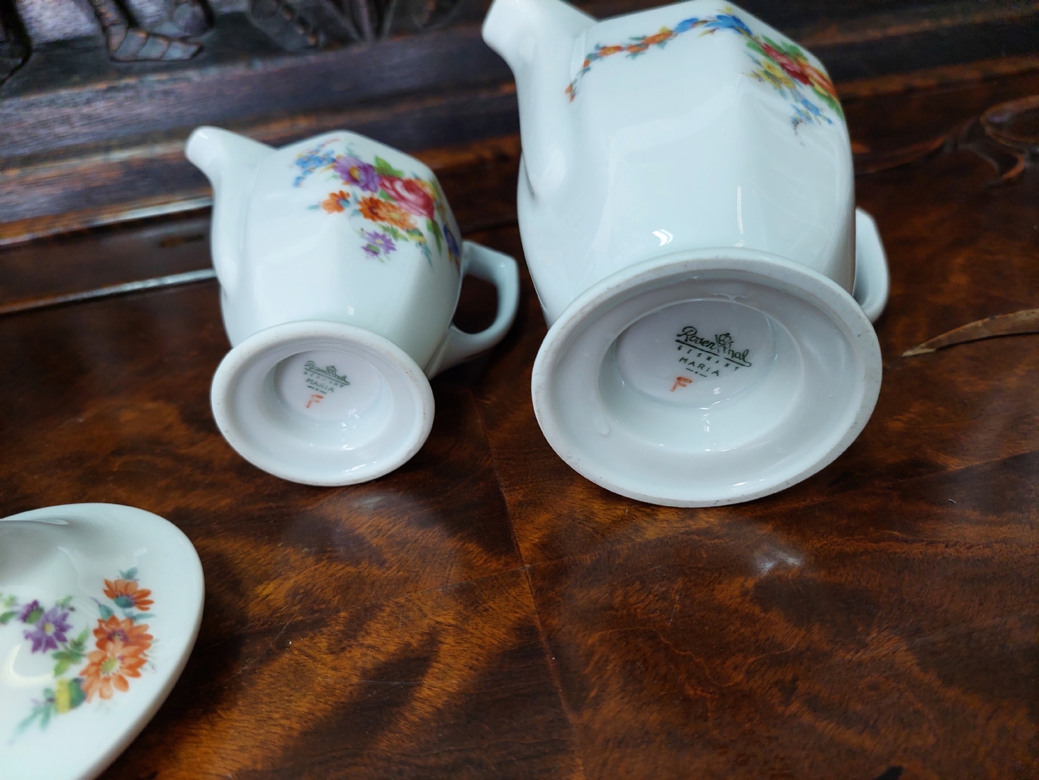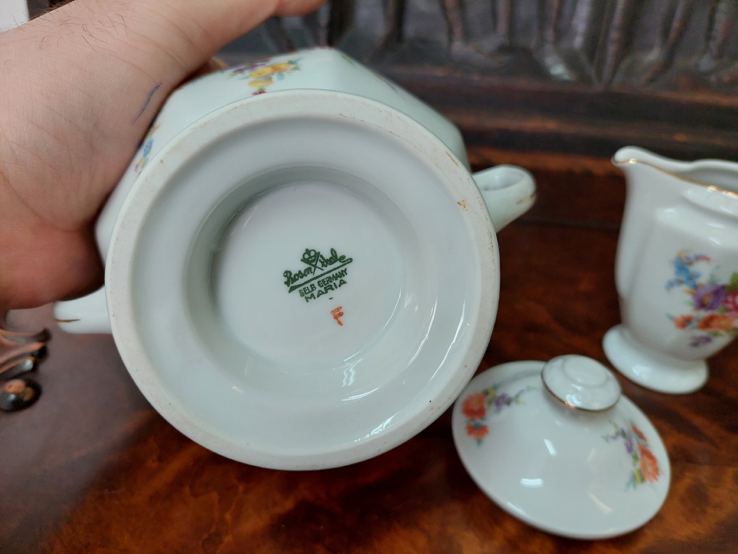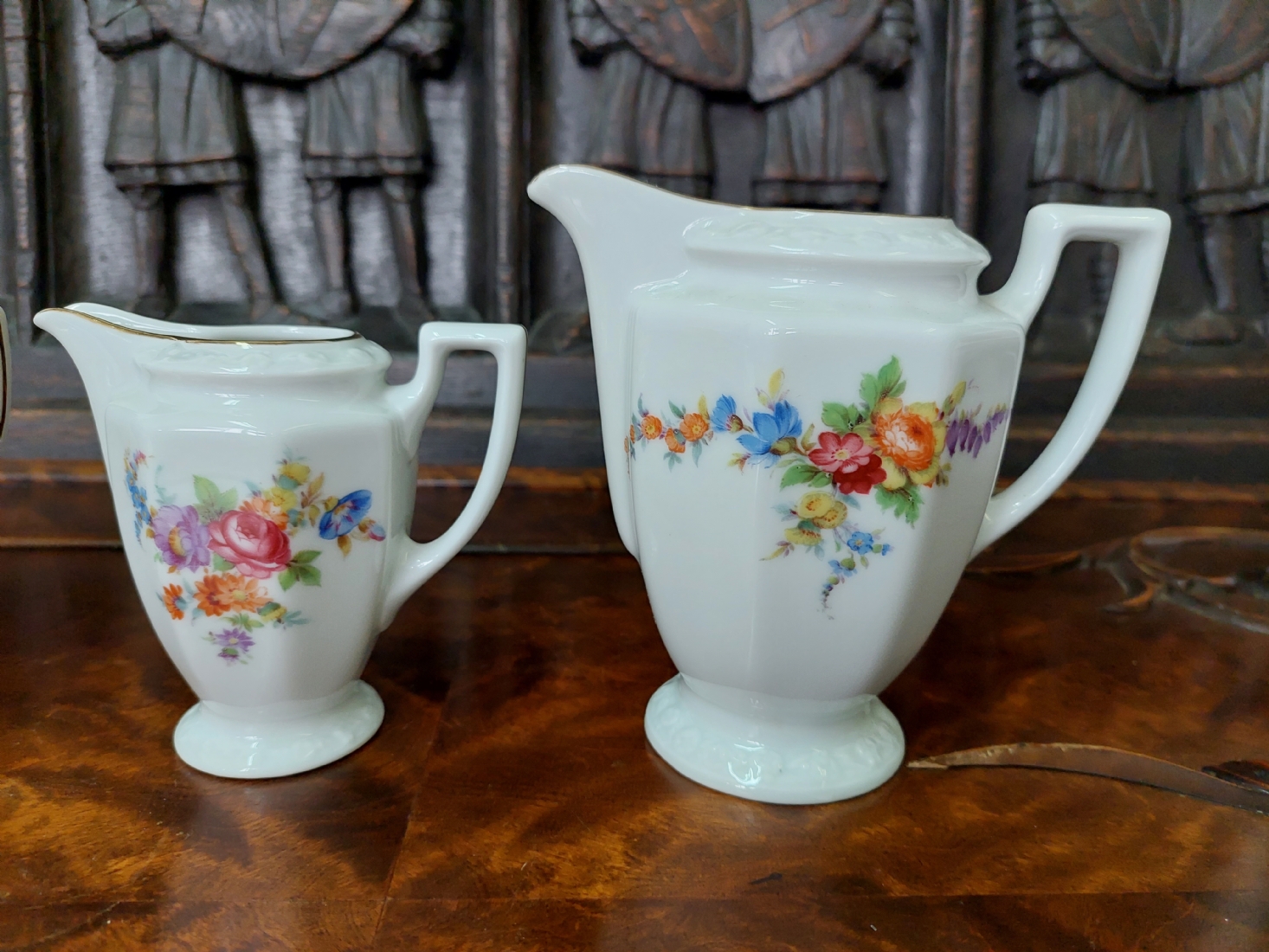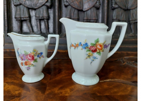 סט של 3 כלי הגשה גרמנים לסוכר, חלב ושמנת, מתוצרת: 'רוזנטל' (Rosenthal), דגם 'מריה', חתום, מעוטרים בהדפס פרחוני ובזהב, רוחב הכלי לסוכר כולל ידיות: 18 ס"מ, גובה כולל מכסה: 14 ס"מ, גובה קנקן השמנת הקטן: 10.5 ס"מ, גובה קנקן החלב: 13.5 ס"מ.